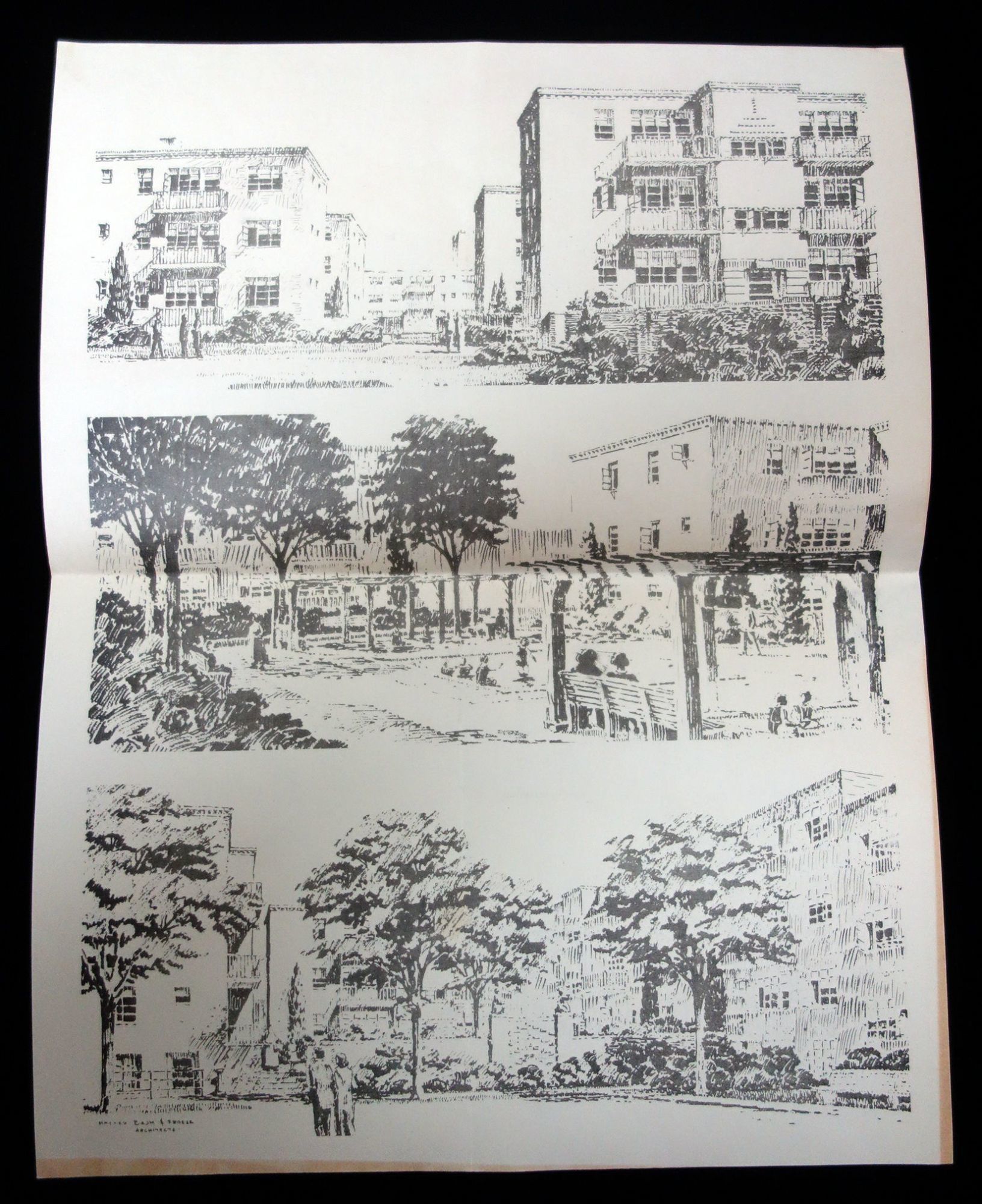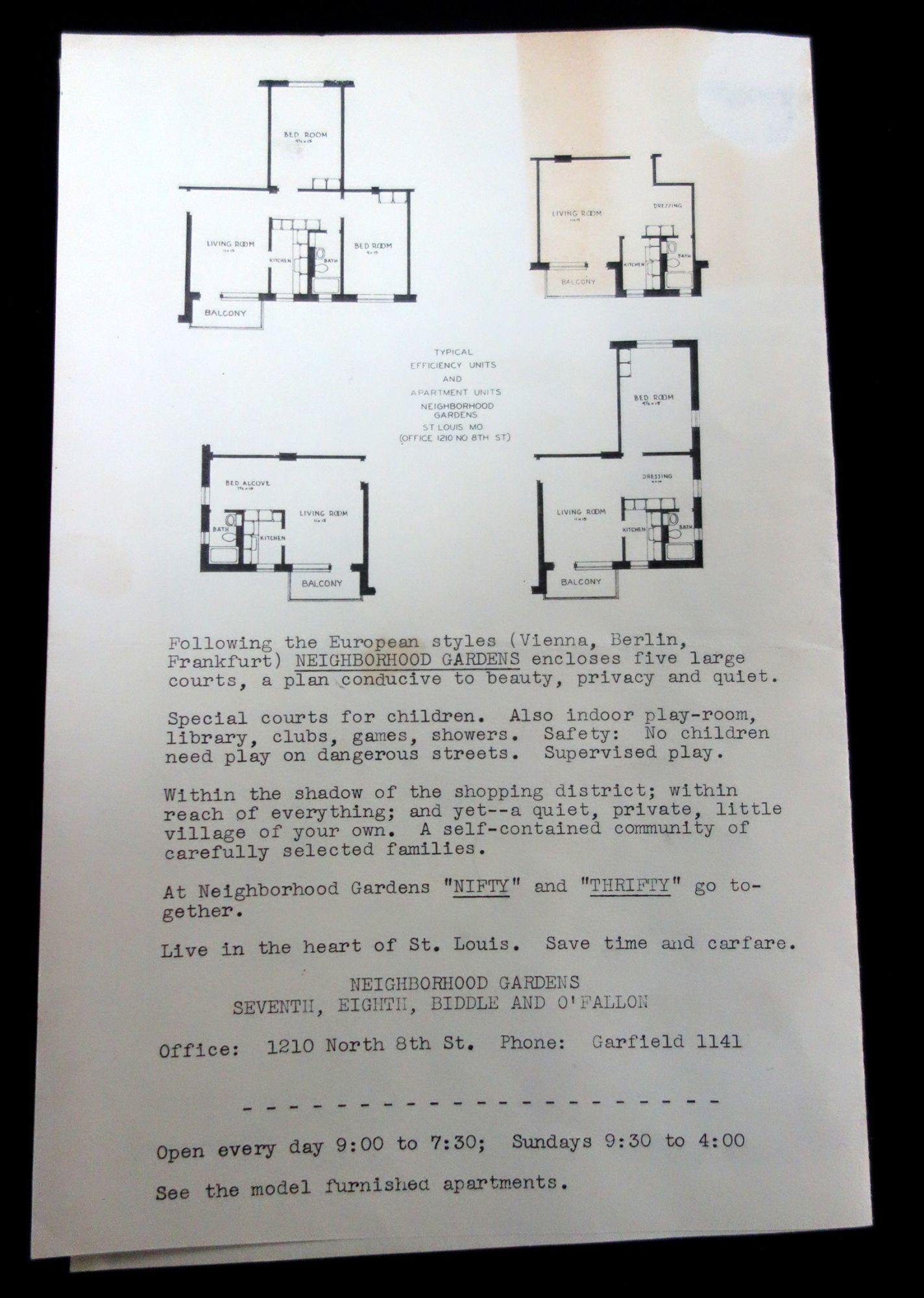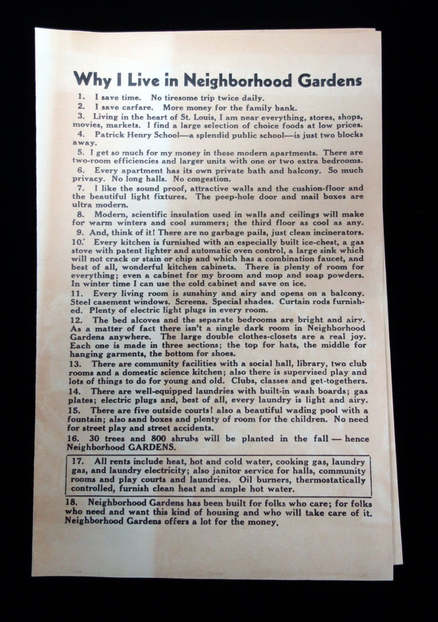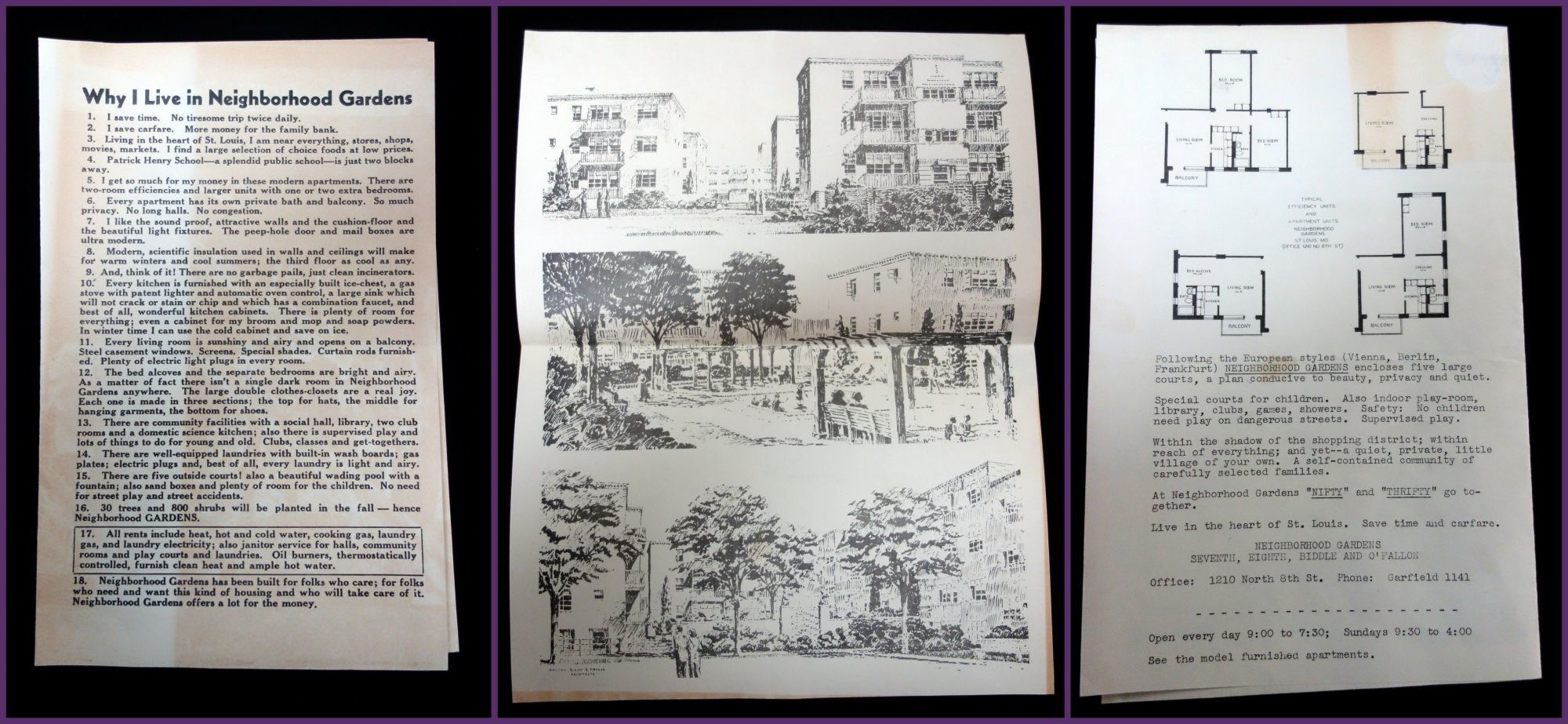 St. Louis, MO: Neighborhood Gardens Apartments, 1935. General wear. Light damage.. This single fold pamphlet advertises for the Neighborhood Gardens which is an apartment complex located in St. Louis that was first built in 1935, and is still an existence today. The front page of this pamphlet lists eighteen (18) reasons why someone would want to live there, such as: "I get so much for my money in these modern apartments", "I like the sound proof, attractive walls", "every living room is sunshinny [sic] and airy and opens on a balcony," and "Neighborhood Gardens has been built for folks who care; for folks who need and want this kind of housing." The inside of the pamphlet has three black and white printings of linoleum cuts of the exteriors of the apartment complex. The back side has four floor plans of some of the apartments available along with a list of the amenities at the complex and what is in the local neighborhood. Single fold. Black and white. Measures 8 1/2" x 5 1/2" (folded), 11" x 8 1/2" (unfolded).