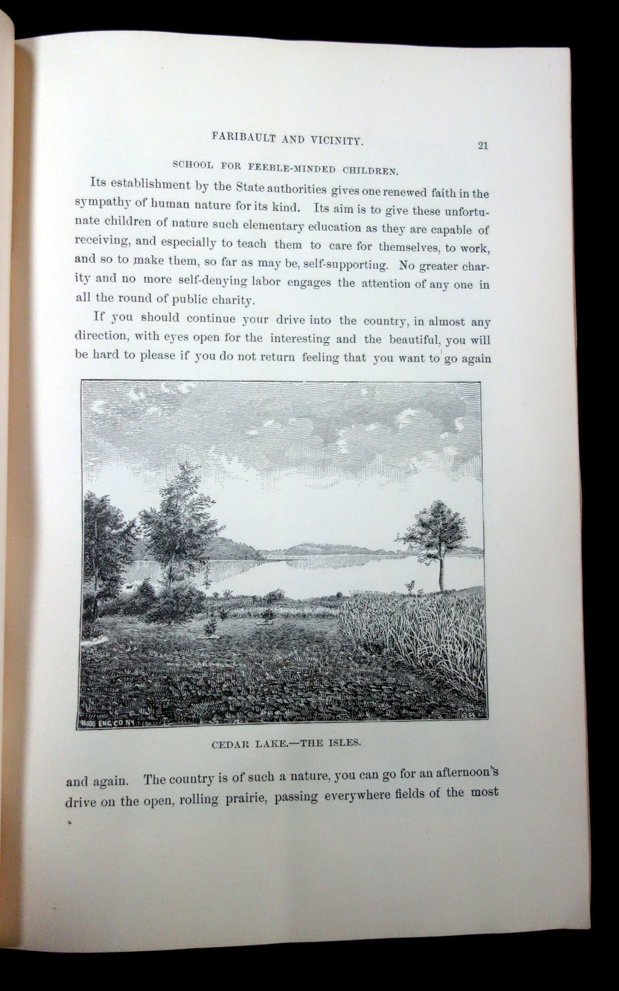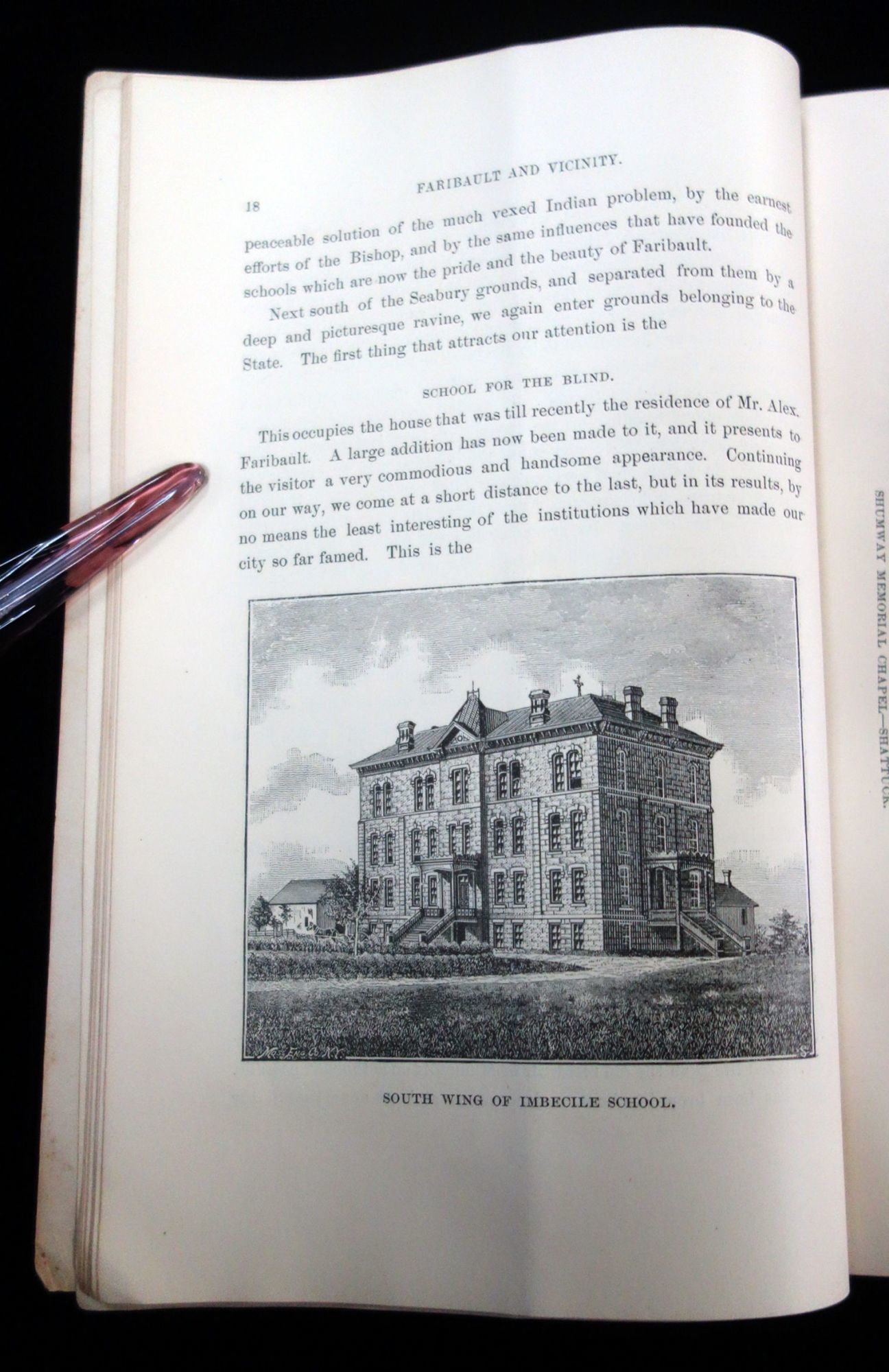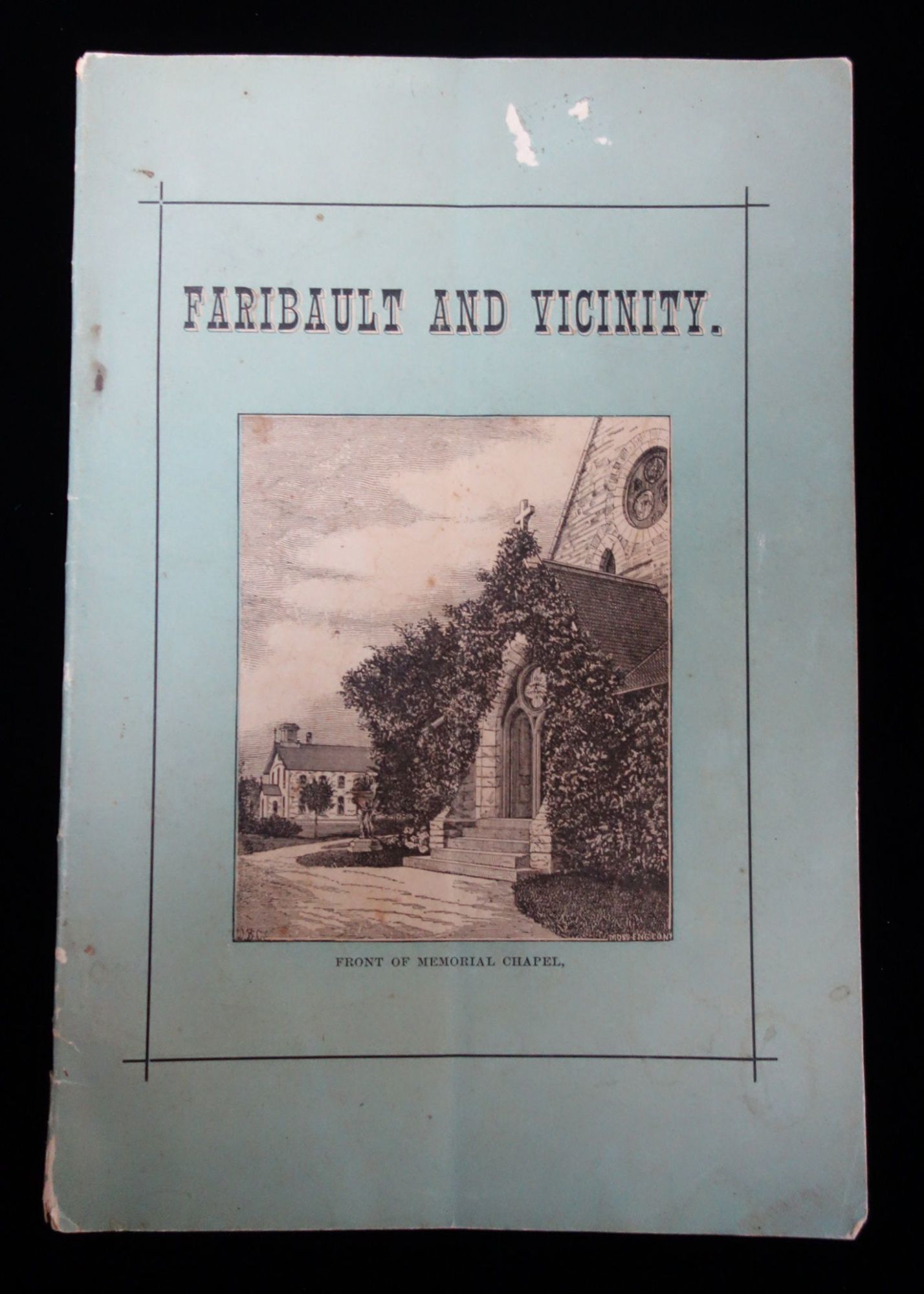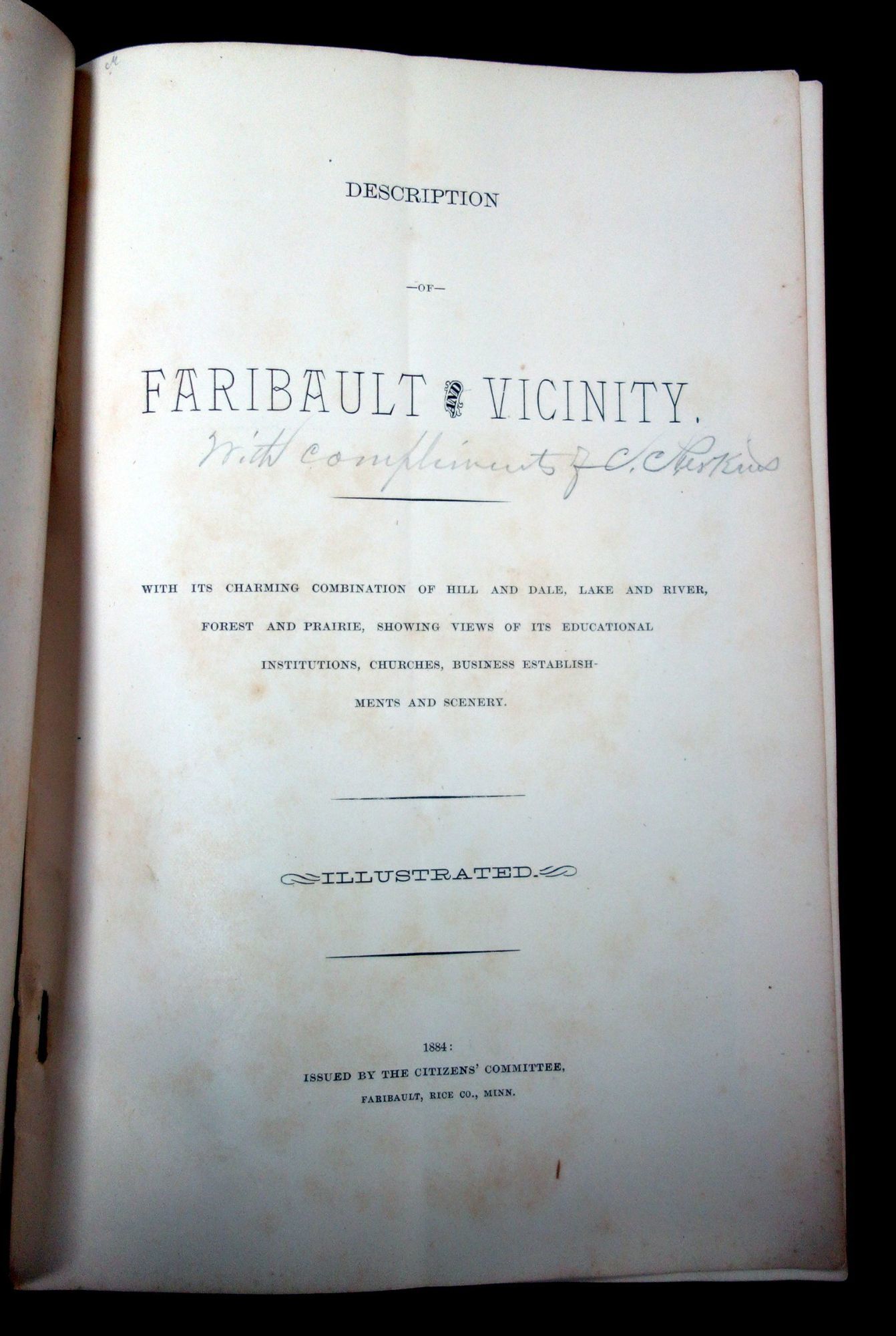 Faribault, MN: Citizen's Committee, 1884. General wear, with minor stains.. A tourism booklet for the town of Faribault in Minnesota, which is approximately 50 miles south of Minneapolis. It is described as having a "charming combination of hill and dale, lake and river, forest and prairie, showing views of it's educational institutions, churches, business establishments and scenery." The booklet starts by giving a brief history of the town, before continuing on to describe its institutions. Faribault has a large selection of schools, such as Shattuck St. Mary's (a prestigious boarding school still in existence today), State Institution for the the Deaf and Dumb, School for Feeble-Minded Children, School for the Blind, and Seabury Divinity School. Also described are several town government buildings and local business like the Court House, Rail Road Station, Faribault Foundry and Windmill Company, lime stone quarry, and Brunswick Hotel. There are also several scenic locations, such as Cedar Lake, Roberd's Lake, Linden Park, Cannon Lake, and Sergeant's Bay. The booklet ends with a section that briefly describes the town's "aboriginal inhabitants" before listing the statistics of the county. Included in the booklet are numerous black and white engravings of the buildings and surrounding area, of which the majority are full page illustrations. All the illustrations come with captions, and of note, is that one caption for an engraving has not age well, for beneath a picture of the School for Feeble-Minded Children it reads, "South wing of Imbecile School". Written in pencil on the title page is "with compliments J. C. Perkins." Today Faribault is regarded as one of the most historic communities in Minnesota. 62 pages. Illustrated covers. Staple bindings. Measures 9" x 6"