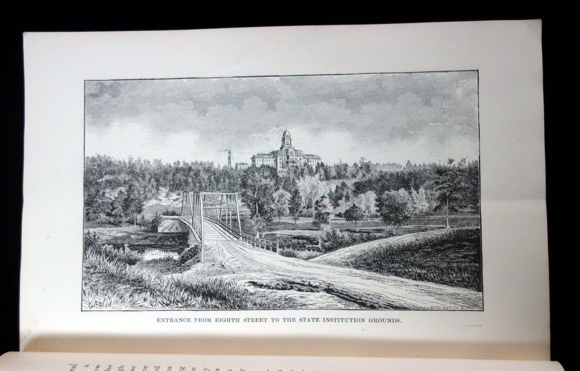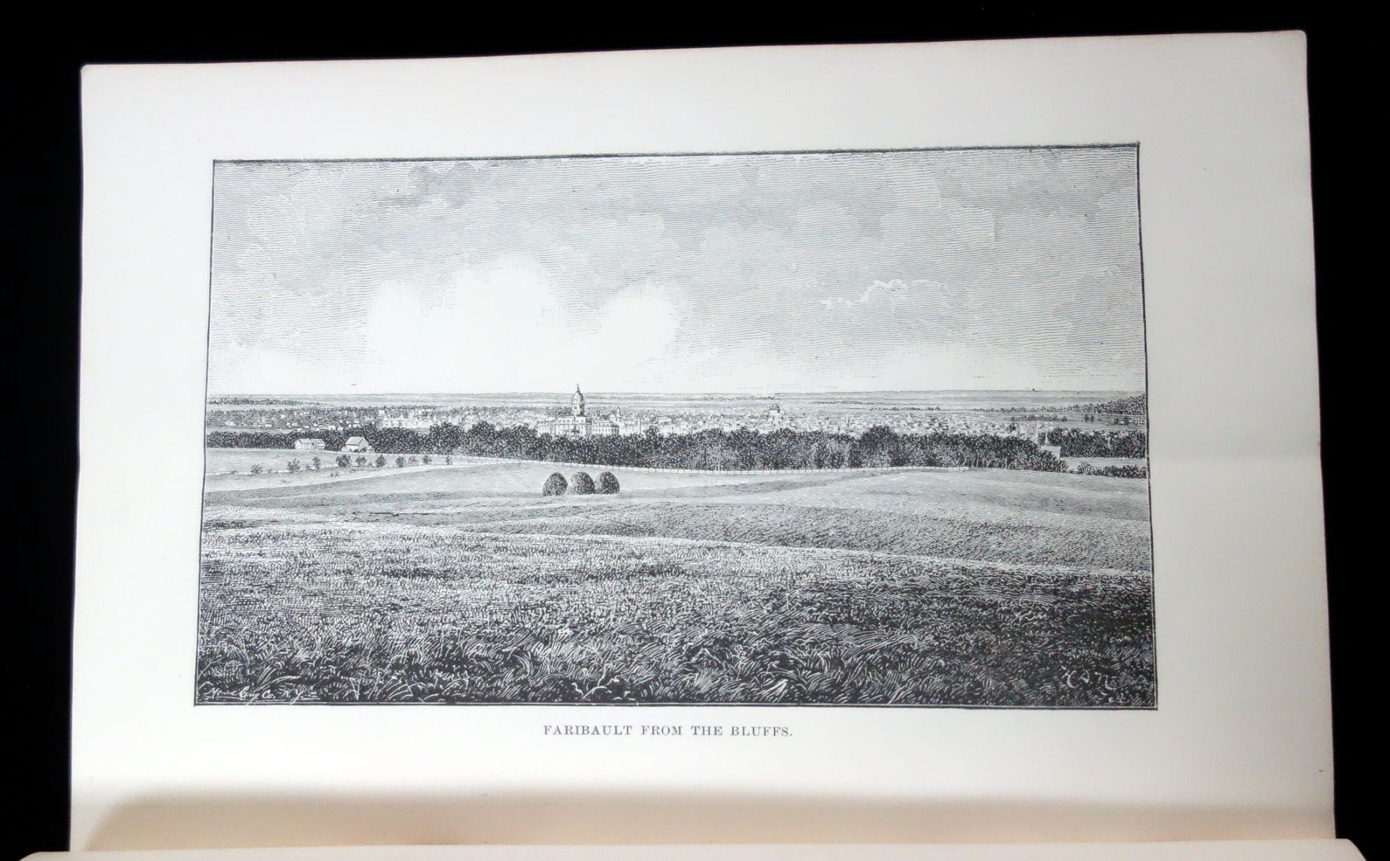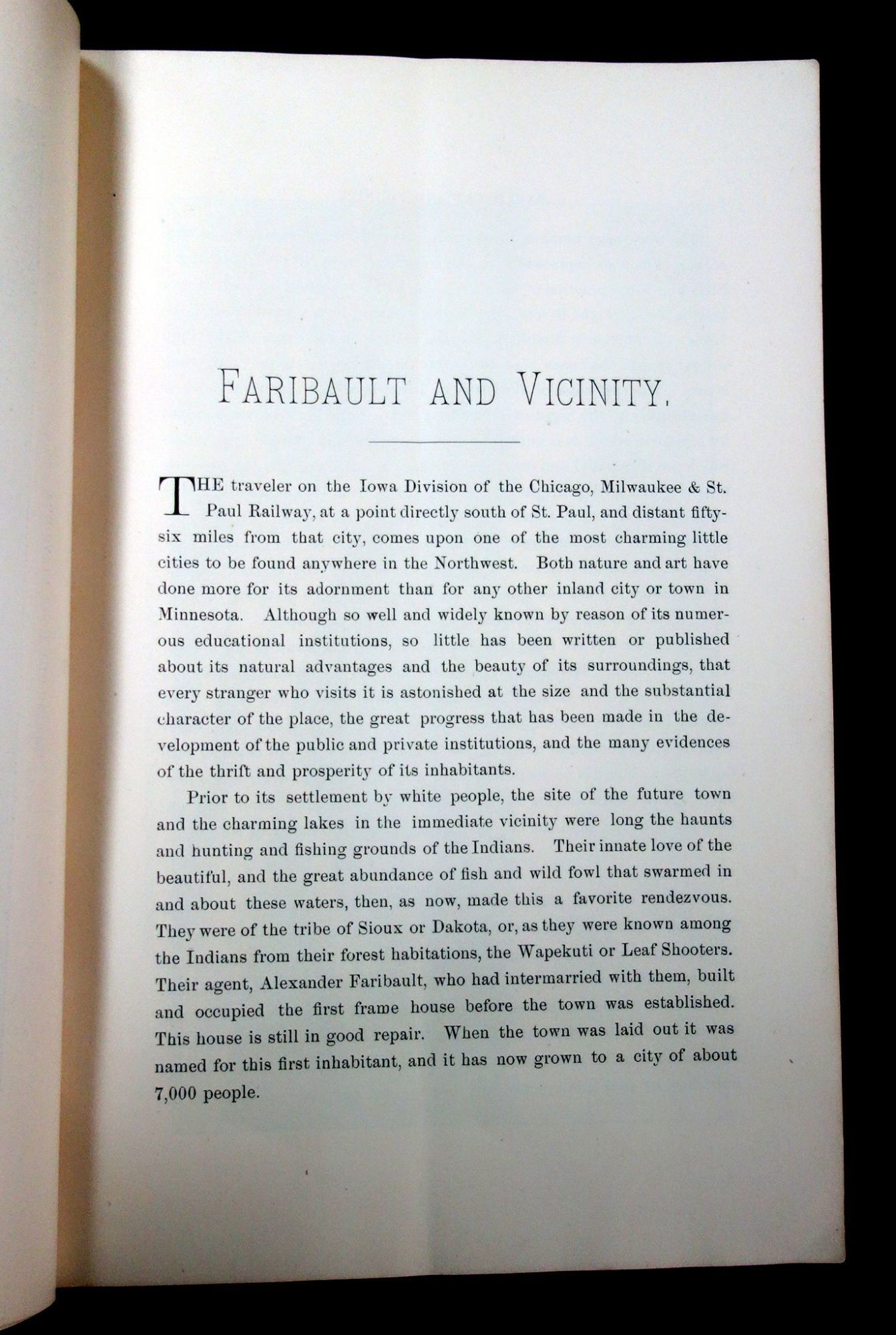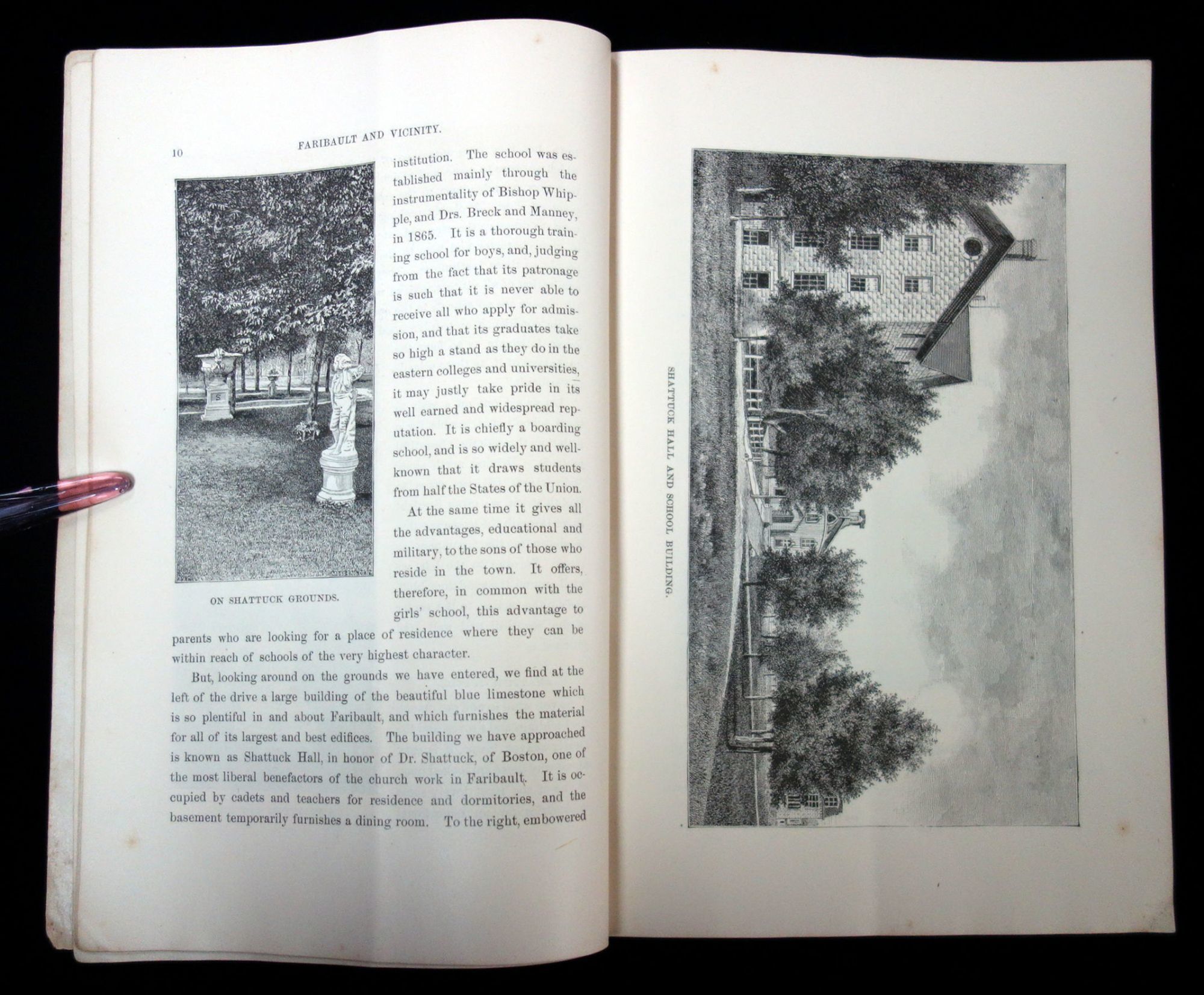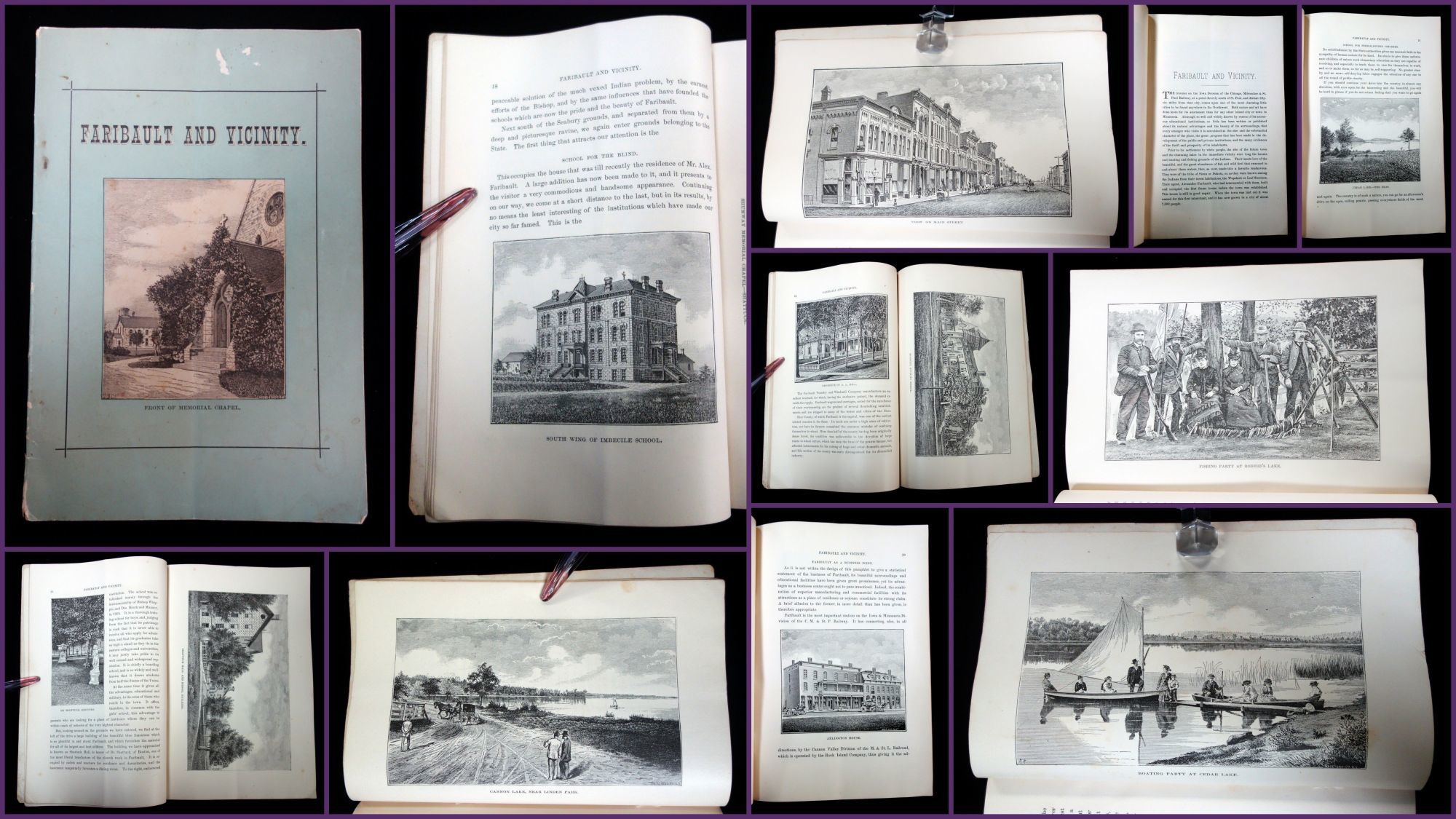 Faribault, MN: Citizen's Committee, 1884. General wear, with minor stains.. A tourism booklet for the town of Faribault in Minnesota, which is approximately 50 miles south of Minneapolis. It is described as having a "charming combination of hill and dale, lake and river, forest and prairie, showing views of it's educational institutions, churches, business establishments and scenery." The booklet starts by giving a brief history of the town, before continuing on to describe its institutions. Faribault has a large selection of schools, such as Shattuck St. Mary's (a prestigious boarding school still in existence today), State Institution for the the Deaf and Dumb, School for Feeble-Minded Children, School for the Blind, and Seabury Divinity School. Also described are several town government buildings and local business like the Court House, Rail Road Station, Faribault Foundry and Windmill Company, lime stone quarry, and Brunswick Hotel. There are also several scenic locations, such as Cedar Lake, Roberd's Lake, Linden Park, Cannon Lake, and Sergeant's Bay. The booklet ends with a section that briefly describes the town's "aboriginal inhabitants" before listing the statistics of the county. Included in the booklet are numerous black and white engravings of the buildings and surrounding area, of which the majority are full page illustrations. All the illustrations come with captions, and of note, is that one caption for an engraving has not age well, for beneath a picture of the School for Feeble-Minded Children it reads, "South wing of Imbecile School". Written in pencil on the title page is "with compliments J. C. Perkins." Today Faribault is regarded as one of the most historic communities in Minnesota. 62 pages. Illustrated covers. Staple bindings. Measures 9" x 6"