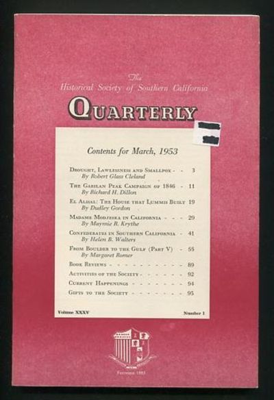 Los Angeles: Historical Society of Southern California. Very Good+. 1953. (Vol. XXXV, No. 1). Journal. [light browning to spine, no other significant wear, old price sticker (with information blacked-out) on front cover]. (B&W photographs) Contents: "Drought, Lawlessness and Smallpox," by Robert Glass Cleland; "The Gabilan Peak Campaign of 1846," by Richard H. Dillon; "El Alisal: The House That Lummis Built," by Dudley Gordon; "Madame Modjeska in California," by Maymie R. Krythe; "Confederates in Southern California," by Helen B. Walters; "From Boulder to the Gulf (Part V)," by Margaret Romer. .