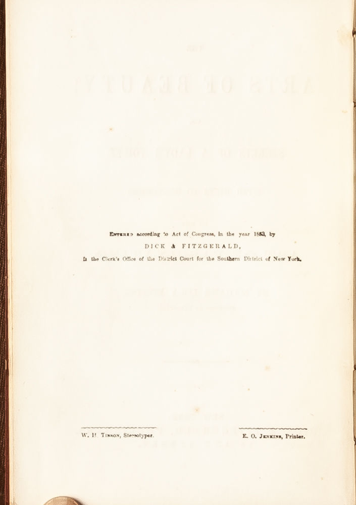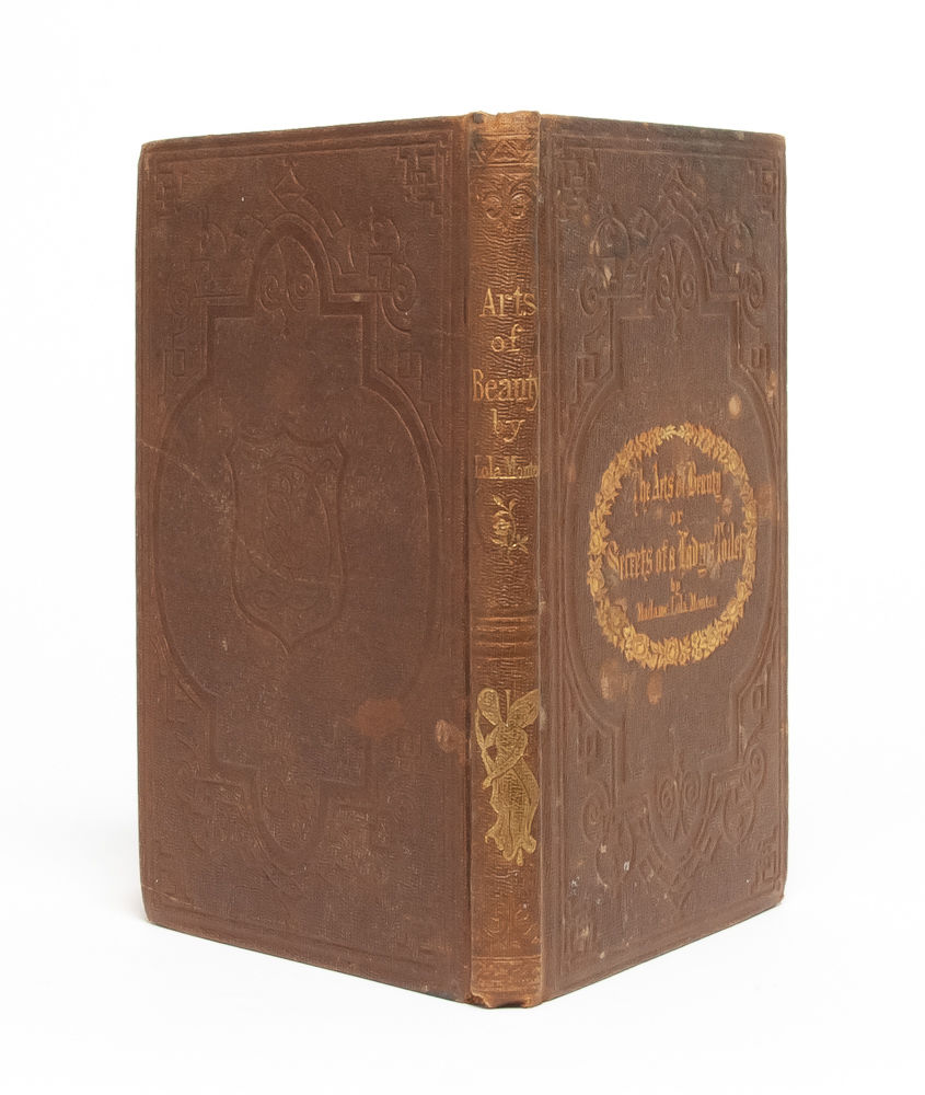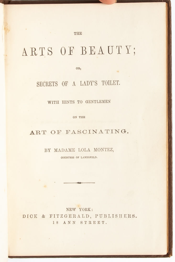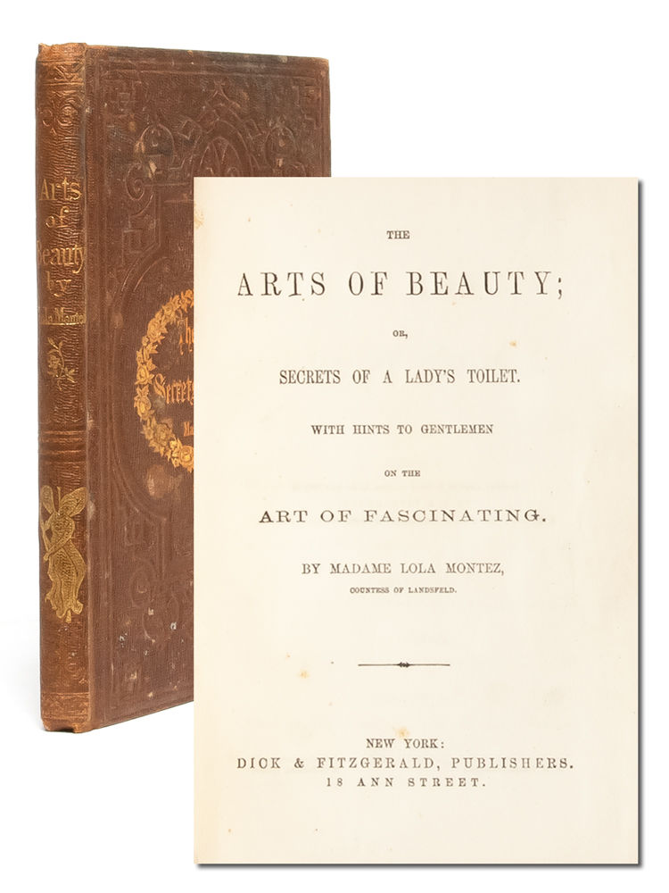 The infamous Lola Montez managed to fit multiple lives into one: actress and dancer, courtesan, mistress to King Ludwig I of Bavaria, Countess of Landsfeld, and finally revolution-era emigree to California. In each of these roles, she relied on a finely honed sense of social diplomacy and wit to accomplish her ends; and The Arts of Beauty is the perfect textual product to encapsulate these skills. Engaging with classical satirical texts like Ovid's Ars Amatoria as well as contemporary conduct guides penned by men for the "benefit" of women, Montez composes a manual that is part informative beauty instructor and part parody. The Greek and Roman sources she references point to her intellectual depth and position of authority -- on the first page of the preface alone appear names and quotations from Aristotle, Juvenal, Socrates, and Theophrastus -- but they are also used to set the cheeky tone of the work. "When Aristotle was asked why everyone was so fond of beauty, he replied 'It is the question of a blind man.'" Fully aware that a woman's success was often bound to both her ability to physically and mentally fascinate men, Montez sets an example for her reader while also providing practical information on how to maintain a beautiful figure, overcome blemishes, dress to best advantage, and socially comport oneself. The Arts of Beauty are thus more than cosmetic -- they are power. Like Ovid before her, Montez also can't help but direct her book toward both sexes. Why should men not concern themselves as well with performing? To this end she provides a hilariously misguided series of 50 recommendations on how men can make themselves attractive to women. "Rule the Thirteenth. If you invite a lady to the theatre, neglect not to leave her, and go out to drink with your male friends between each act, as this will show her that you have confidence that she can protect herself... Rule the Twenty Second. Should you invite a lady out to supper you must, by all means, order three times as much expensive dishes as it will be possible for you to eat, as this will show her that you have a generous disregard for money...which will convince her your wife will never want." Ultimately, Montez's dedication is the most honest moment of the text, inviting readers to be in not only on the joke of the book, but on the true lessons that underlie it: "To all Men and Women of every land, who are not Afraid of Themselves, who trust so much in their own souls that they dare to stand up in the might of their own Individuality to meet the tidal currents of the World, this book is respectfully dedicated." Near Fine.