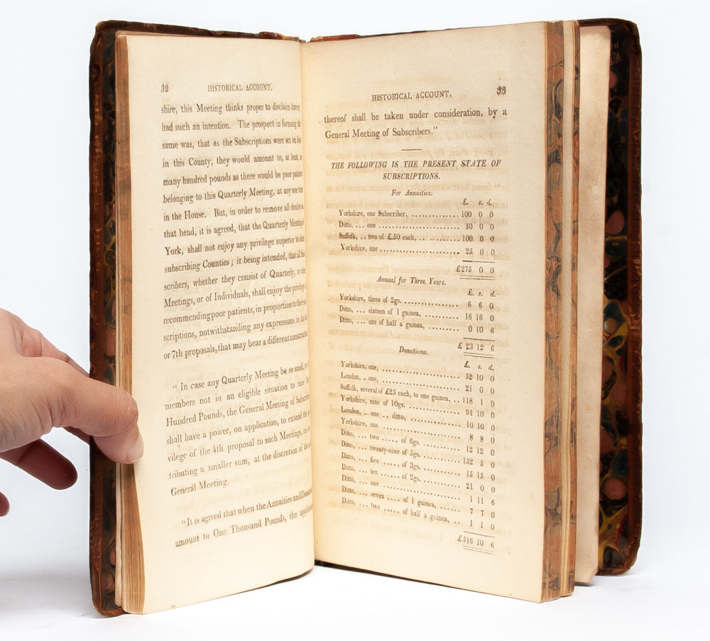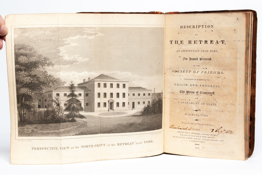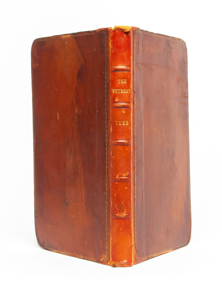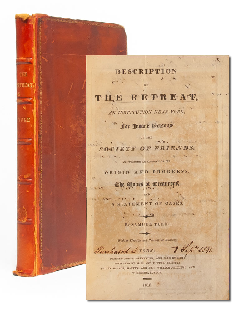 York: W. Alexander, 1813. First octavo edition. Octavo (leaves 129 x 210 mm). There was also a quarto edition in 1813, generally described as a large-paper copy. Collating: xx, 227, [1 page errata]; complete including frontis and two folding plates. Contemporary calf rebacked to style with gilt and five raised bands to spine. Generally a bit shelfworn and rubbed, but a tight, square copy. All edges marbled. Marbled endpapers. Armorial bookplate to front pastedown. Original owner's notes on recto and verso of title page in ink: "Purchased at...8 Sept 1821. Visited the Retreat Saturday aftern., 8 September 1821...with cleanly appearance & admirable arrangement of buildings, the Inmates looked far happier than could have been expected. The Matron & her husband have the most benevolent countenances that we had ever beheld." Light scattered foxing throughout, else unmarked. An account of the groundbreaking work of the Tuke family and the Society of Friends for improving the care and dignity with which mental illness was treated.