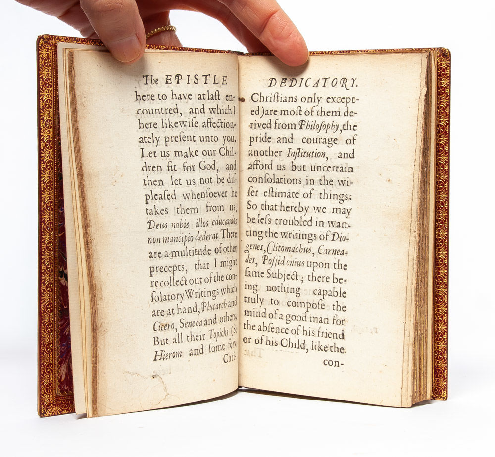 London: B.M. for G. Bedel and T. Collins, 1659. First edition. Twelvemo measuring 90 x 140mm (pages). Collates complete: [48], 90, [6]. Internally a pleasing copy, trimmed a bit close along the header but always retaining the page number and running titles. Small closed tear to lower margin of A6; some light marginal soiling on occasion, not affecting text. Several examples of contemporary ink marginalia and manicules. Finely bound in full red morocco with gilt to spine and boards; all edges gilt. Marbled endpapers. Bookplates of John Lawson and Anthony Fair to front pastedown. A scarce and early work on the social education, the present is the only copy on the market. ESTC records 12 copies, with only five of those in North America.