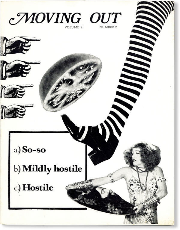 Detroit: Moving Out / Wayne Women's Liberation, 1972. First Edition. Quarto (28cm); glossy, photo-illustrated card wrappers; 119,[3]pp; illus. Light wear and a touch of dustiness to wrapper extremities, else a fresh, Near Fine copy. Well-preserved copy of this pioneering Detroit-based literary journal, produced by the Wayne Women's Liberation (out of Wayne State University), a cooperative of women and "a recognized campus organization...engaged in a variety of activities; rap groups; publications; setting up a library and literature tables; and working for the repeal of abortion laws" (from introductory matter). Contents are comprised of feminist poetry, prose, and original artwork. While well-represented institutionally, individual issues are uncommon in commerce.