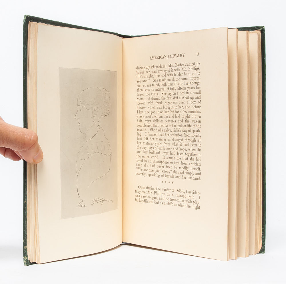 Boston: W. B. Clarke Company, 1913. First edition. Very Good +. Green publisher's cloth binding with bright gilt to spine and front board. Scattered rubbing to front board; small scuff to rear board. Tight and square. Internally clean and unmarked, containing 19 portraits, and 2 facsimile letters from Wendell Phillips and Joseph Twichell respectively. This copy presented by the author to activist and reformer Rev. Joseph Twichell, who was featured in the book and was part of a literary circle that included Mark Twain. Author's calling card affixed to the front endpaper with Twichell's annotation regarding the gift; two page Autograph Letter Signed from Wyman to Twichell affixed in transmittal envelope to front pastedown.