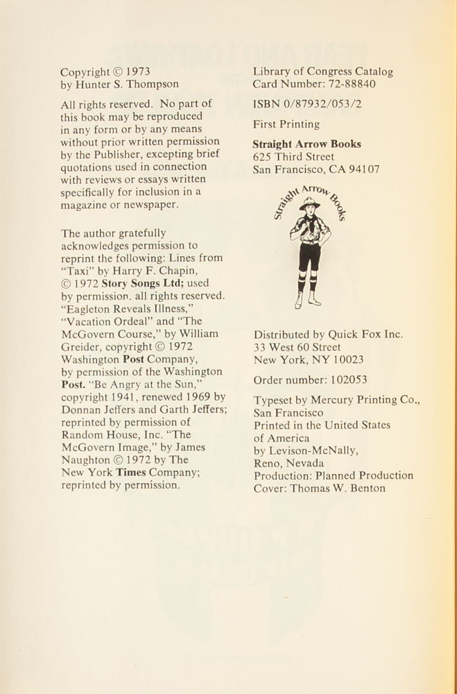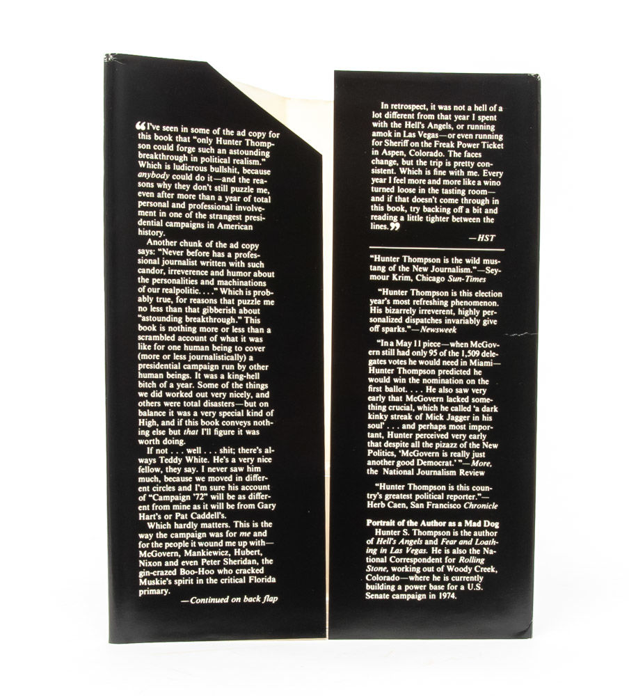 A classic look at American politics focusing on the 1971 Democratic Party primary process, by the inventor of Gonzo Journalism. Illustrated by Ralph Steadman, Thompson chronicles in his inimitable style both the rise of McGovern to the nomination and the nature of political reporting itself. Fine in Fine dust jacket.