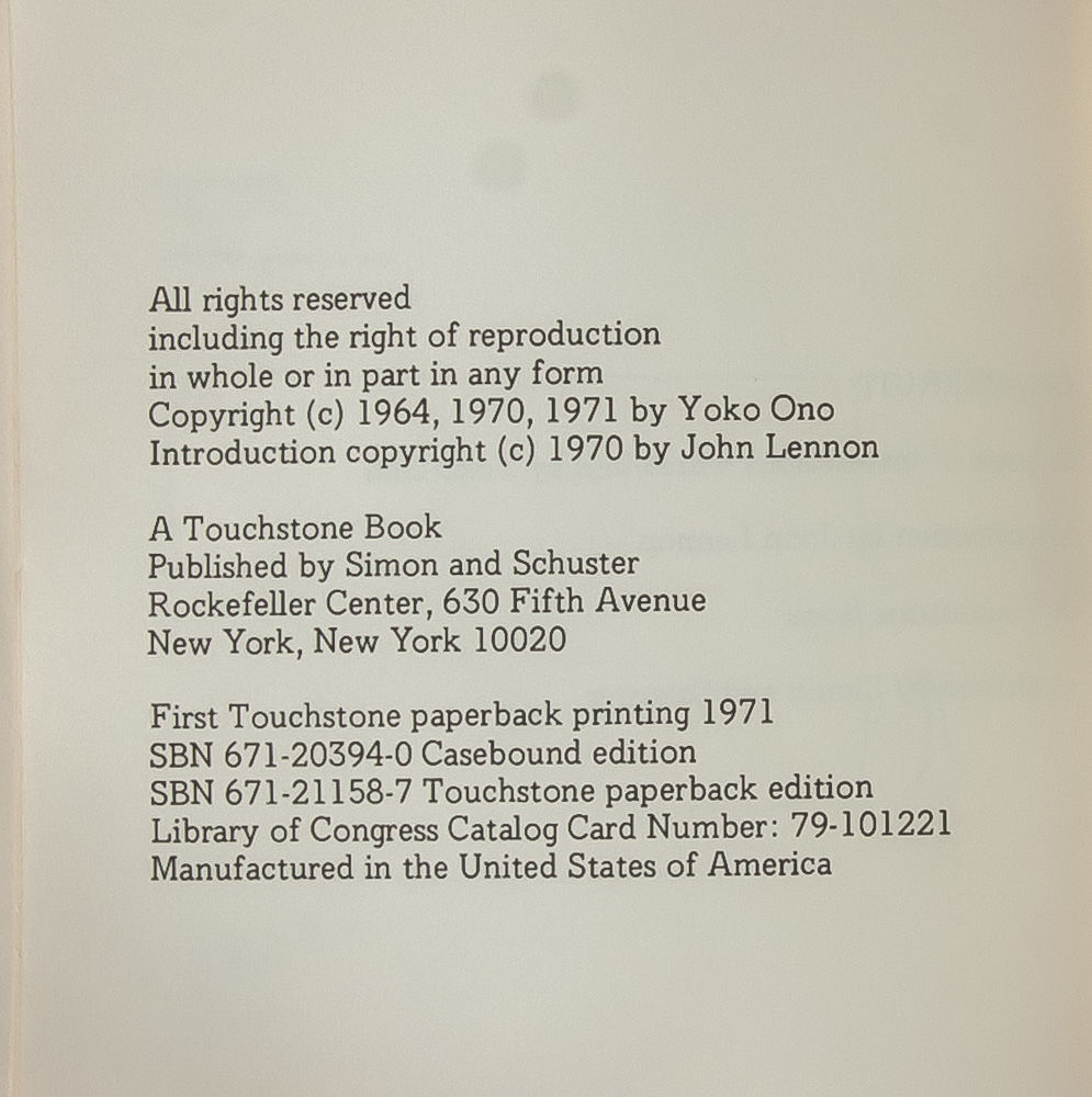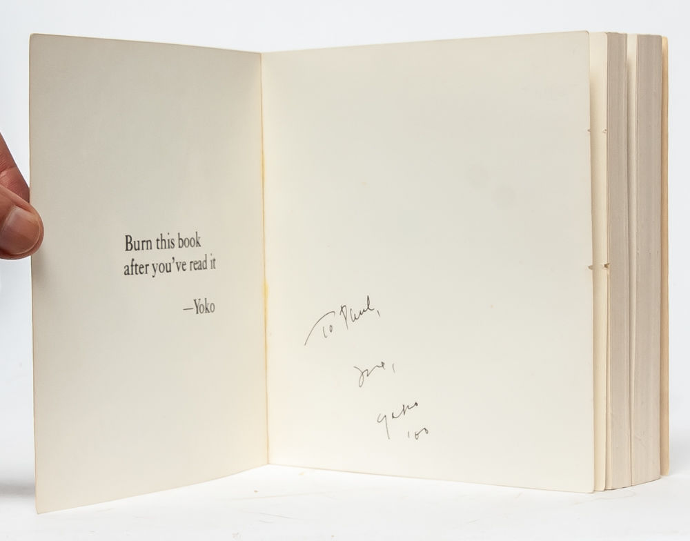 New York: A Touchstone Book published by Simon & Schuster, 1971. First Thus. Near Fine. The first Touchstone paperback edition of Yoko Ono's illustrated book, after the exceedingly rare 1964 first edition, of which only 500 copies were printed in Tokyo. Inscribed on the front endpaper "To Paul, Love Yoko Ono." In just about Fine condition, with only the slightest bit of edgewear and some creasing near the front joint. Internally clean and unmarked.