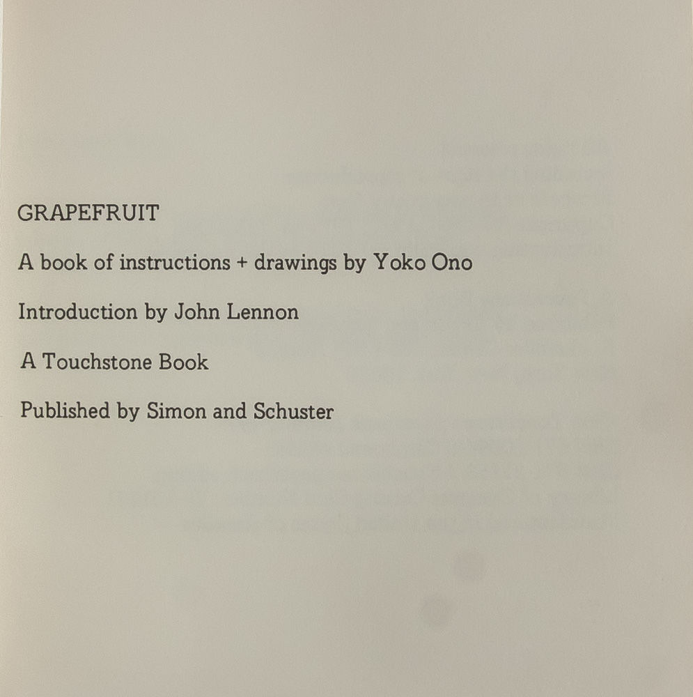 "The original Grapefruit is split into five sections - Music, Painting, Event, Poetry, Object -- with each page offering a conceptual direction for work yet to be created...After Ono married John Lennon, Simon & Schuster published a new edition of Grapefruit, though this version included some editorial revisions and additions -- the most prominent among the latter being a short foreword authored by Lennon" (The New Yorker). This artist's book earned and has maintained fame as an early example of conceptual art, making her a predecessor to men like Kosuth and Weiner, who popularized the approach. A lovely copy, inscribed mysteriously to "Paul" (we assume not McCartney). Near Fine.