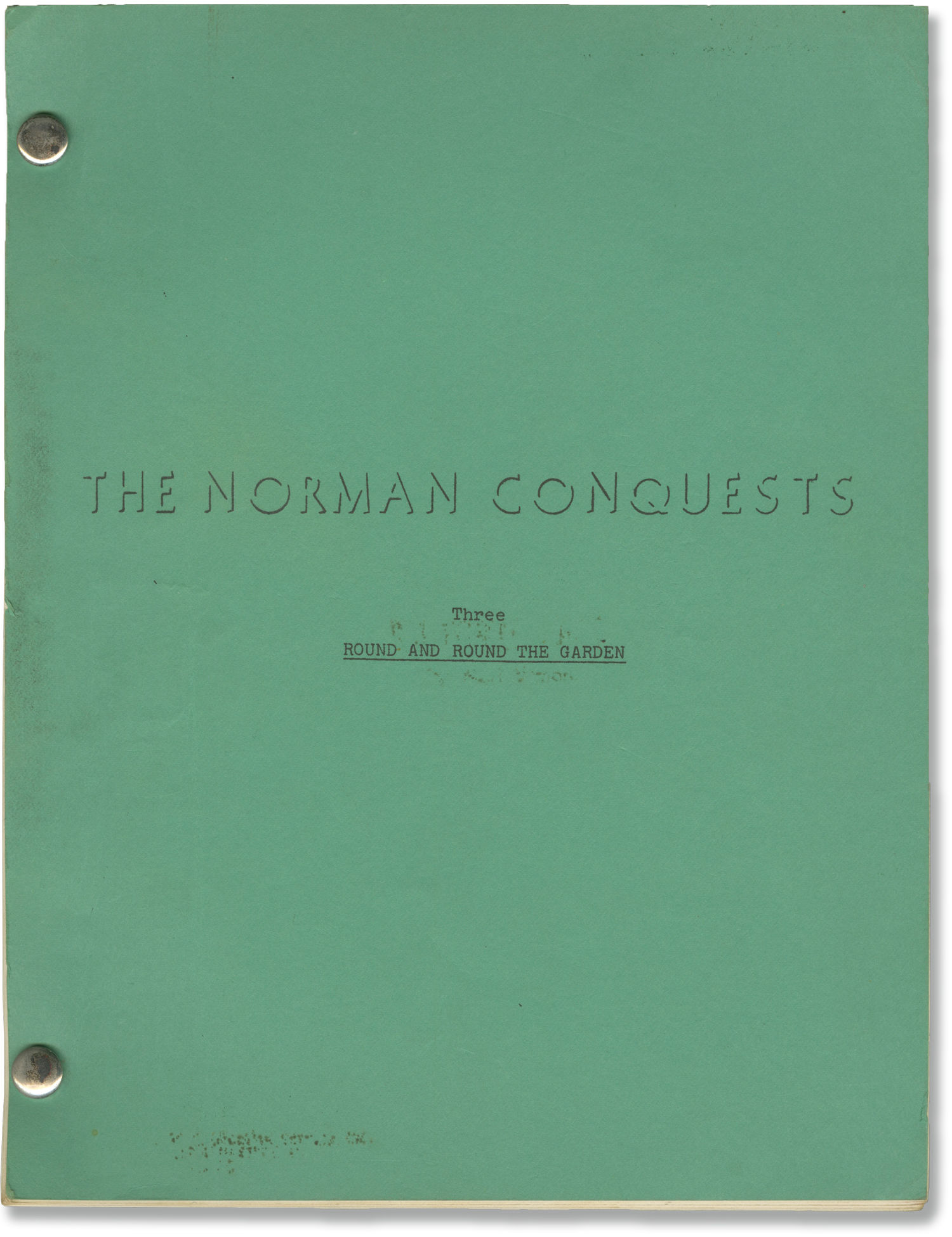 Green titled card wrappers. Title page present, with credits for playwright Alan Ayckbourn. 106 leaves, with last page of text numbered II-2-103. Xerographic duplication, rectos only. Pages Near Fine, wrapper Very Good plus, bound with two gold brads.