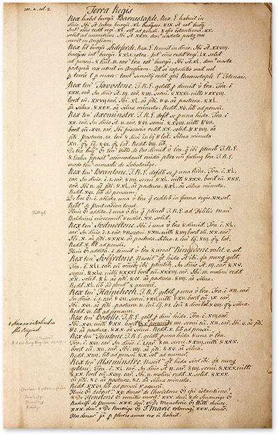 1714. Pre-Publication Manuscript Copy of the Devonshire Chapter of the Domesday Book [Manuscript]. [Domesday Book]. No. 23. V 1.2. Domesday Book for Devonshire. London?, c.1714-1783. 73 ff. Folio (15-1/2" x 10-1/2"; 39.37 x 26.67 cm). Marbled paper-covered limp boards, raised bands to spine, hand-lettered title panel to front cover. Rubbing and soiling to boards, spine and extremities with wear to spine ends and corners, sections of marbled paper rubbed away, chip to lower corner of title panel, minor worming to rear cover, pastedown and endleaves, two tiny stab-holes though rear half of text block. Light toning to leaves, text in neat hand to rectos of leaves, neat contemporary annotations in pencil to margins. $1,250. * The Domesday Book is a comprehensive census and survey of English landowners and their property commissioned by William the Conqueror in 1085. It is probably the most remarkable statistical document in the history of Europe. The British government initiated a project to publish the book in 1773. It was eventually published as a two-volume set in 1783. (Two more volumes of indexes and related material were added to this set in 1811 and 1816.) Carefully arranged and free of corrections, this faithful transcription of the Devonshire chapter appears to be a pre-publication fair copy. Most of the annotations in pencil are family names, places and landmarks. The watermark on several leaves bears the cipher "G.R.," dating the manuscript to the Hanoverian Era, which began with the coronation of King George I in 1714. It is likely this manuscript was produced between that date and the publication of the first printed edition.