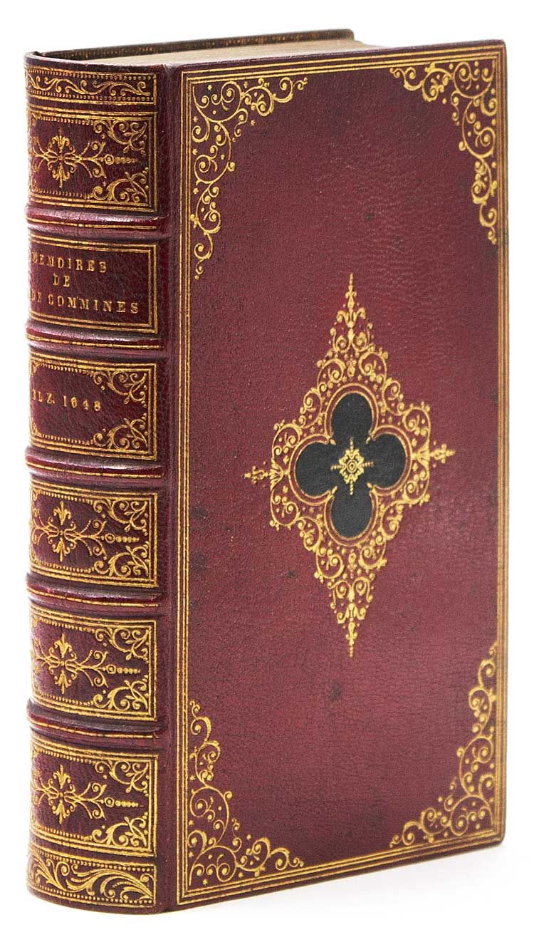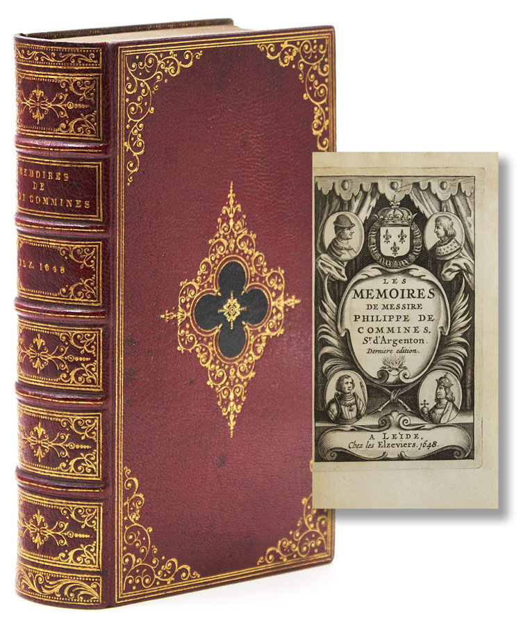 A Leide: chez les Elzevirs, 1648. First Elzevier edition. Engraved title [24],765,[19]pp. 1 vols. 12mo (13.3 x 7.5 cm.). Beautifully bound in 19th century polished claret red crushed levant, with spine and corners richly tooled in gilt, with a intricately gilt center ornament of inlaid black morocco, gilt inner dentelles, a.e.g., by Duru (dated 1850). Three bookseller's descriptions tipped to binders blank, some minor foxing, but a very near fine copy. With the bookplate of Thomas Westwood and of Ex Musaeo PIN (Elzéar)-Stern. First Elzevier edition. Engraved title [24],765,[19]pp. 1 vols. 12mo (13.3 x 7.5 cm.). The celebrated memoirs of the foremost French Renaissance historian (1445-1509), notable as an important analysis of 15th century culture, politics and personality. "...The graphic style of his narrative and above all the keenness of his insight into the motives of his contemporaries, an insight undimmed by undue regard for principles of right and wrong, make this work one of the great classics of history" - ENCYC. BRITANNICA.