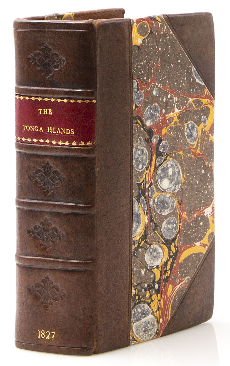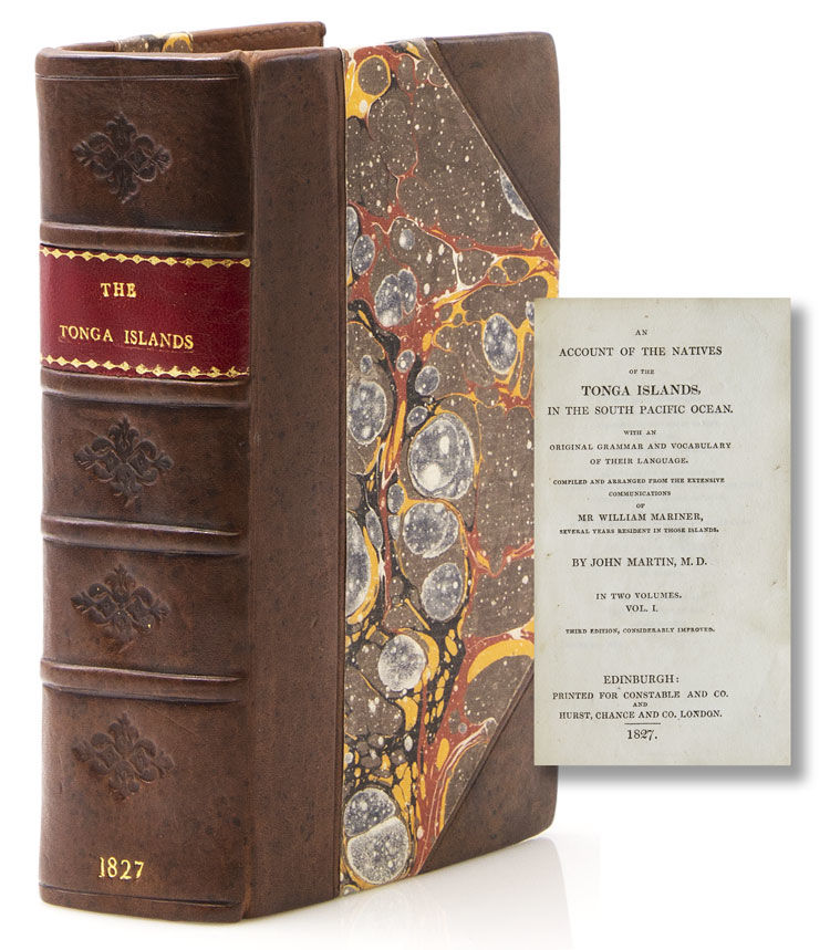 Edinburgh: Constable, 1827. Folding map. xxxiv, [35-340] ; vi, 234, cviii pp. 12mo. Half brown modern polished calf and marbled boards. Fine. Folding map. xxxiv, [35-340] ; vi, 234, cviii pp. 12mo. Martin's account of William Mariner's four years in Tonga between 1806 and 1810.