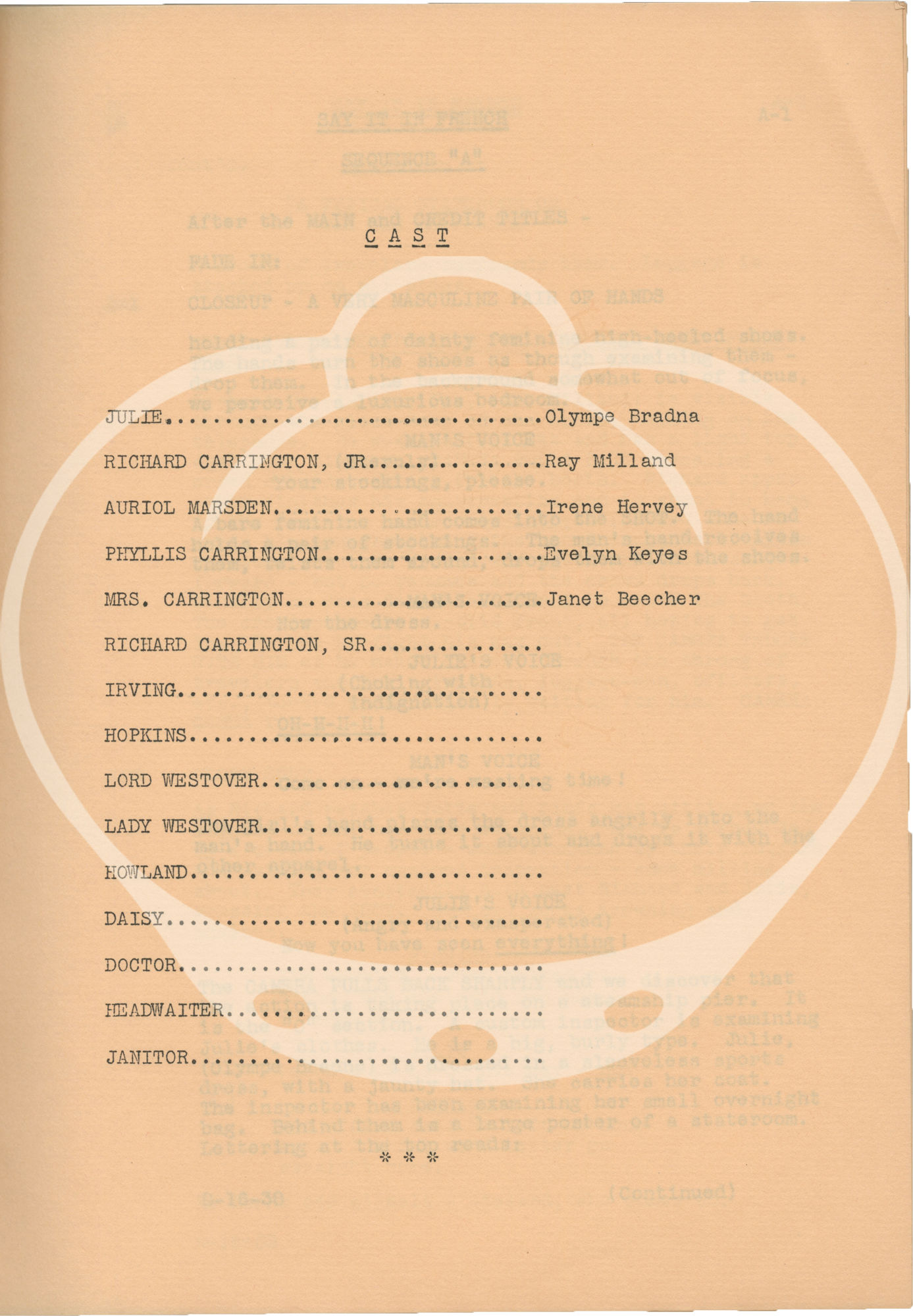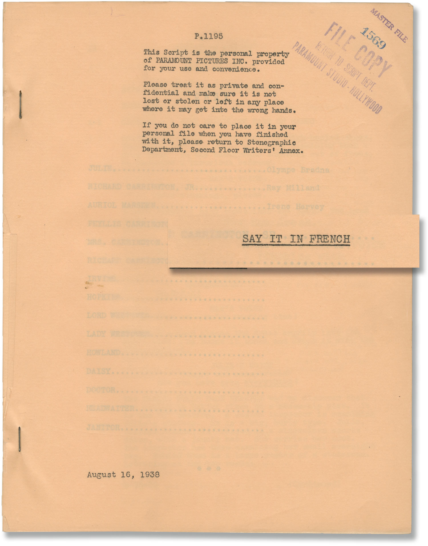 Los Angeles: Paramount Pictures, 1938. Draft script for the 1938 film. Paramount "File Copy" and "Master File" stamps on front wrapper. Script divided into sequences, as was customary for the period.