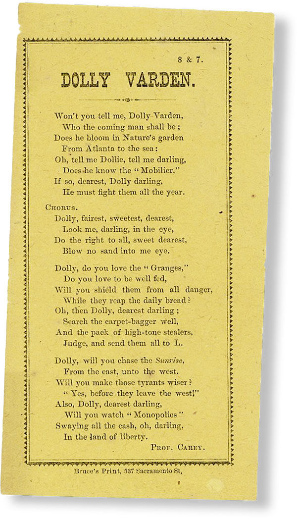 Reconstruction-era three verse ballad broadside addressed to Dolly Varden (not /the/ Dolly Varden of Charles Dickens' novel "Barnaby Rudge," though the name was hugely popular as a result of the work, and inspired a fashion craze and the name of a trout). The text makes mention of the 1872 Crédit Mobilier fraud; promotes the work of the Patrons of Husbandry ("Dolly, do you love the 'Granges,' / Do you love to be well fed, / Will you shield them from all danger, / While they reap the daily bread?"); and attacks the spread of carpet-bagging in the South ("Search the carpet-bagger well, / And the pack of high-tone stealers, / Judge, and send them all to L.