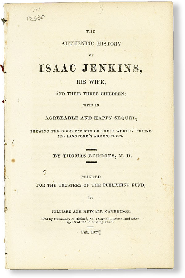 Cambridge: Printed for the Trustees of the Publishing Fund, by Hilliard and Metcalf, 1822. First American Edition. 12mo (17.5cm.); removed; 40pp. Very Good and fresh overall. Tale by the English physician promoting temperance, the eponymous Jenkins finally discovering "too sensibly the difference between beggary with drunkenness and discontent, and plenty with sobriety and a light, cheerful heart" (p. 40). SHOEMAKER 7984.