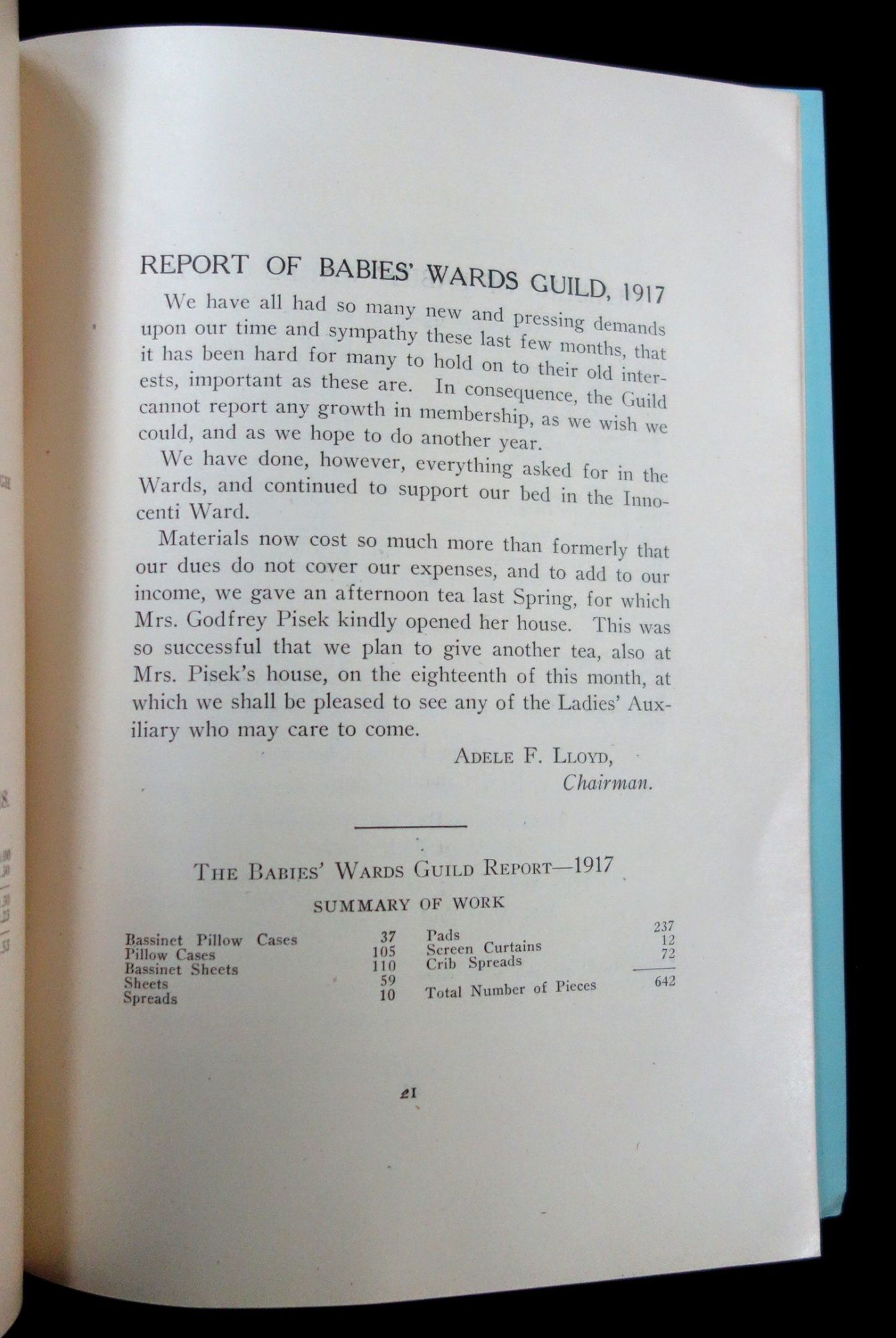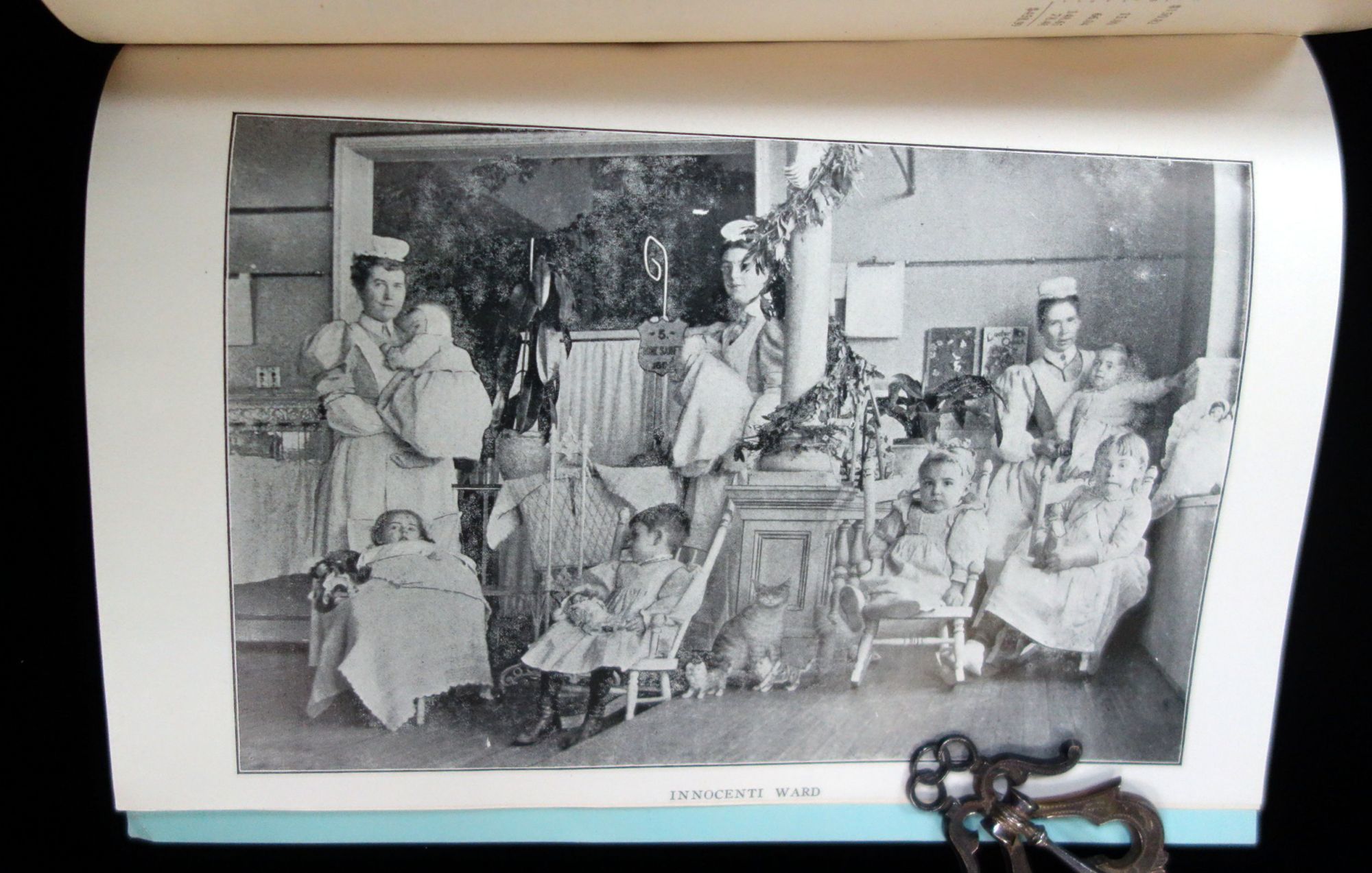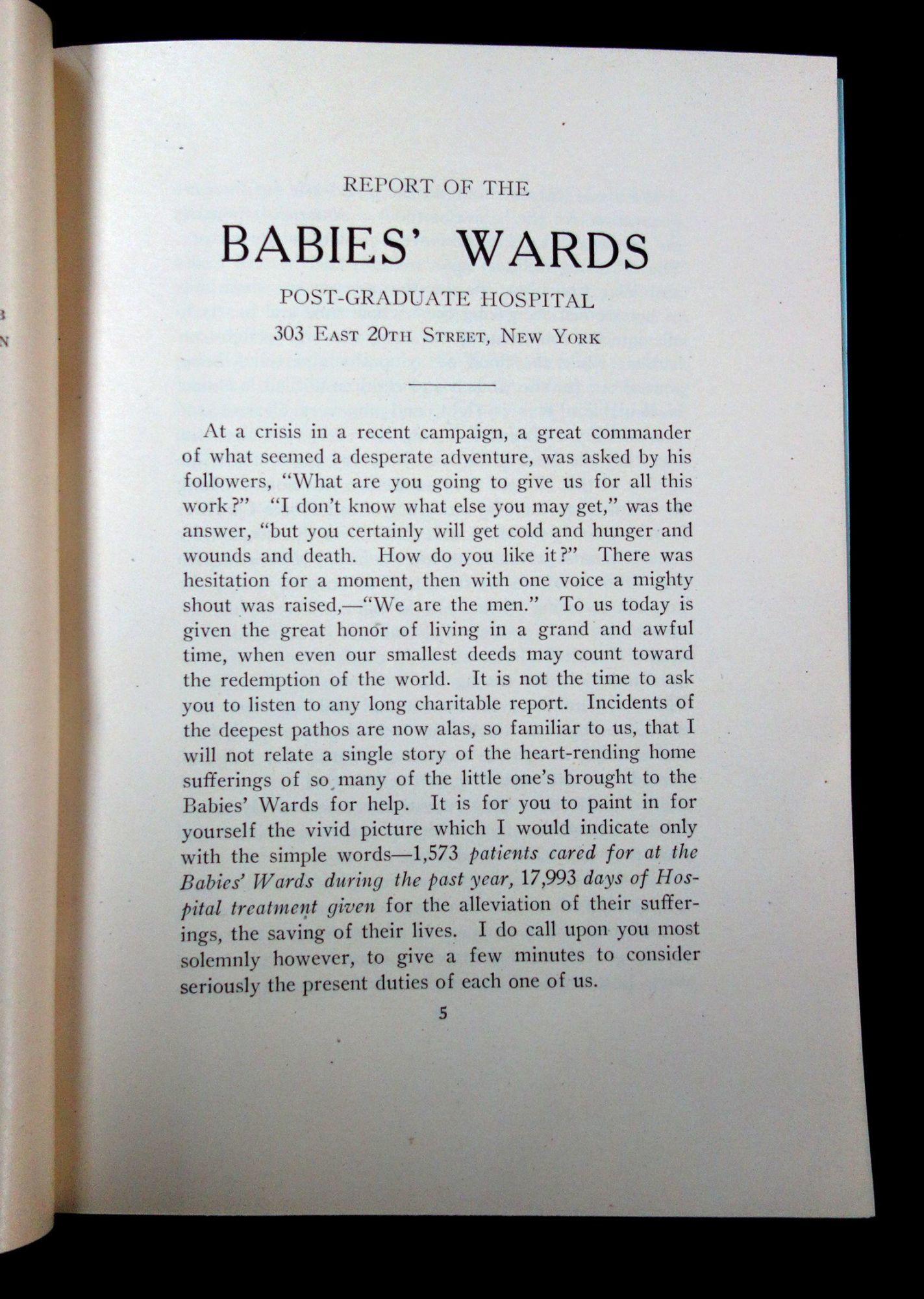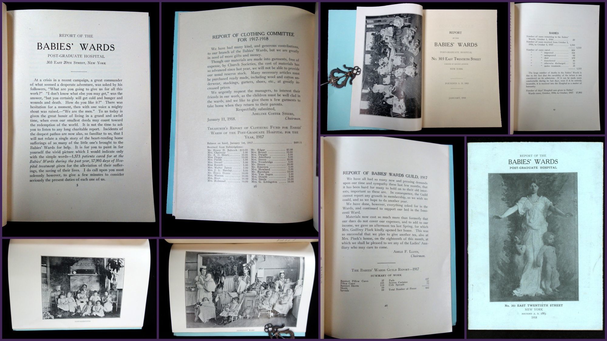 New York, NY: Babies' Wards Post-Graduate Hospital, 1918. General wear. Covers partially separated from text block.. This booklet is the 1918 yearly report of a New York charity called Babies' Wards Post-Graduate Hospital. During WWI, a lot of local charities were just as hard up for cash as their overseas counterparts and as such the booklet starts with "America is pouring out her wealth to help the Government to insure victory. She is raising millions upon millions for the Red Cross and War Charities; thousands, nay tens of thousands of her women are giving their whole time and hearts to alleviate the conditions of men, who are to fight our battles; while the flood of sympathy and relief being poured for the women and children abroad is almost incalculable... we are just now reaching the point when the very existence of our Home Charities is most gravely menaced, and that unless this community considers most seriously at once it local obligations with regard to relief, to welfare, and to hospital work, the greatest suffering of many is in sight... The time has come when the suffering is at our very doors cannot be laid aside 'till the war is over' as we hear frequently suggested, but must be met at once..." In addition to this plea for help, the yearly report contains the statistics of the babies helped that year, reports from a visiting nurse, Clothing Committee, Junior Auxiliary Committee, Babies Ward Guild, Social Services Committee of the Babies' Wards, and Social Service Committee, as well as the financial report from the Treasurer, annual subscriptions and other donations of supplies. Three (3) black and white printed photographs of the baby ward with nurses taking care of the infants. 36 pg. Blue illustrated wrappers. Measures 8" x 5 1/2". OCLC: 2 (March 2020).