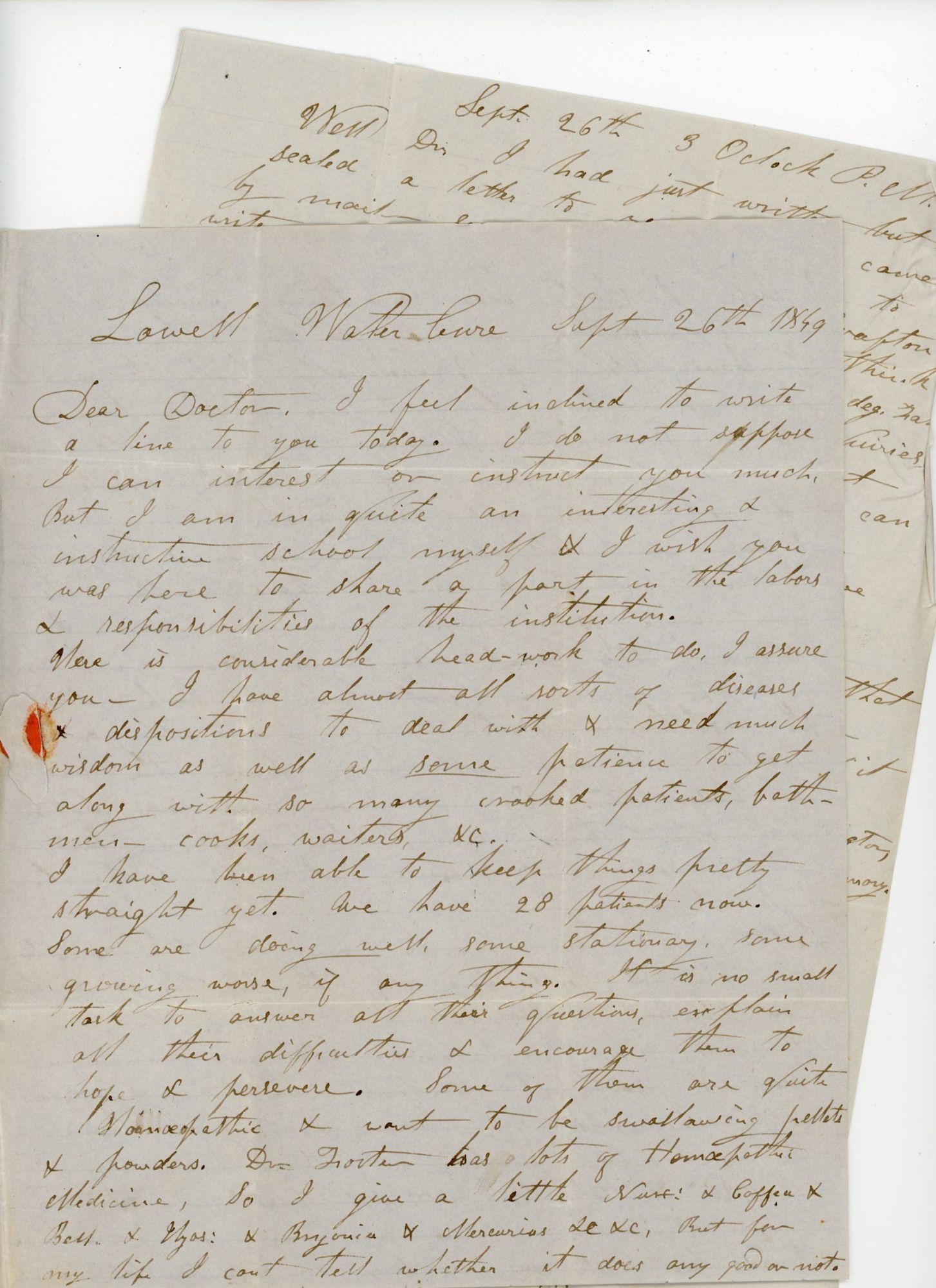 Lowell, MA, 1849. General wear with letter folds.. Stampless post. A letter between two doctors, Dr. Bulter Wilmarth and Dr. John Hero that discussing the various patients at a local sanitarium in Lowell, MA, that Wilmarth is treating. There is also some talk about the possibility of the pair working together, either at the current sanitarium or purchasing a sanitarium together elsewhere. This idea for the men to buy and run a sanitarium together does not appear to be a new one, but rather one that they have been kicking around for a while. Dr. Butler Wilmarth seems to be temporarily working at the sanitarium in Lowell, it is unclear if he was asked for fill in for a doctor there and heard about the possible sale of the sanitarium or if he is there as a potential buyer and decided to take on some work there to see if he like it. One thing is clear, that while it appears as though Dr. Wilmarth has respect for the "water cures", other homeopathic remedies are not to his liking, even as he does his best to learn about them and treat patients using them. The two doctors, Wilmarth and Hero, were friends that had first established their relationship as a mentor-student bond when Hero was studying medicine under Wilmarth. The two did not purchase the sanitarium discussed in the letter, but a few years later, in 1851, they would purchase one in Westboro, MA. Below are some quotes from the letter: