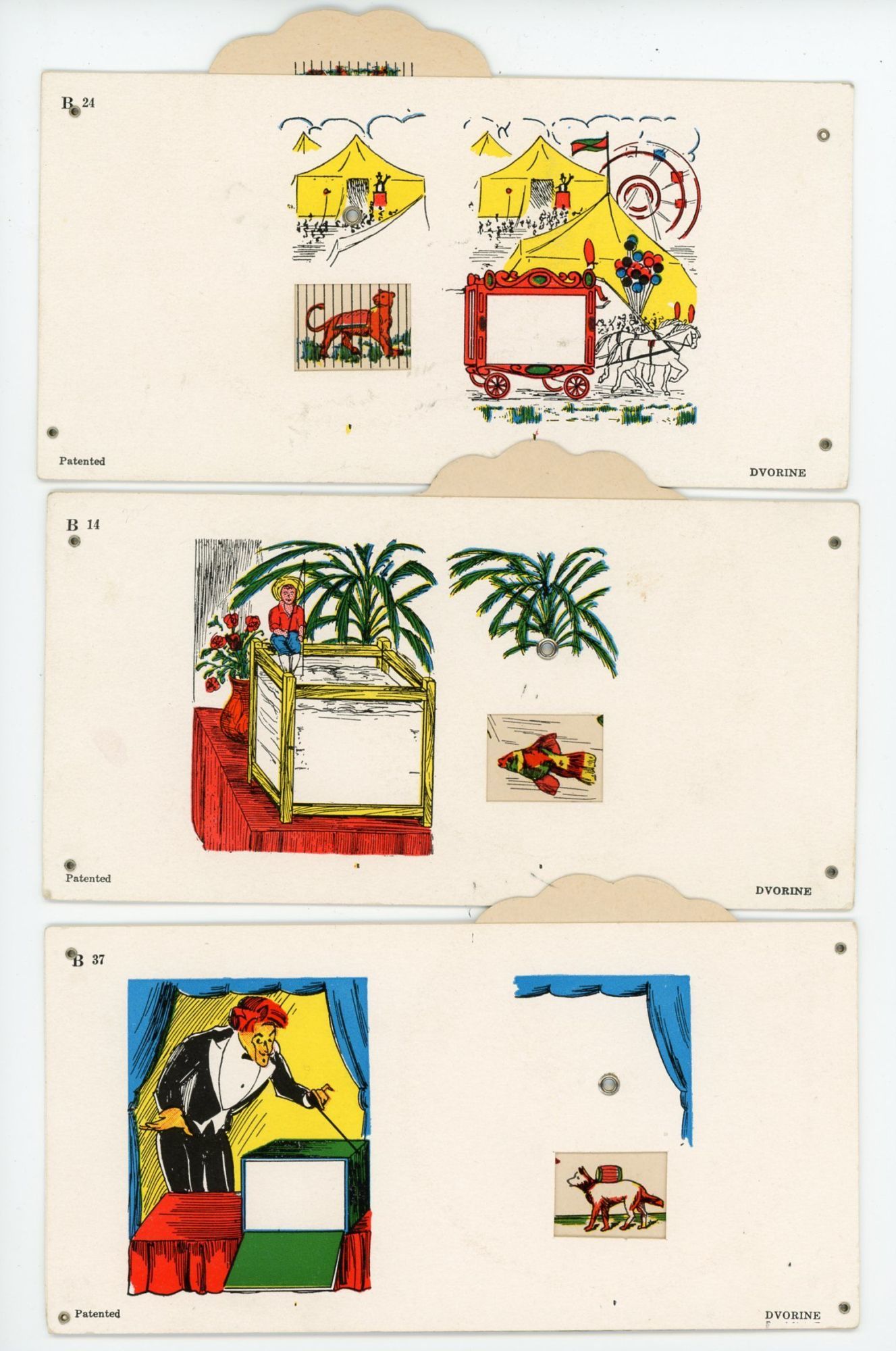 Baltimore MD: Dvorine, Israel, 1928. Minimal wear.. Three (3) different 3 1/2" x 7" early learning educational volvelles with mirror images both sides. They include a circus that various animals occupy, a magician's box with different objects appearing and disappearing and a fish tank with various tropical fish. Marked B14, B24 and B 37.