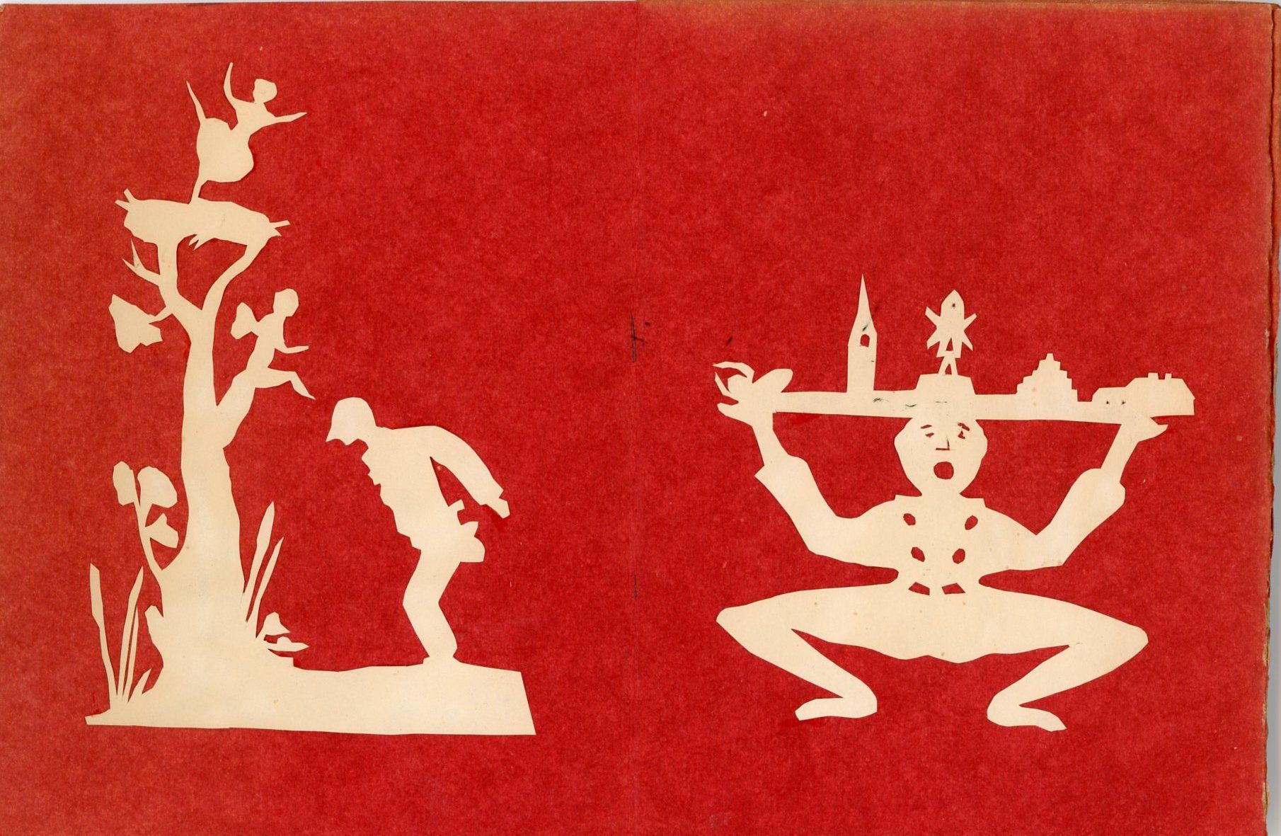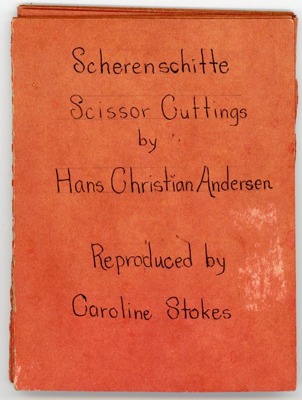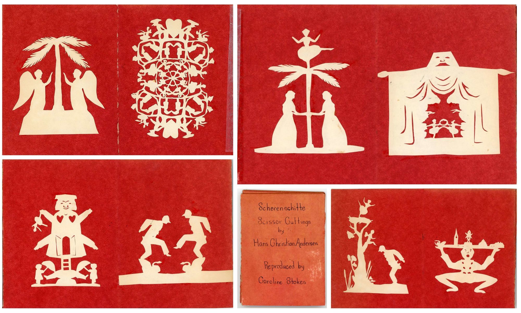 Sandy Hook, CT: Caroline Stokes, 1980. The whimsy and fantasy found in many of his stories can be seen in these reproductions of works originally created by Andersen. In the first scherenschnitte you will see a character in his likeness unable to attain the ballerina at the top of the tree with Cupid in the tree giving him advise. The next cutwork depicts an overwhelmed fellow with an entire village atop his hat. And so they go with ballerinas, hearts, swans and more throughout. The approximate 3" to 5" cutouts are affixed to a concertina folded card stock folder. Andersen often fell in love with unattainable women, and many of his stories are interpreted as references.
