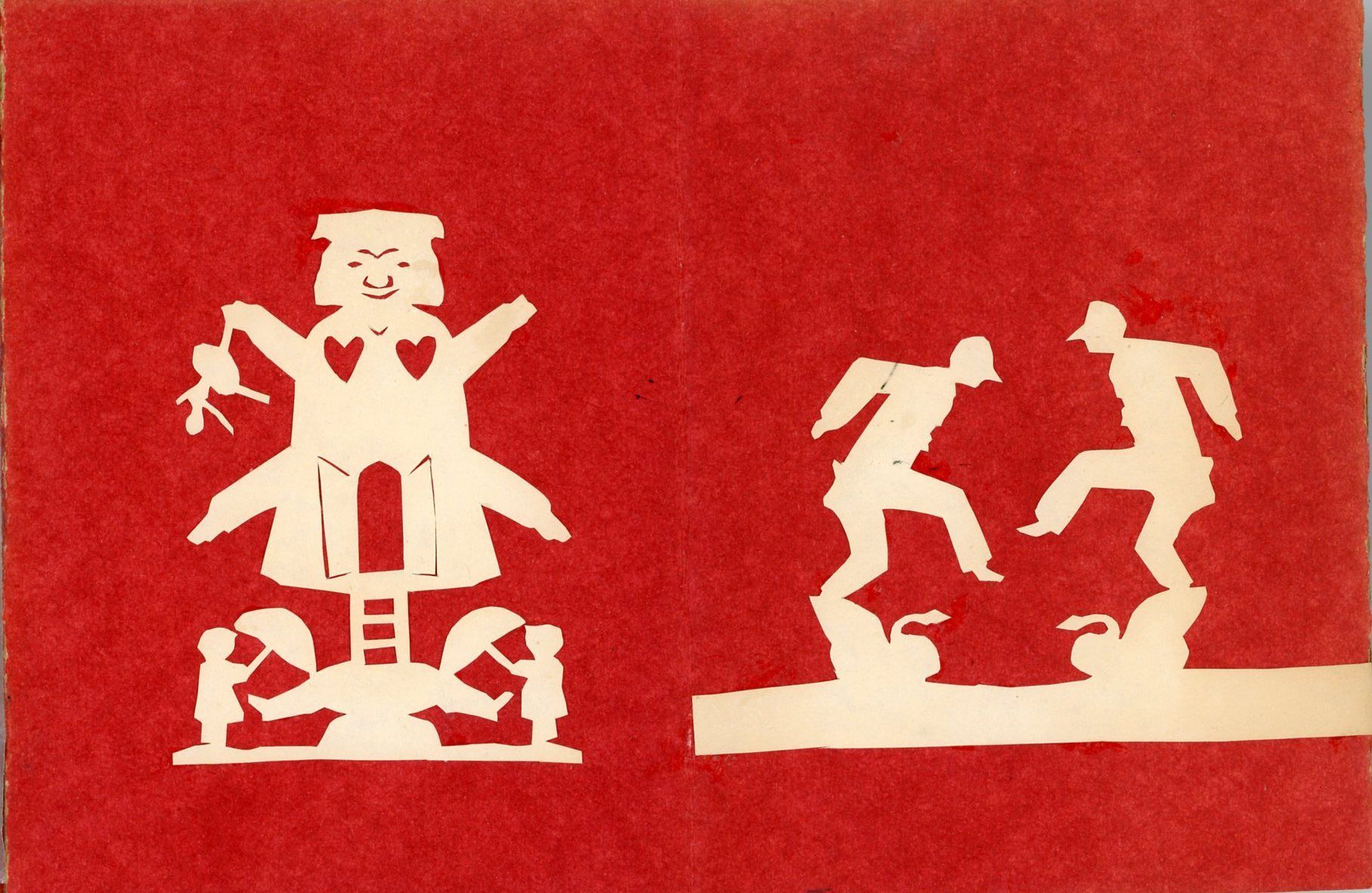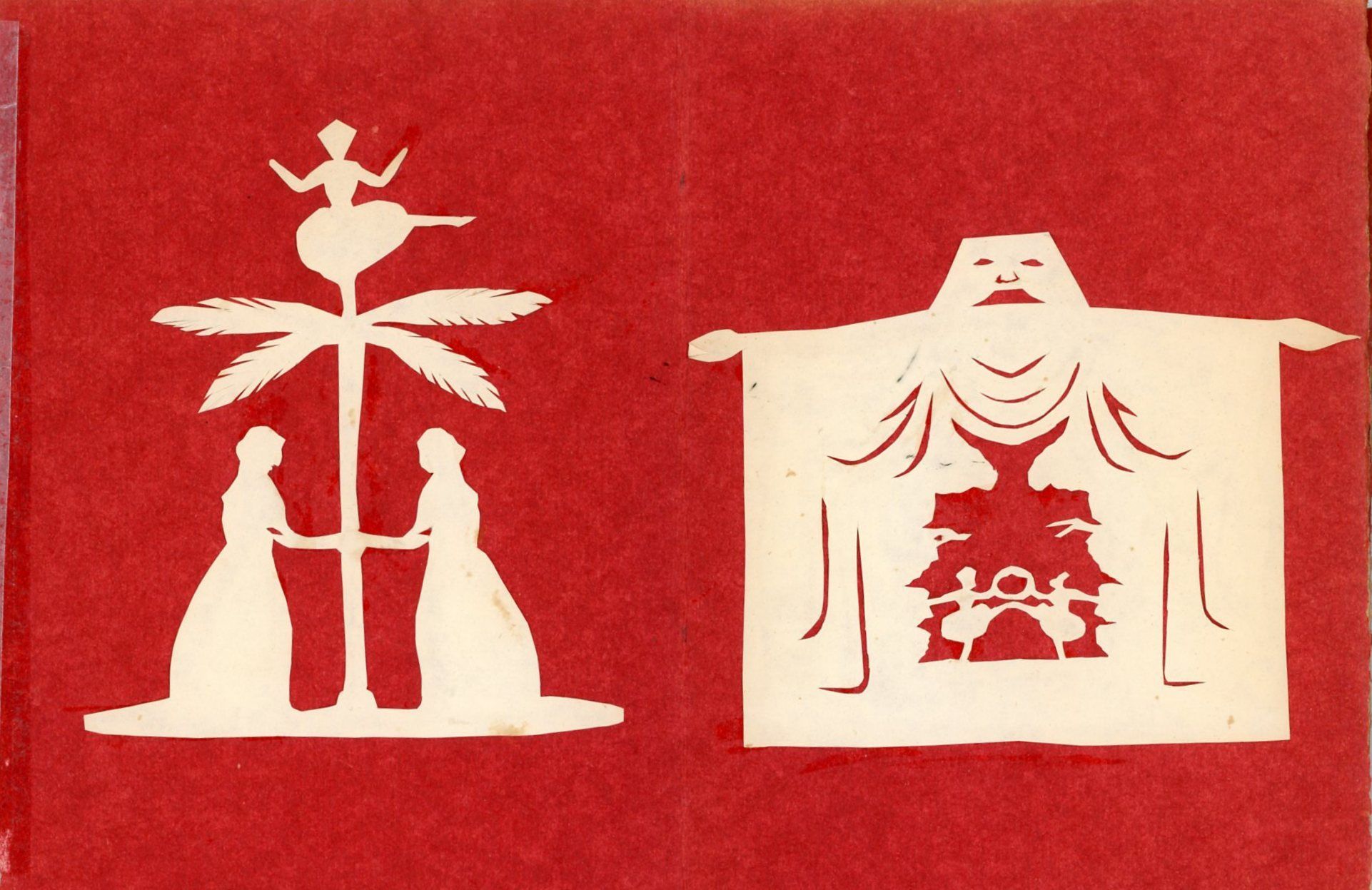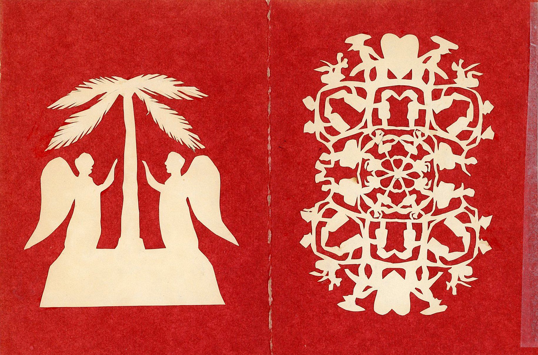 Sandy Hook, CT: Caroline Stokes, 1980. The whimsy and fantasy found in many of his stories can be seen in these reproductions of works originally created by Andersen. In the first scherenschnitte you will see a character in his likeness unable to attain the ballerina at the top of the tree with Cupid in the tree giving him advise. The next cutwork depicts an overwhelmed fellow with an entire village atop his hat. And so they go with ballerinas, hearts, swans and more throughout. The approximate 3" to 5" cutouts are affixed to a concertina folded card stock folder. Andersen often fell in love with unattainable women, and many of his stories are interpreted as references.