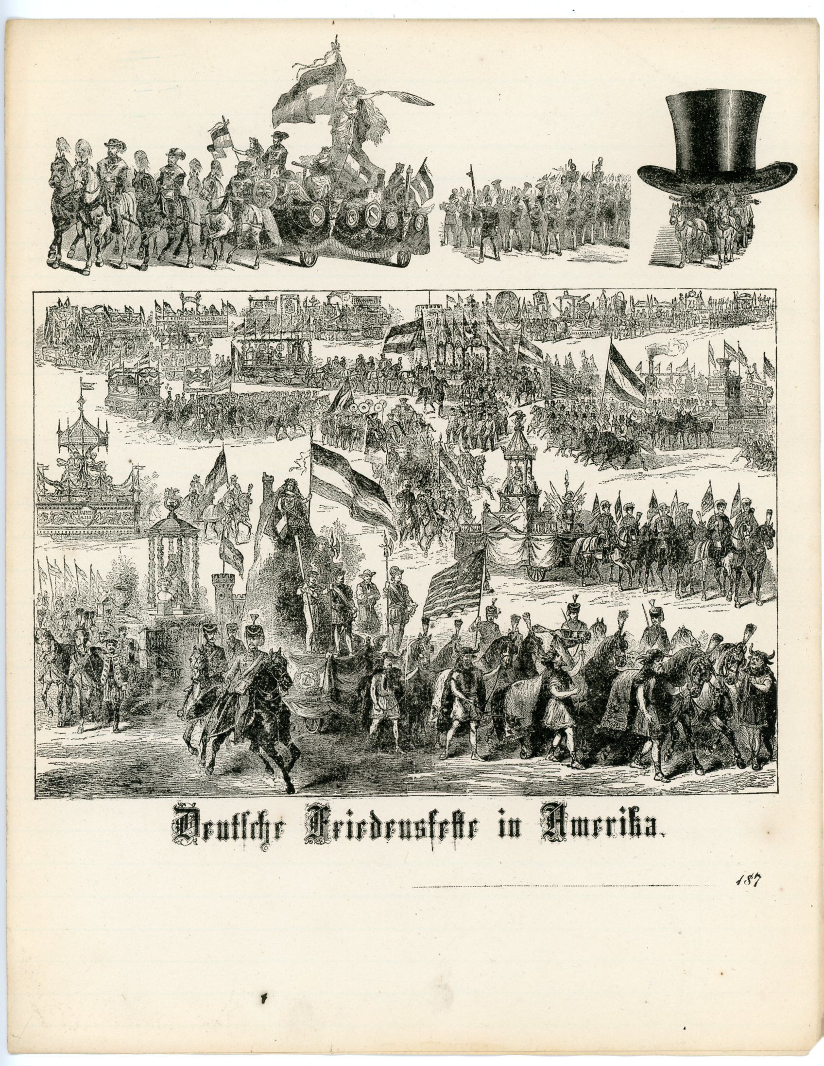 [1871]. General wear. . The German Peace Festival was celebrated all across the US in most major cities (including but not limited to New York, Baltimore, Washington DC and even Honolulu! The festival was to commemorated the end of the Franco-Prussian War. The festival in the cities consisted of large parades with floats, soldiers in uniform, and German singers. The engraving itself takes up nearly the entire front page of the single fold unused lettersheet. The main portion of the engraving shows a parade serpentining the sheet, with a variety of parade floats, squadrons of men on horseback or marching in uniform, German and American flags, and marching bands. At the top of the page are three close ups of sections of the parade. The first features several men in uniform on horses pulling a float with the Goddess of Victory, Nike, on top. The second features a large marching band with drum major at the front. The last image features another horse drawn float, however the float this time is of a giant top hat. This may or may not be in reference to the late President Lincoln. The base of the engraving is captioned with "Deutsches Friedensfest in Amerika [German Peace Festival in America] 187_". There is no indication as to which city this particular representation of the festival took place in. The interior pages of this lettersheet are lined. Single fold. Measures 10 3/4" x 8 1/2" (folded), 16 3/4" x 10 3/4" (unfolded).