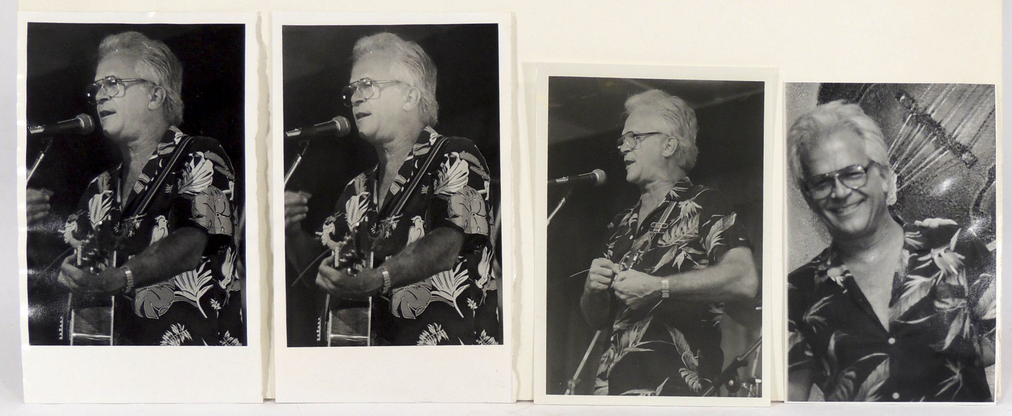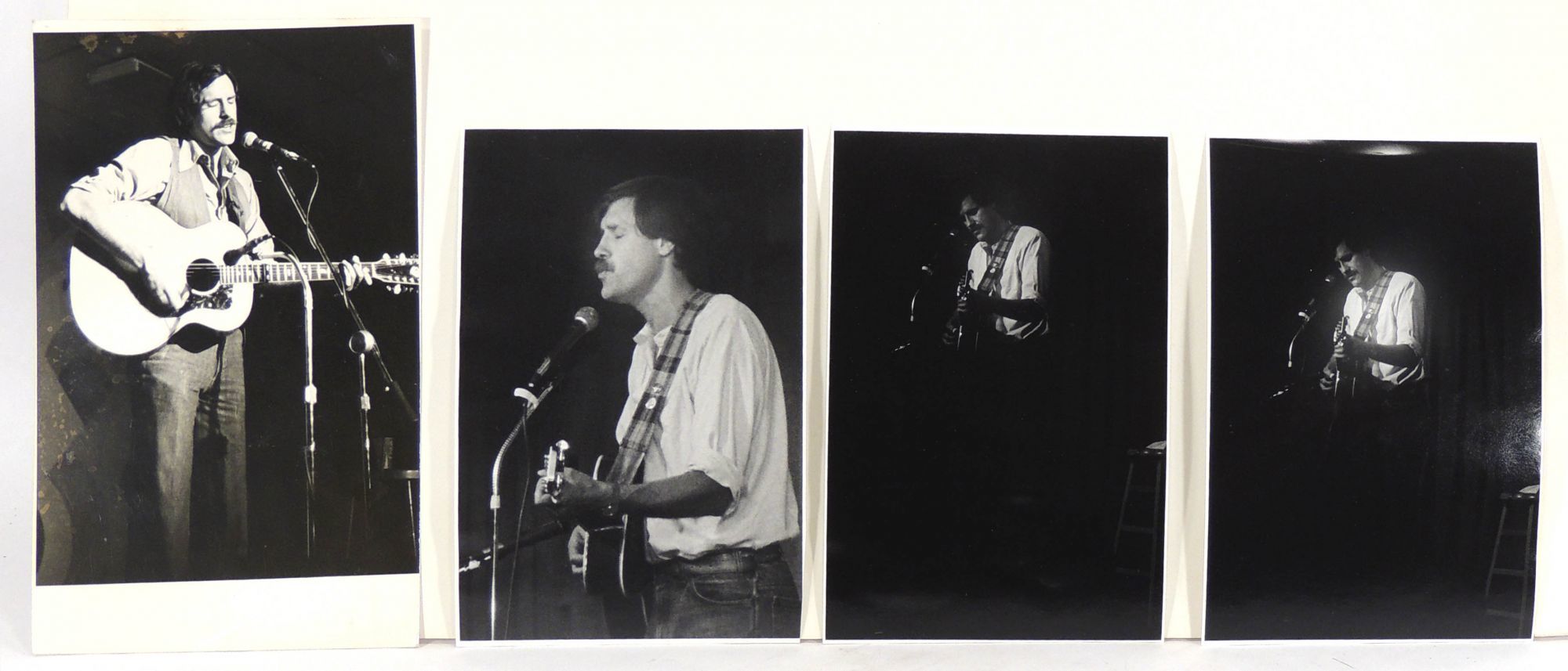 [Washington, DC], 1985. Very Good. A nice little collection of 15 black and white photos from an July 1985 folk concert with the Kingston Trio and an August 1985 Birchmere Club concert with folk singer Tom Chapin. The July concert features the Kingston Trio in one of its many incarnations after their initial fame in the 1950s-60s. After the original group broke up, one of its original members, Bob Shane, bought the rights to the group's name and continued performing with various other musicians over several decades. During the period of this event, Shane was joined by George Grove and Bobby Haworth. There are seven photos of the group and of Shane alone. There are three photos that feature Dick Cerri, the well-known D.C.folk music disc jockey and founder of the World Folk Music Association. There is also a photo of singers Doris Justis and Sean McGhee, a couple who sometimes performed together as Side by Side. One other photo does not identify its subjects. There are four photos (two duplicates) from Chapin's performance at the Birchmere. The pictures appear to have been taken professionally, with "Photograph by Jean Ward" stamped on the backs. There are miscellaneous notes by her such as file copy, subject, camera settings. Most of the photos measure 5 x 6.5 inches. In very good condition. PHOTO/051220.