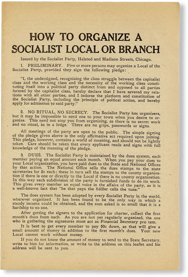 Chicago: National Office of the Socialist Party, N.d. [ca 1913]. Edition and printing not stated. 4-pp leaflet (single folded sheet); text on all four pages. Mild age-toning to paper, small chips; still Very Good. Organizational guide for local branches; includes a catalog of "Socialist Party Supplies" including celluloid buttons, lapel pins, dues cards, and, compellingly, the "moving picture film 'Opening the Campaign at Riverview Park." Not separately catalogued in OCLC.