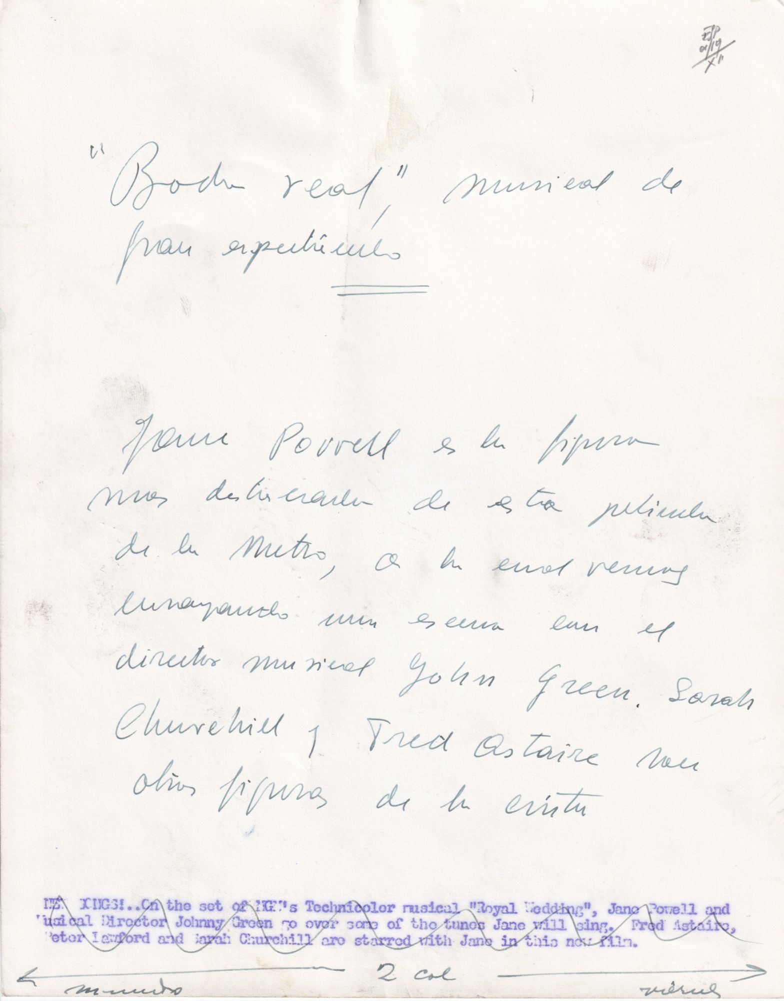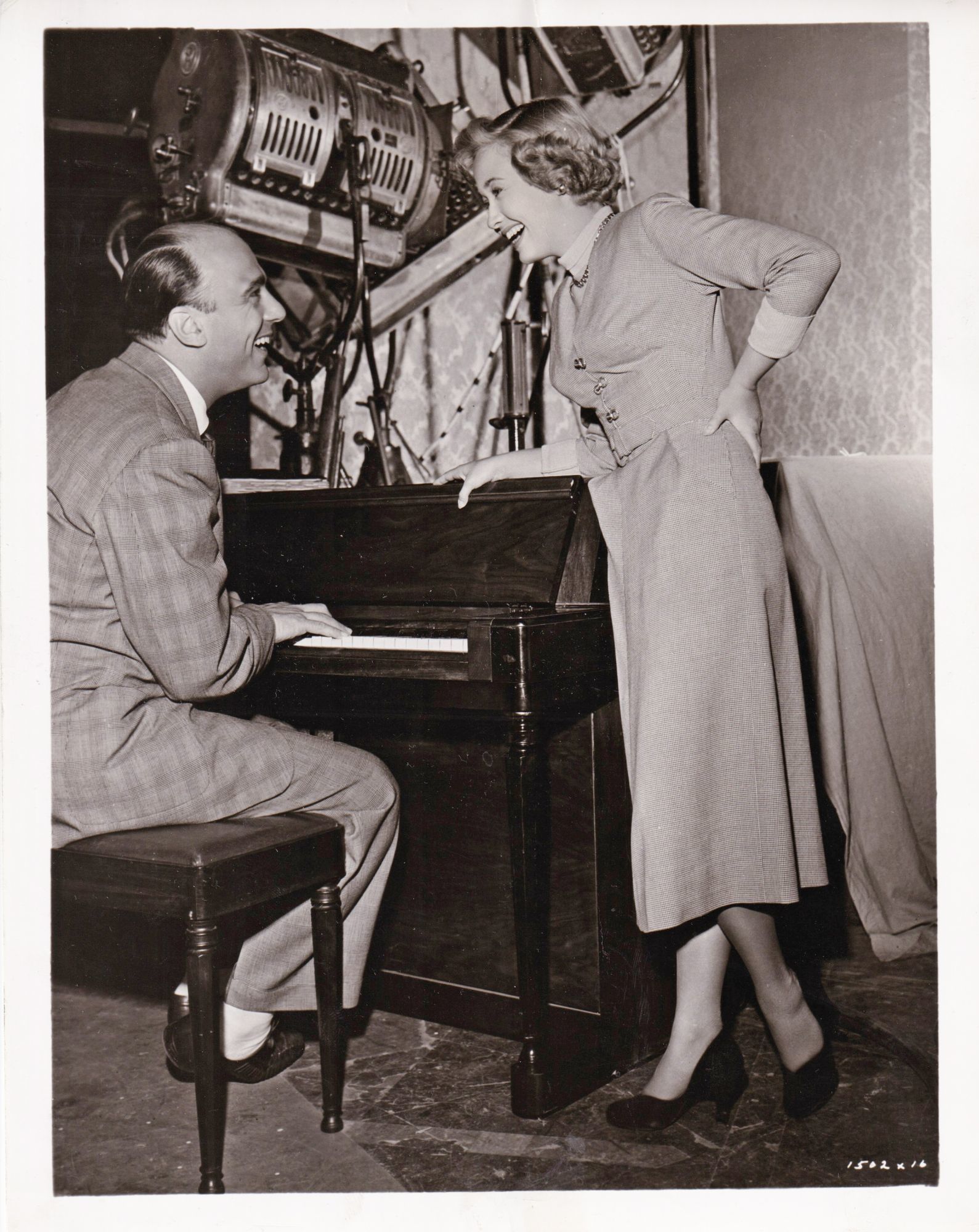 Beverly Hills, CA: Metro-Goldwyn-Mayer [MGM], 1951. Vintage studio photograph of Jane Powell and Musical Director Johnny Green on the set of the 1951 film. Mimeo snipe, French annotations in manuscript ink and crop marks on the verso.