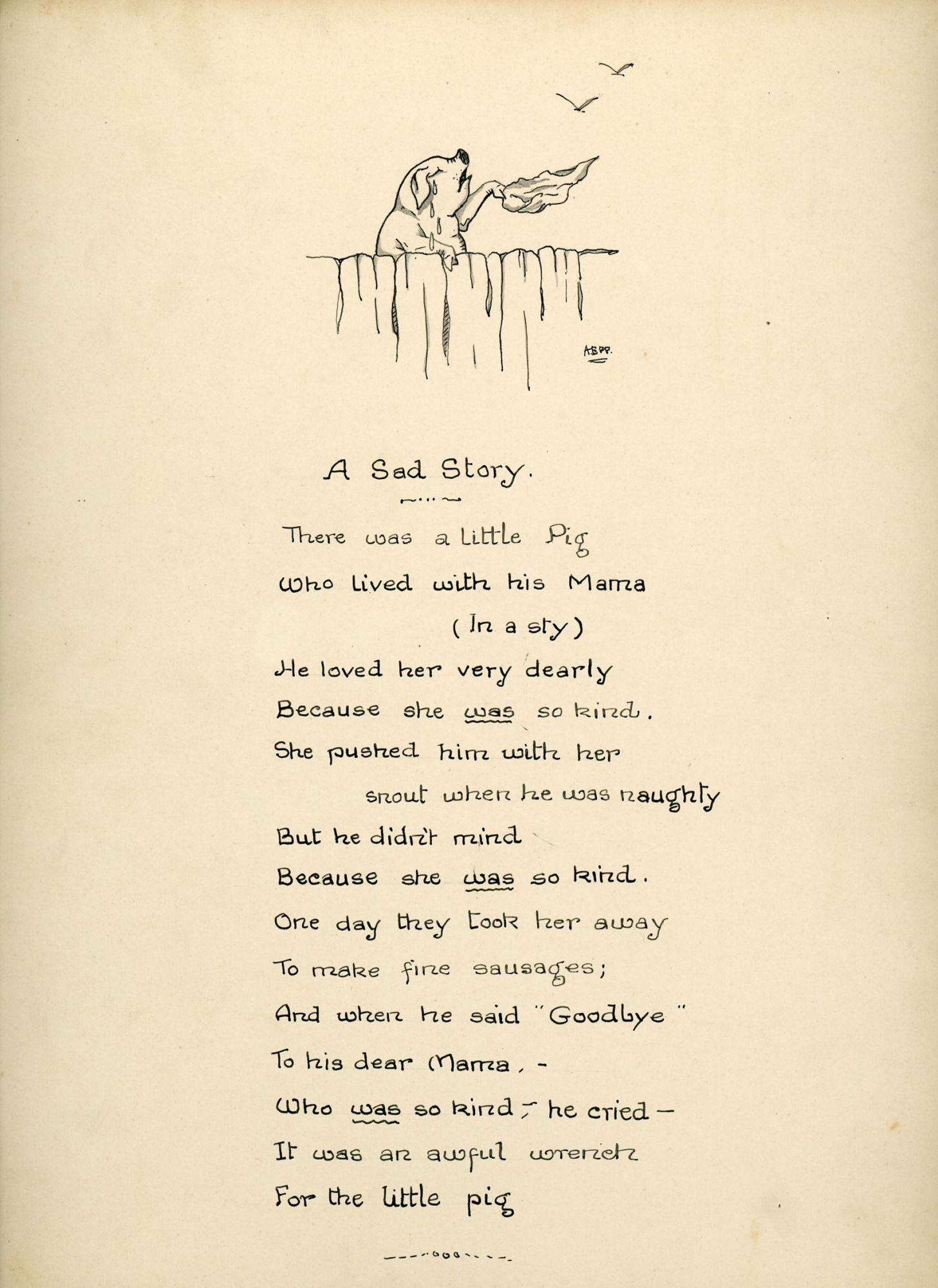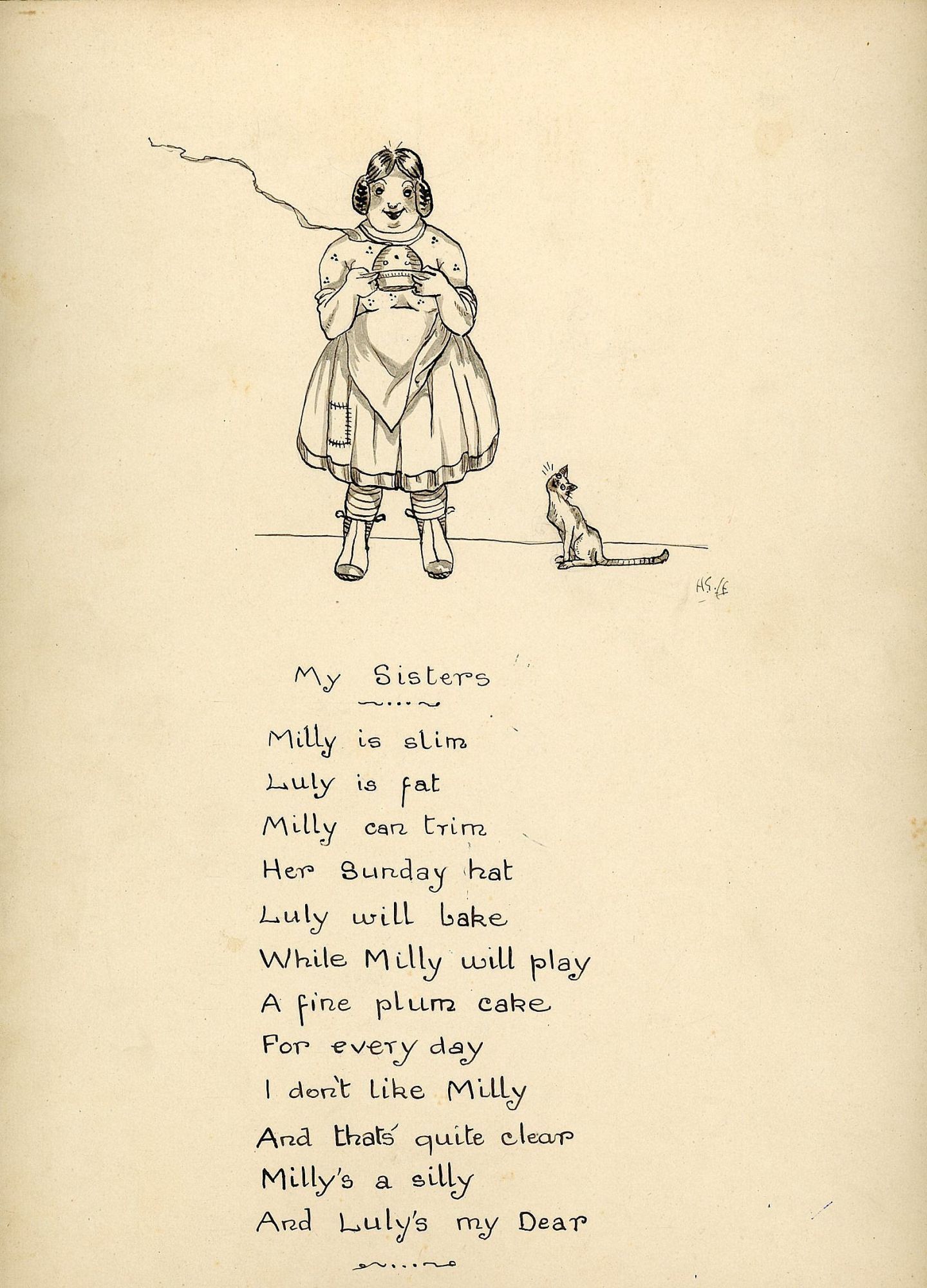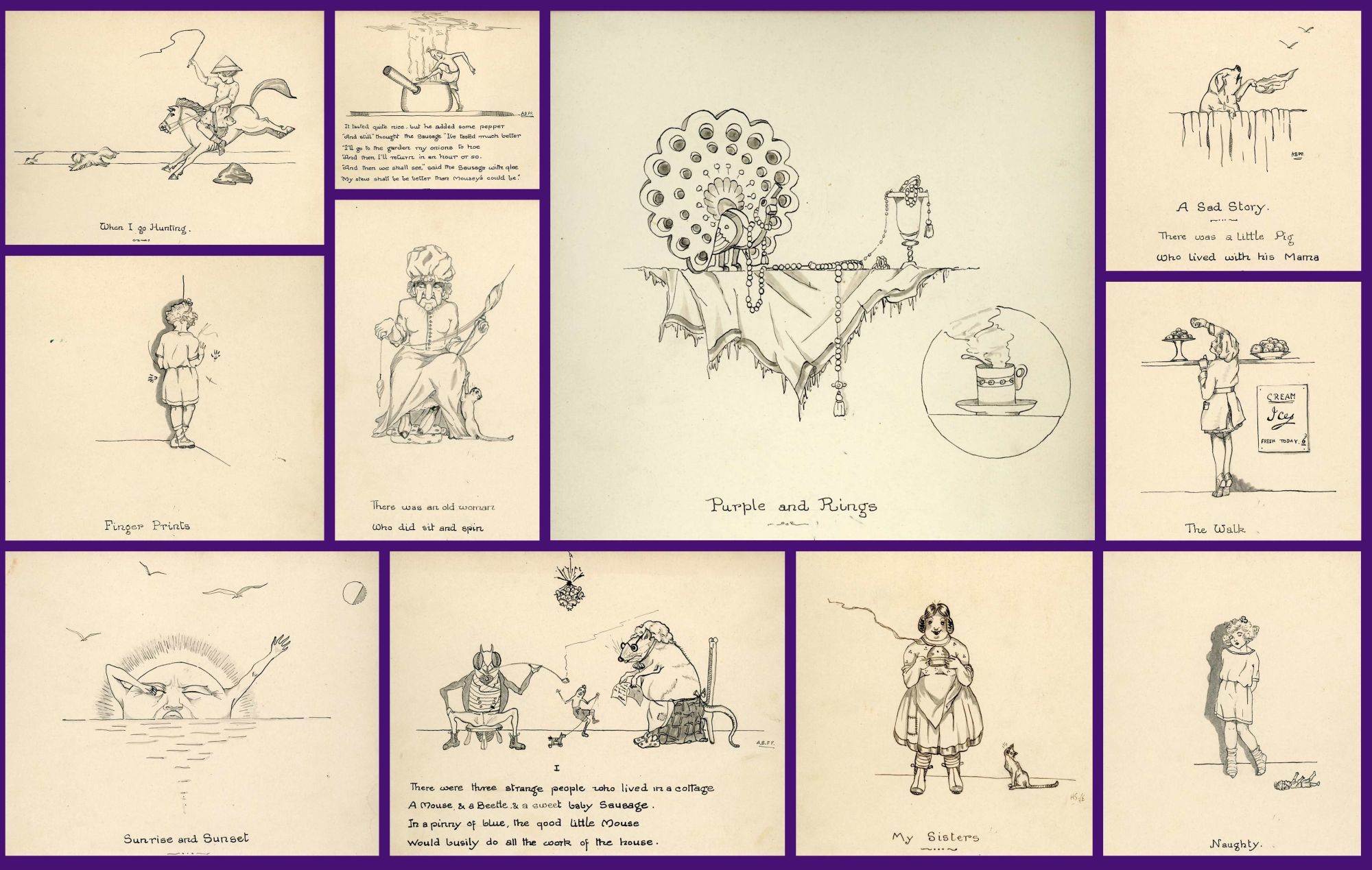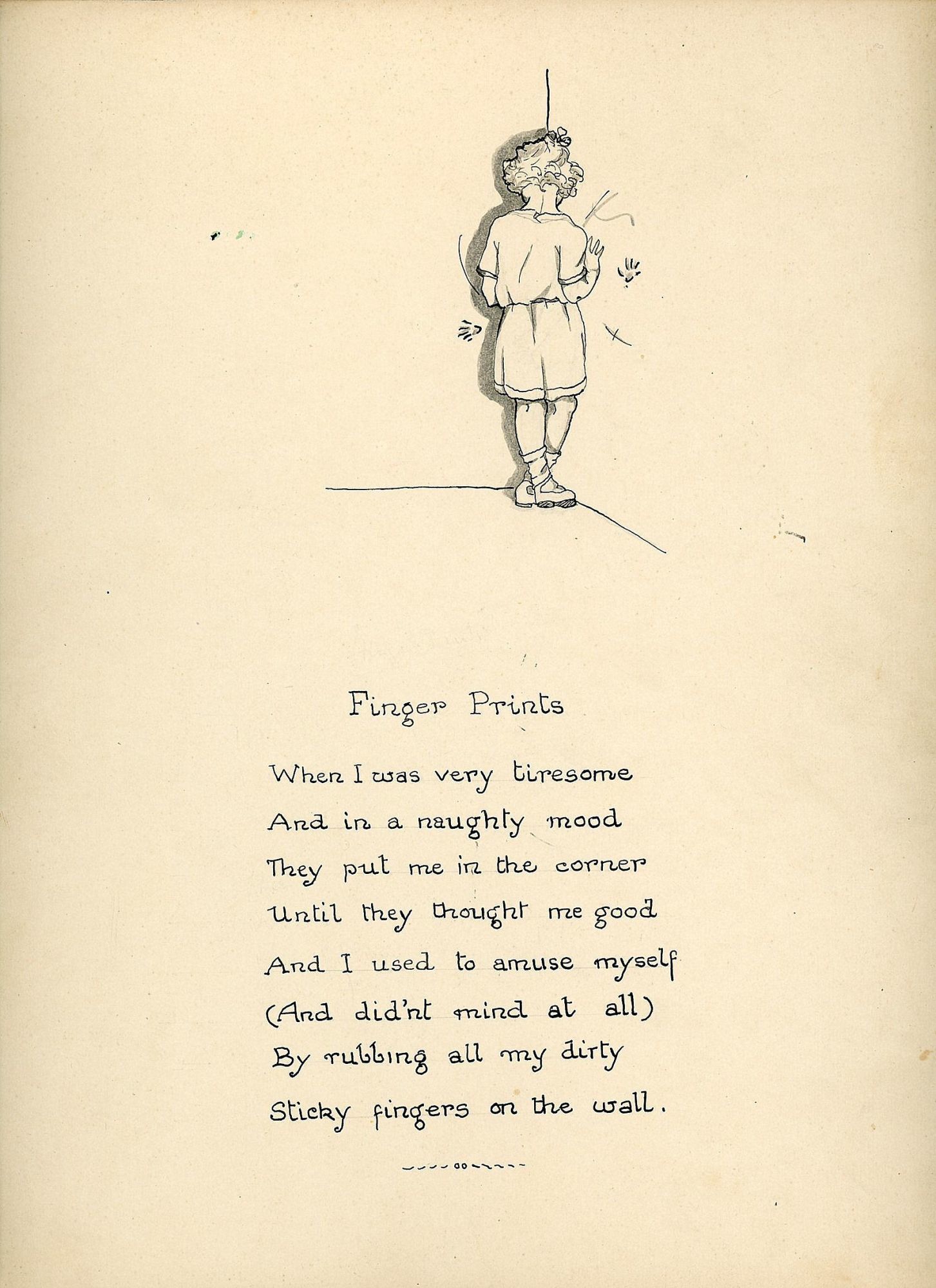 1930. Light surface soiling on margins.. Ten (10) original hand penned verses, each with charming relevant drawings. All are on a single 12" x 9" art board except for the tale of A Mouse and a Beetle and a sweet baby Sausage who lived together. This particular tale, written in five verses has a sad ending--something to do with ending up in the soup. The other verses are titled Finger Prints, Sunrise and Sunset, Naughty, My Sisters, When I go Hunting, Purple and Rings, There was an old woman, The Walk and A Sad Story.