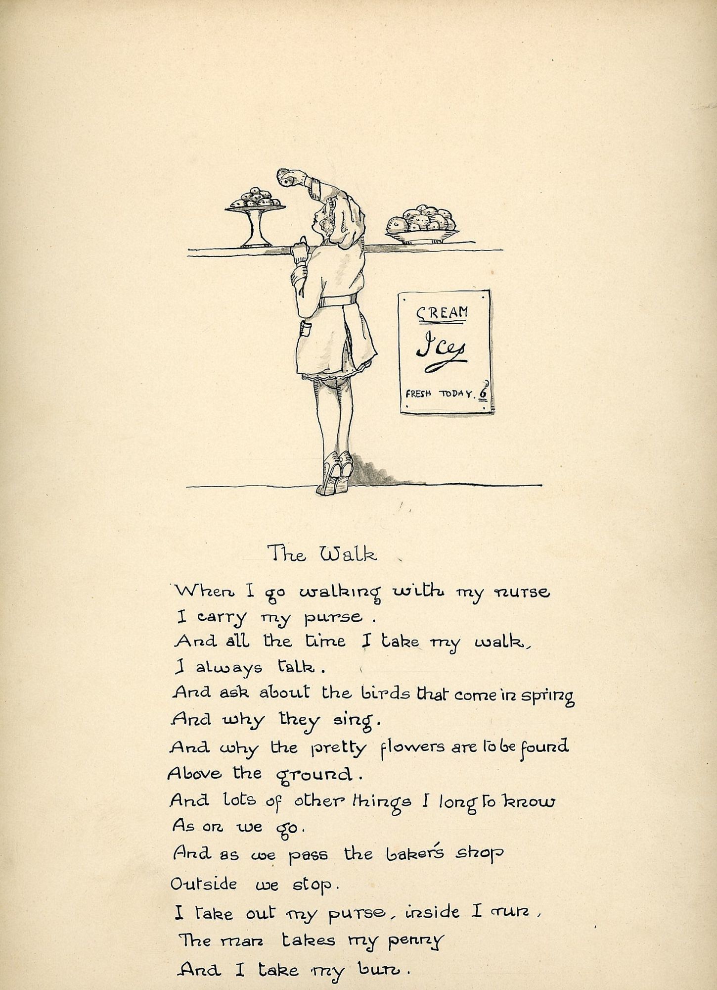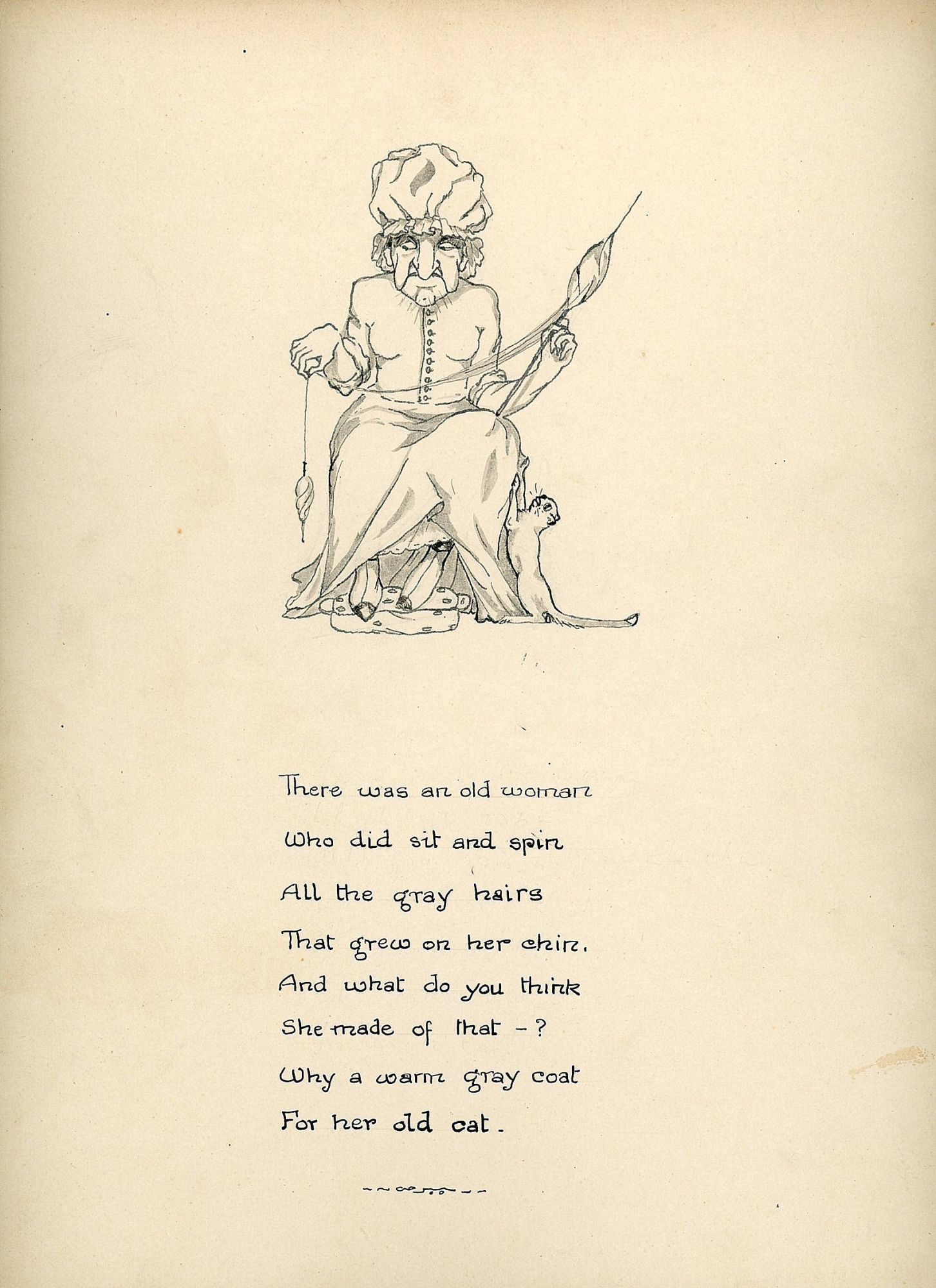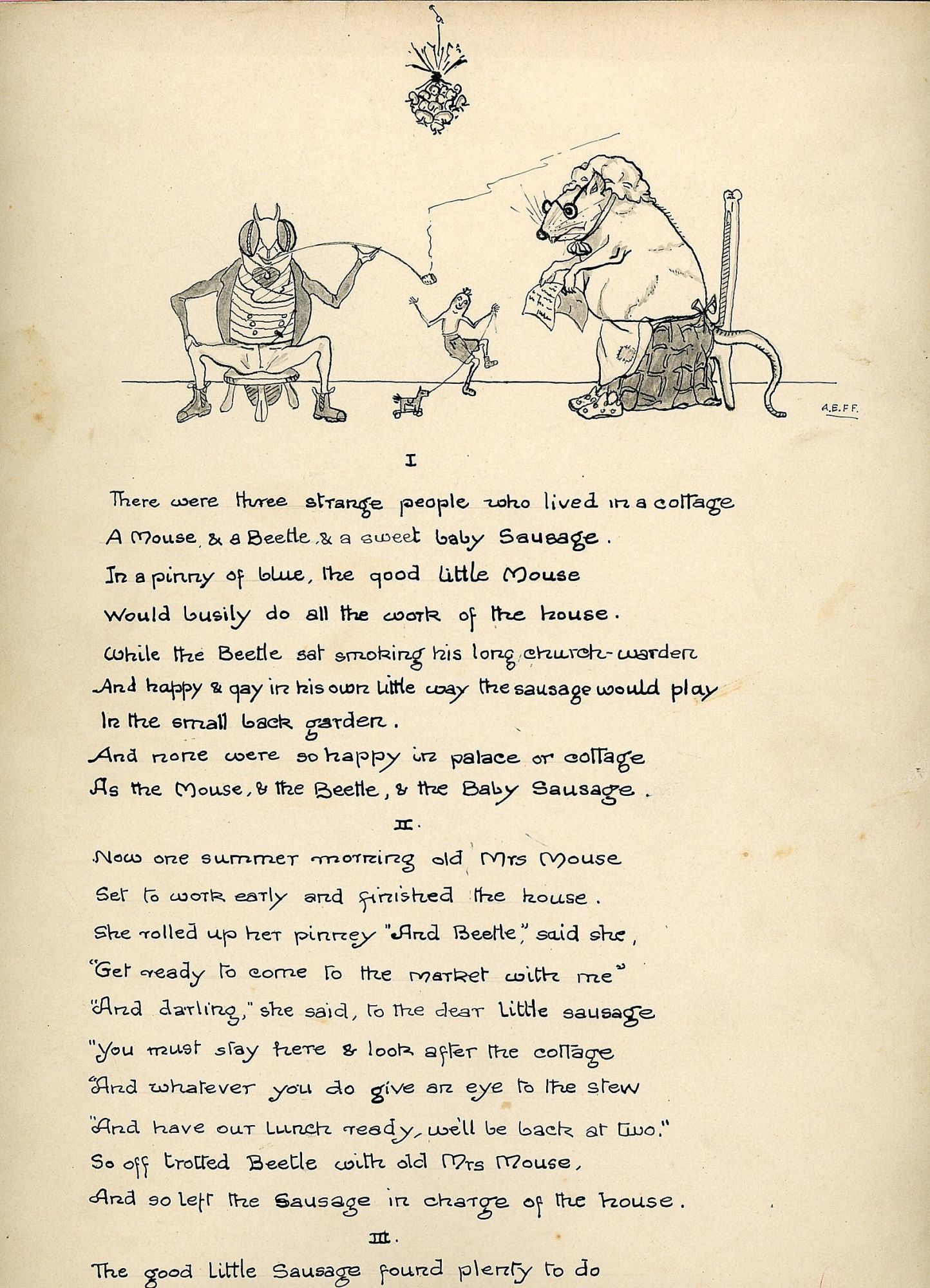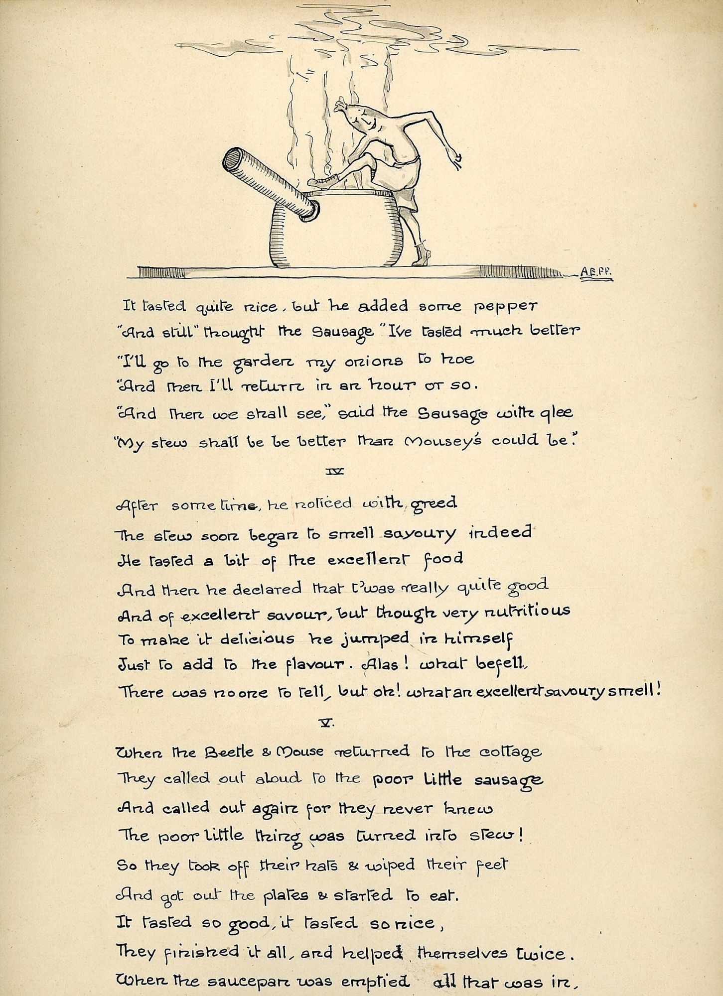 1930. Light surface soiling on margins.. Ten (10) original hand penned verses, each with charming relevant drawings. All are on a single 12" x 9" art board except for the tale of A Mouse and a Beetle and a sweet baby Sausage who lived together. This particular tale, written in five verses has a sad ending--something to do with ending up in the soup. The other verses are titled Finger Prints, Sunrise and Sunset, Naughty, My Sisters, When I go Hunting, Purple and Rings, There was an old woman, The Walk and A Sad Story.