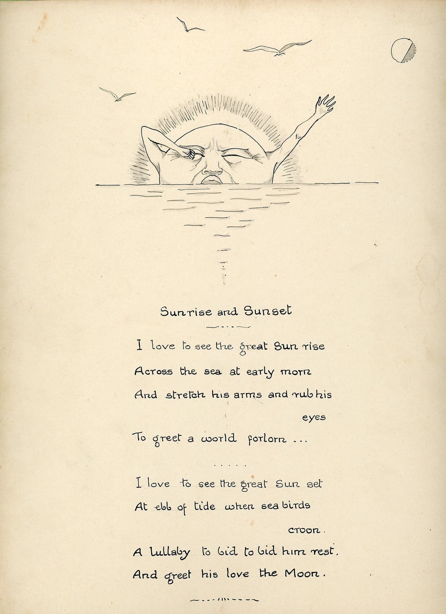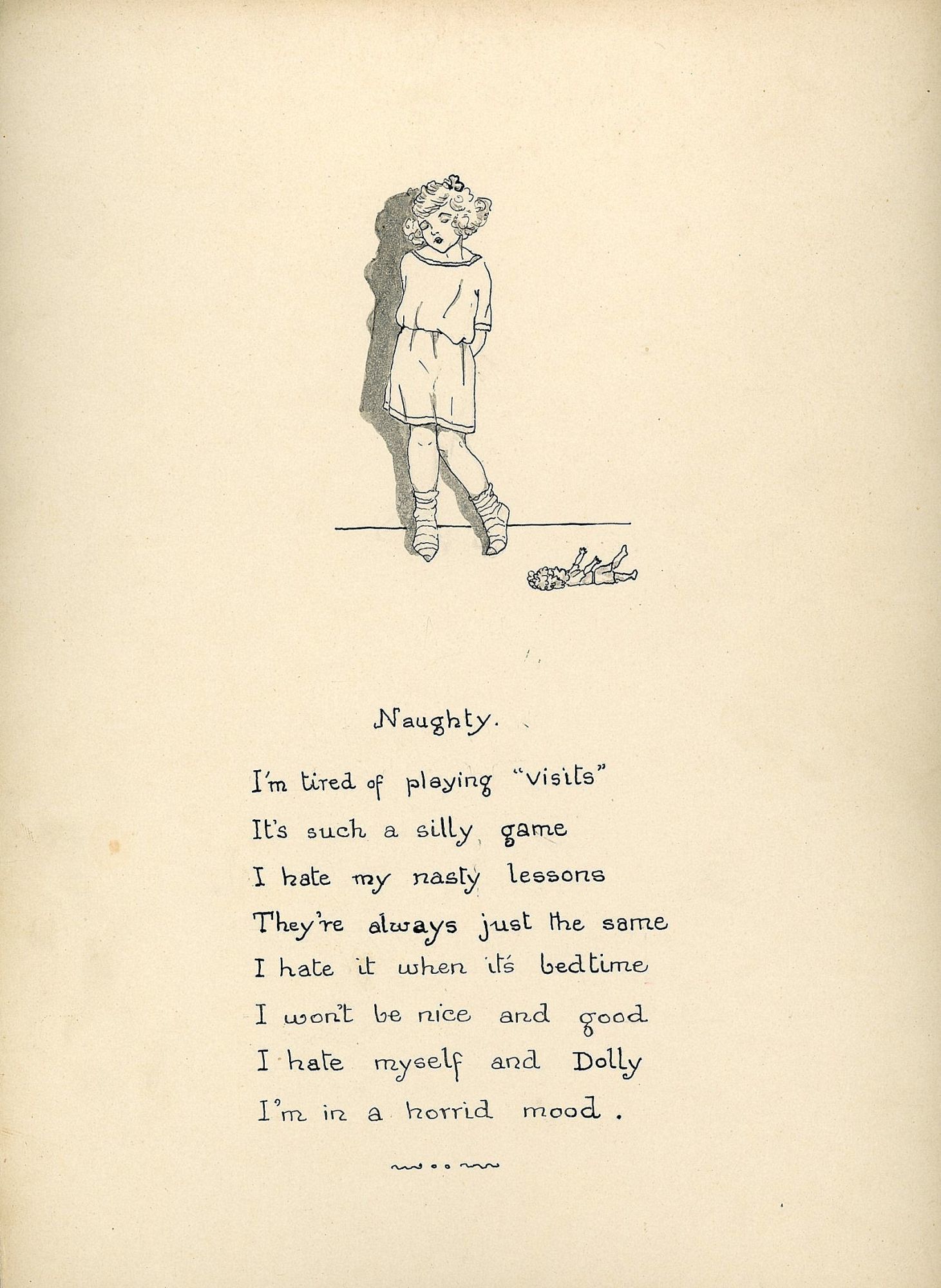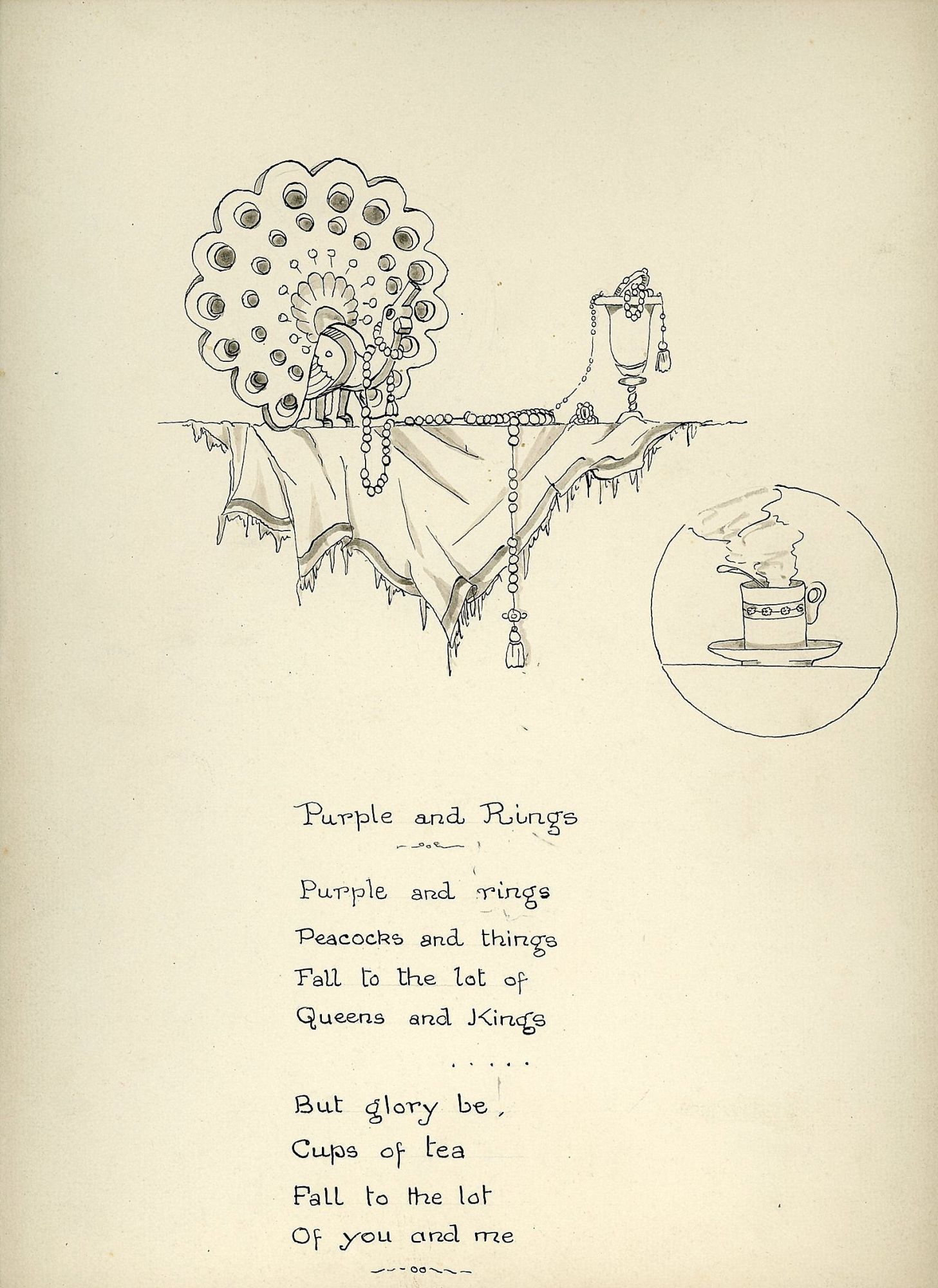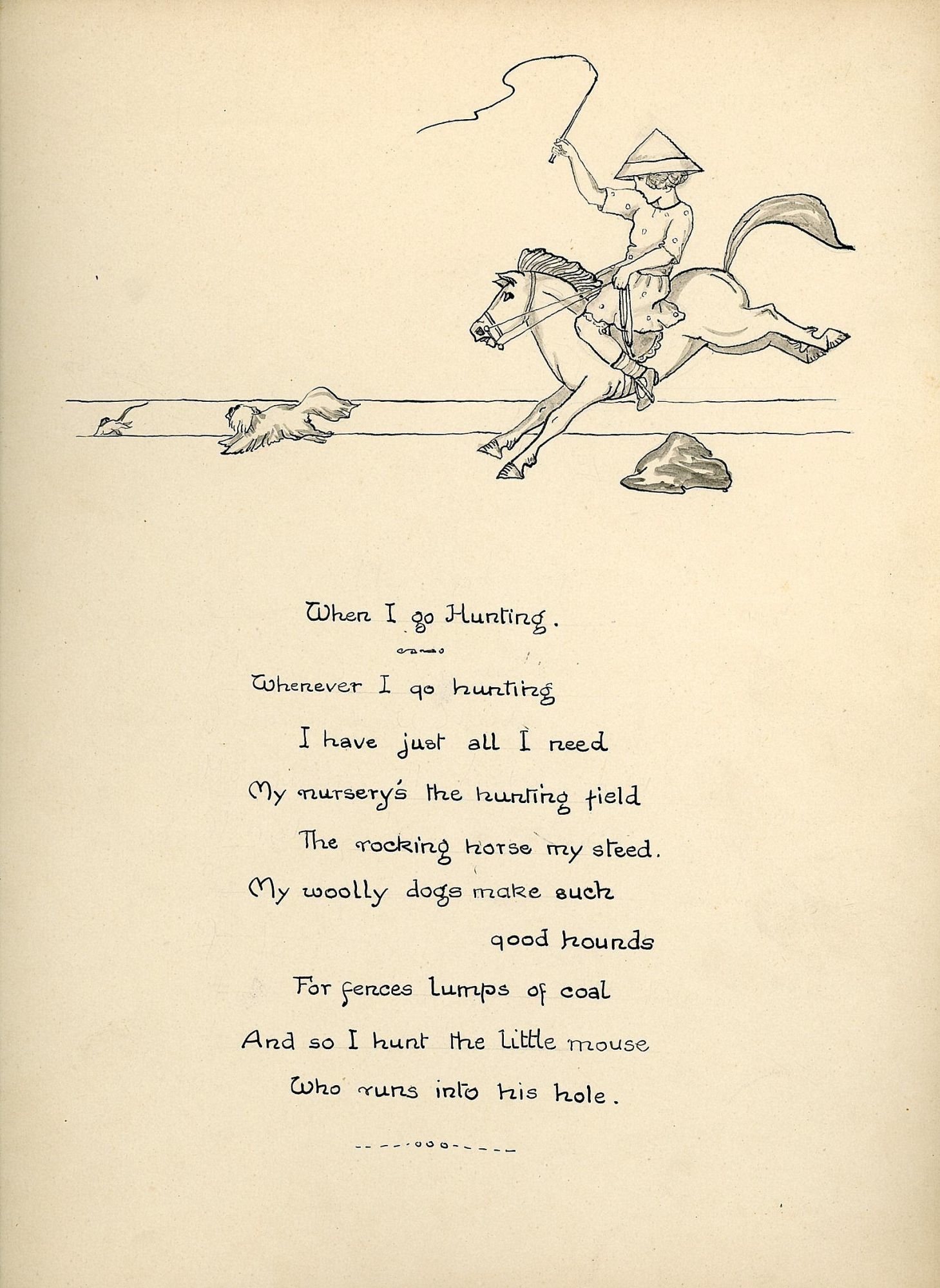 1930. Light surface soiling on margins.. Ten (10) original hand penned verses, each with charming relevant drawings. All are on a single 12" x 9" art board except for the tale of A Mouse and a Beetle and a sweet baby Sausage who lived together. This particular tale, written in five verses has a sad ending--something to do with ending up in the soup. The other verses are titled Finger Prints, Sunrise and Sunset, Naughty, My Sisters, When I go Hunting, Purple and Rings, There was an old woman, The Walk and A Sad Story.