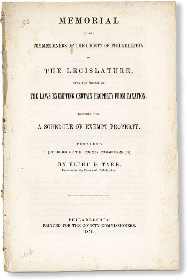 Philadelphia: Printed for the County Commissioners, 1851. First Edition. Octavo (22cm.); removed; 51pp. Light soil and spotting, else Very Good and sound. Tarr's text followed by the list of exempt property and organizations, among these the Abolition Society, cemeteries and burial grounds, and railroad and canal property. Uncommon. SABIN 61826.