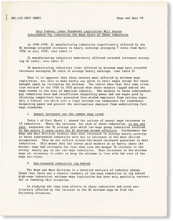 N.p.: AFL-CIO, [1958]. First Edition. Quarto (28cm); side-stapled self-wrappers; 3,[3]ll.; printed from typescript on rectos only. Fine condition. AFL-CIO Fact Sheet - Wage and Hour No. 3. Not separately catalogued in OCLC as of May, 2020.