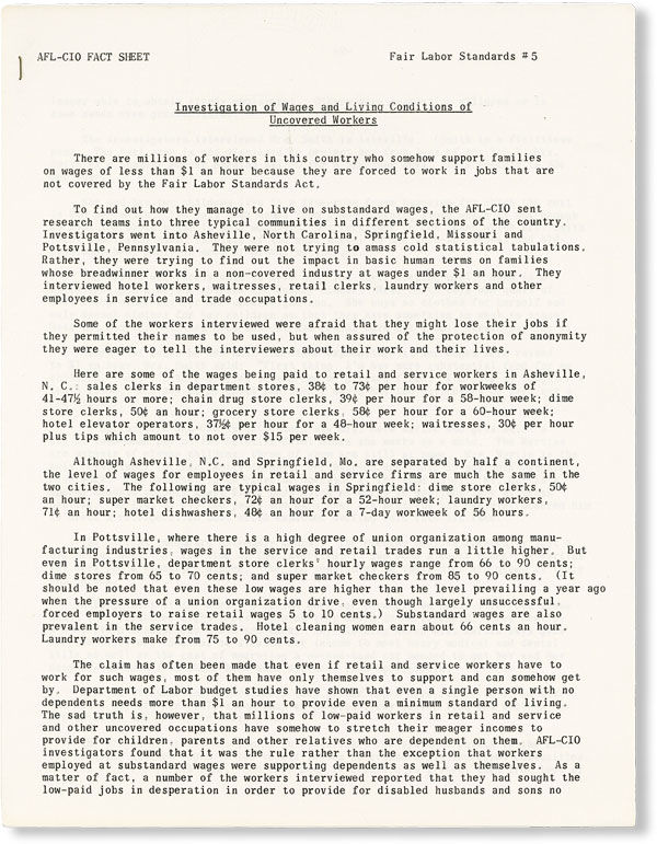 N.p.: AFL-CIO, [1957]. First Edition. Quarto (28cm.); side-stapled self-wrappers; 3ll.; printed from typescript on rectos only. Fine condition. AFL-CIO Fact Sheet - Fair Labor Standards No. 5. Not separately catalogued in OCLC as of May, 2020.