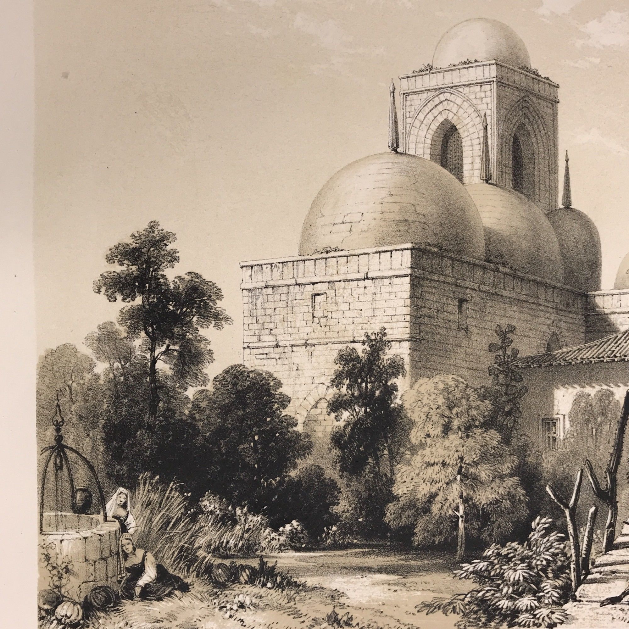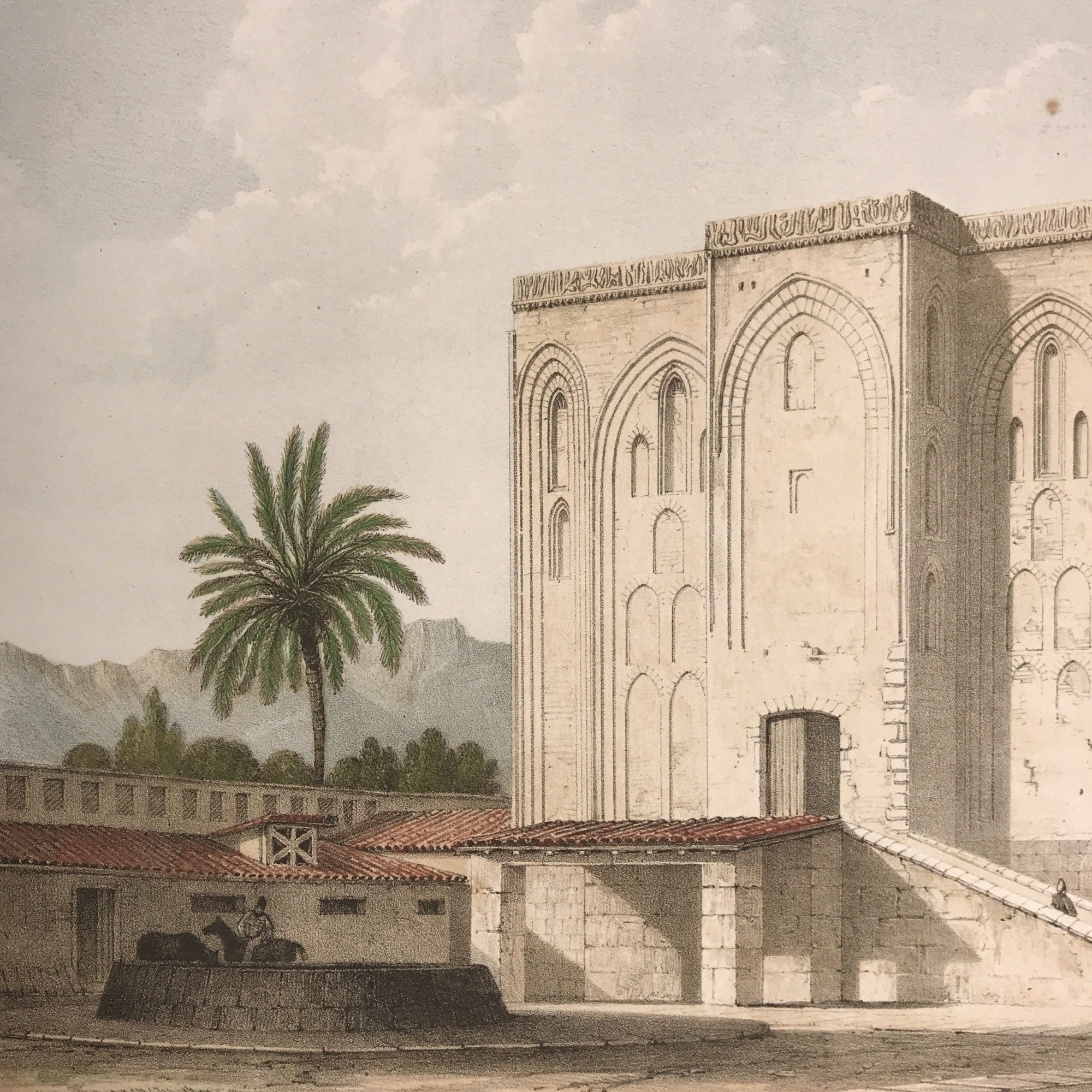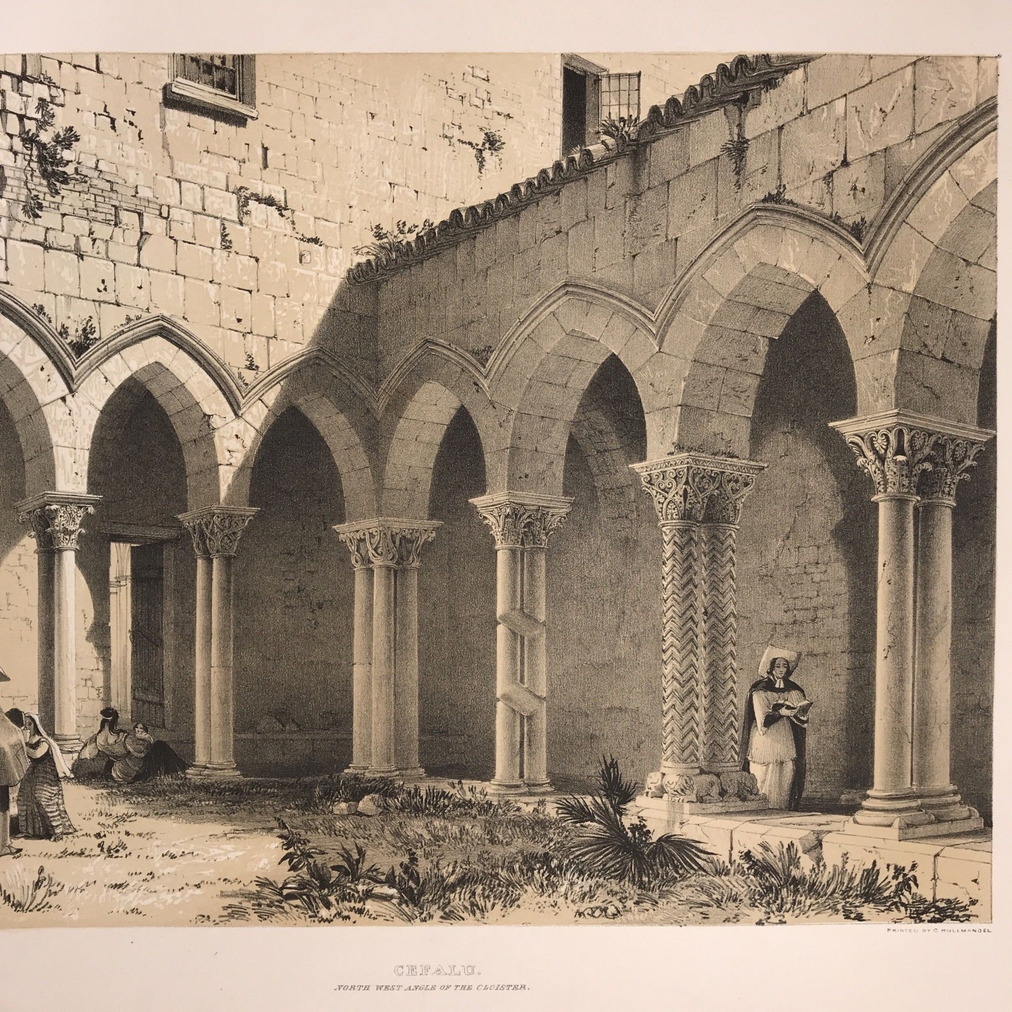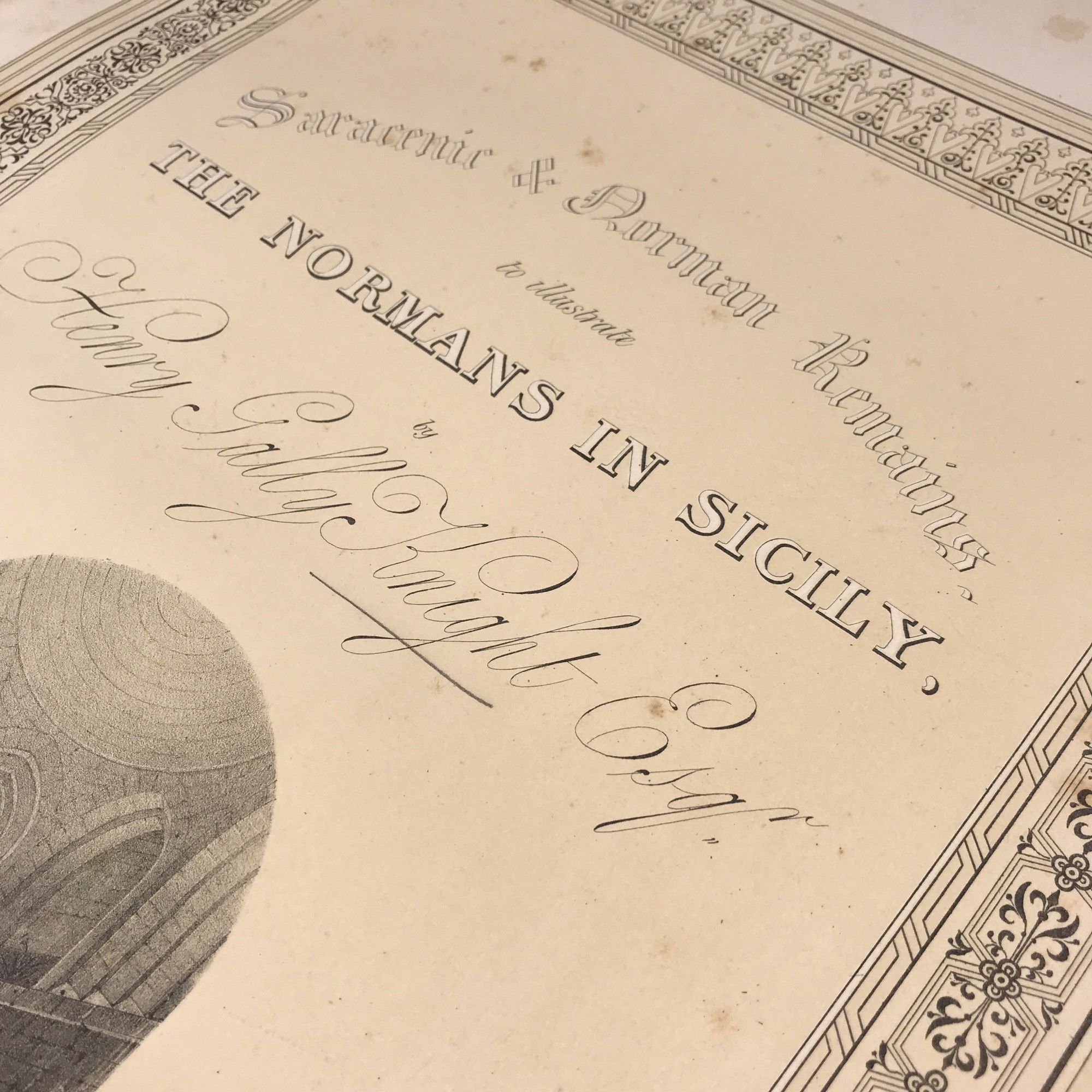 London: John Murray, 1840. An important album of illustrations showing landscapes and buildings made on site, following Henry Gally Knight’s 1838 work, “The Normans in Sicily.” There are thirty lithographic images, including the title page; twenty-seven are mostly tinted lithographs; three are hand-colored. The lithography is by Hullmandel; the three colored plates are engraved on steel after George Moore. “The drawings were taken from the buildings themselves by a professed architect.” “It is the object of this Work to afford a View of the Architecture of the Normans in Sicily, of the singular difference of the style they employed in Sicily, from that which they employed in any other country, and to explain how that difference arose.” [Preface]. ~~All the plates have guards, one of which has trivial loss. There is light foxing throughout, mostly but not entirely to the borders. In the original binding, half morocco over buckram, with an ornate morocco title label with elaborate gilt decoration. The spine, lettered in gilt, has been discreetly patched.~.