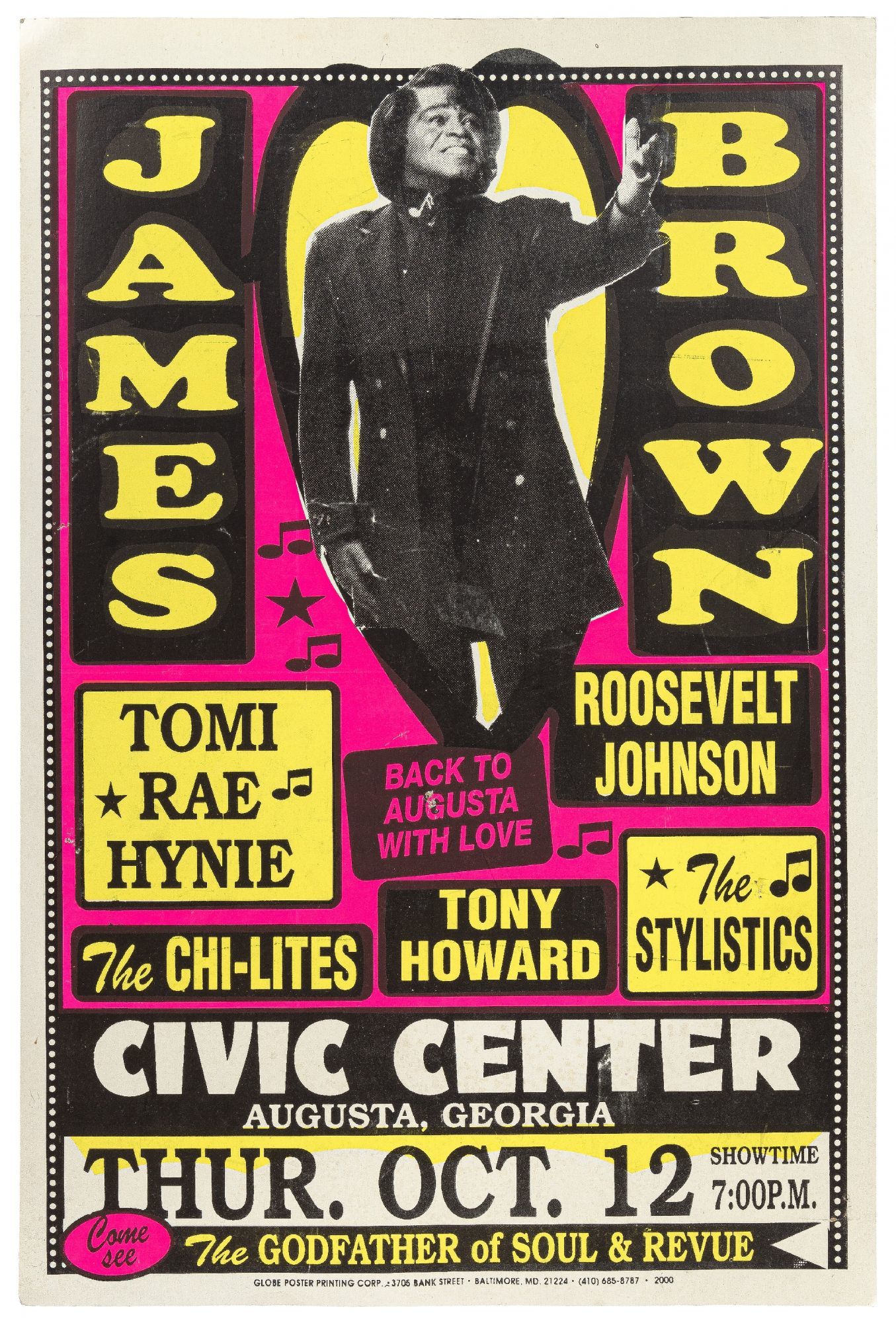 Baltimore: Globe Poster Printing Corp, 2000. Unbound. Near Fine. Large boxing-style poster. Approximately 18" x 32½". Screen printed in pink, yellow, and black on thin white poster cardstock with a photographic image of Brown in the upper center. A few small staple holes from where the poster was hung, else about fine. Poster for a show headlined by James Brown at the Civic Center in Augusta, Georgia. A bright and colorful example.