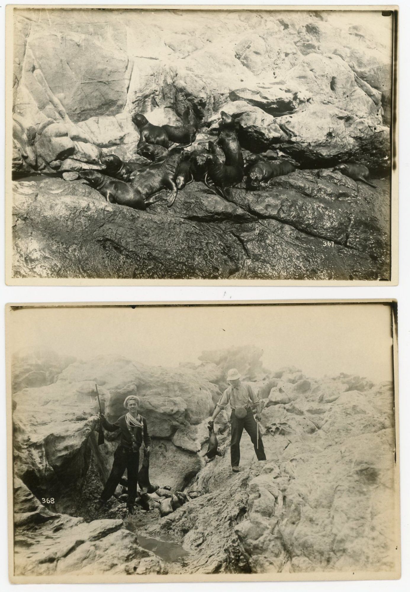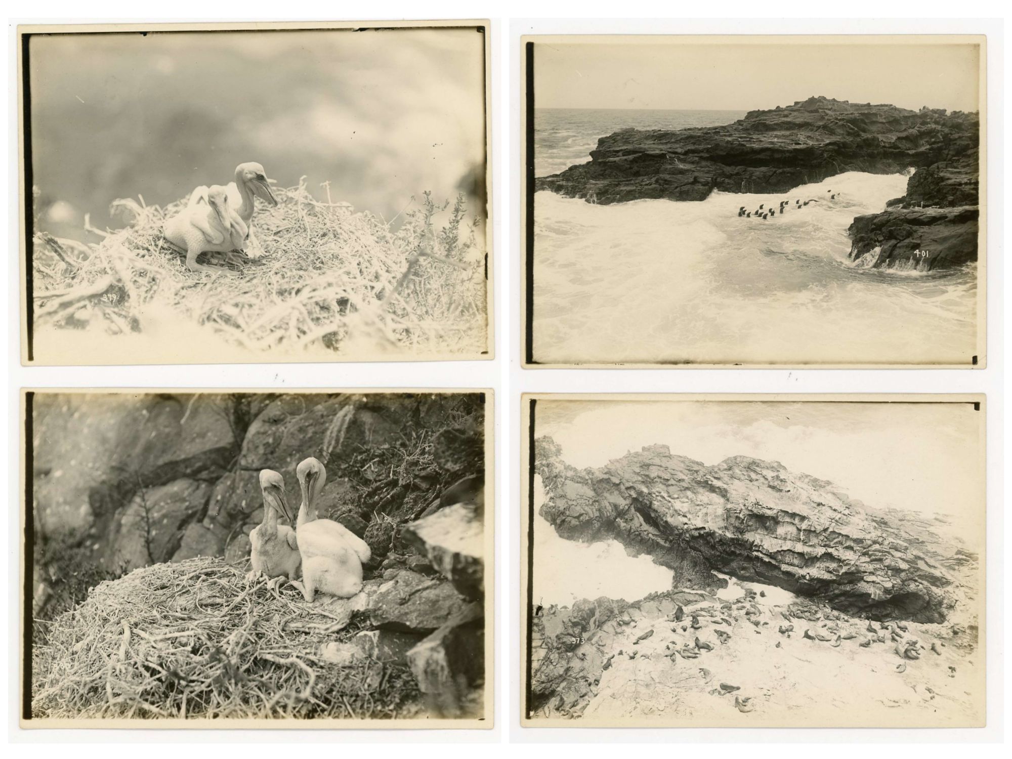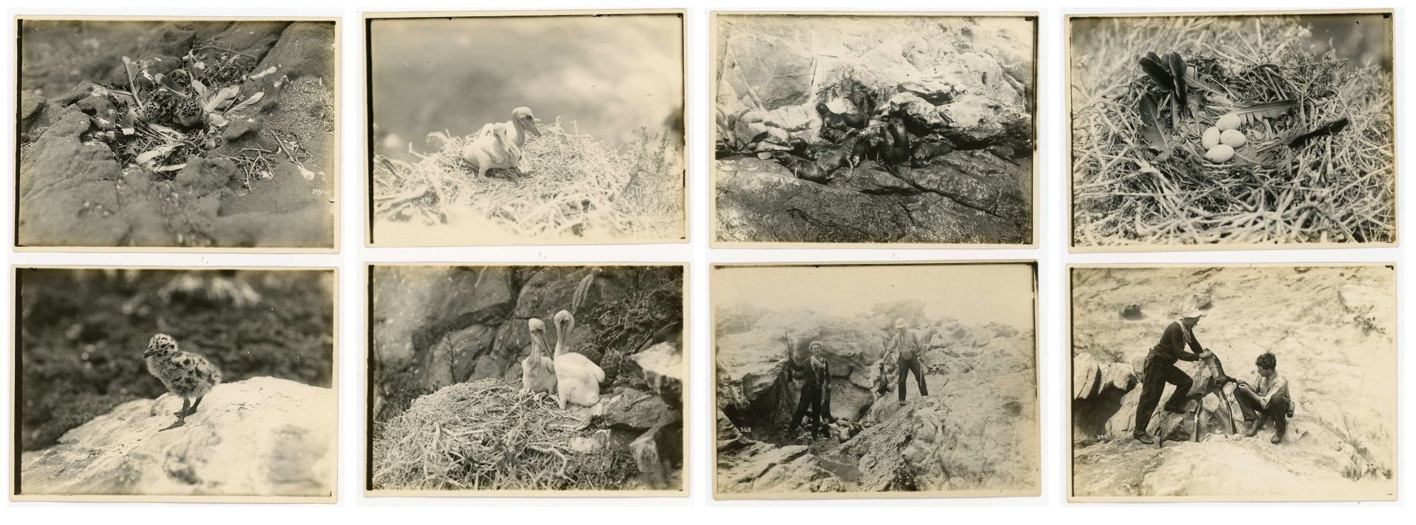 1915. A series of 37 photographs, hand numbered on the reverse, chronicling a visit to Coronado Island off San Diego. The first image is approaching the uninhabited island followed by an image of their boat and then two young men approaching the rocks with a row boat and portaging the boat to land. Various pictures of the men atop rocks and other perches. A few images of water crashing on the rocks followed by a distance and close-up images of a large flock of cormorants on a rock and an individual on a nest and the nest with eggs and another with baby chicks at different ages. This is followed by another series of baby bird images. There is an image of a rock shaped as an alligator. The collection concludes with seals and unfortunately a seal hunt and their catch. Each measures 5" x 7". Numbered either lower left or right. There are no identifying marks on the photographs, however they were found in a plain brown wrapper with a note "Pictures given to Mother by Andrew Thill in early 1900s. Pictures of Coronado Islands off San Diego.