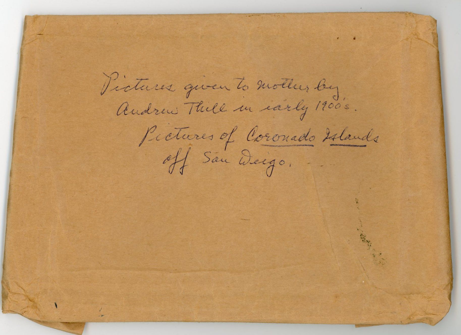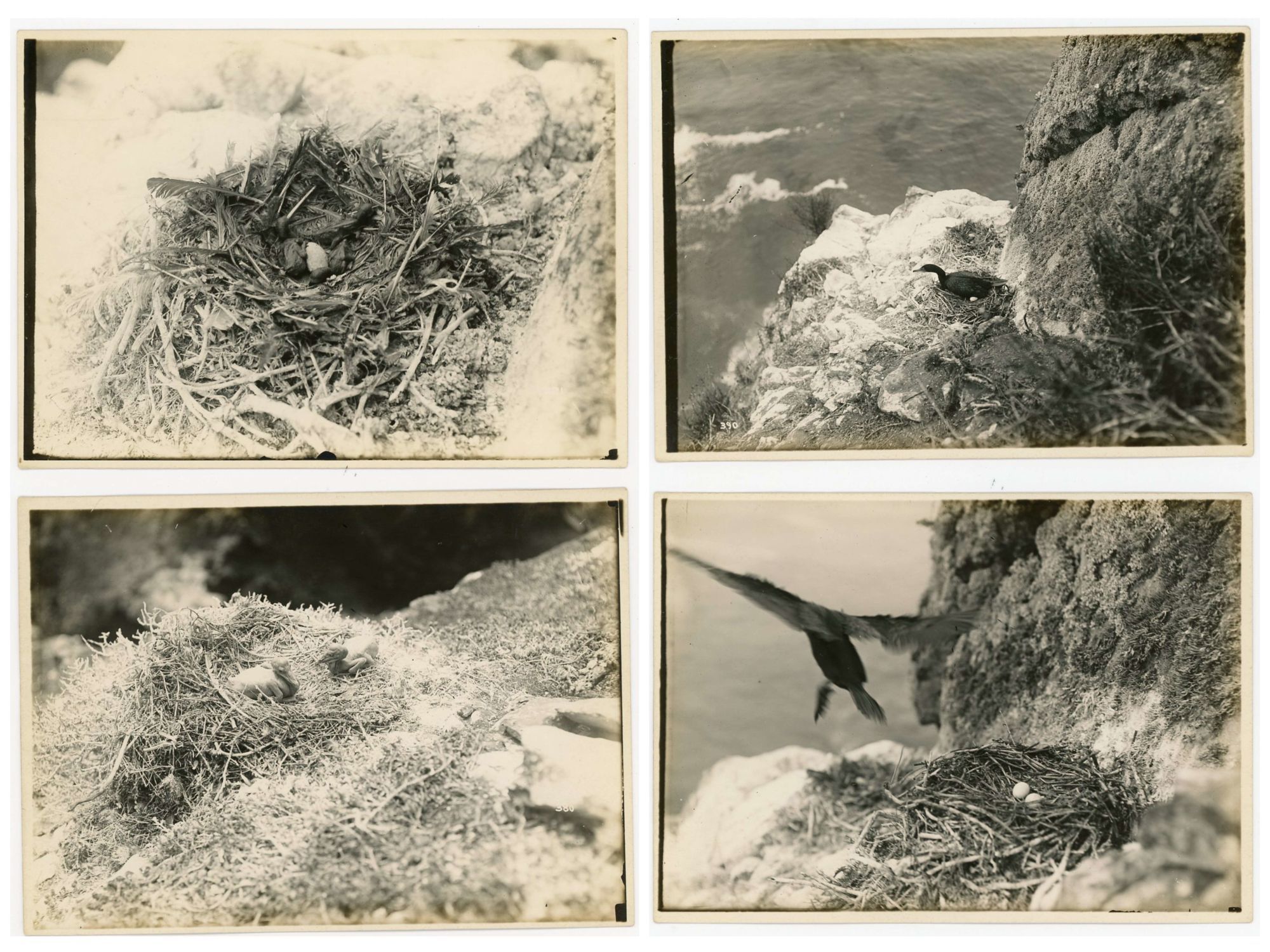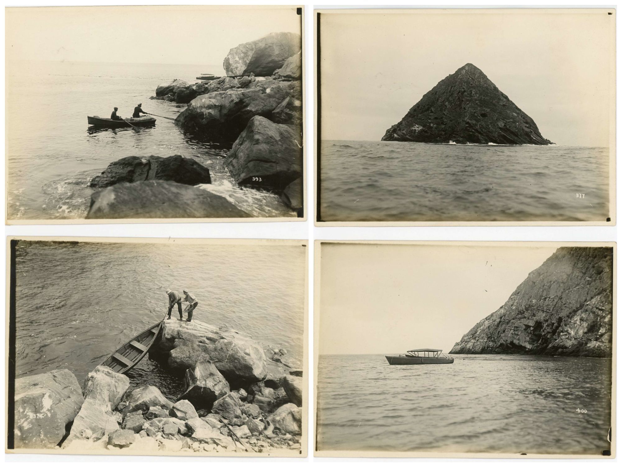 1915. A series of 37 photographs, hand numbered on the reverse, chronicling a visit to Coronado Island off San Diego. The first image is approaching the uninhabited island followed by an image of their boat and then two young men approaching the rocks with a row boat and portaging the boat to land. Various pictures of the men atop rocks and other perches. A few images of water crashing on the rocks followed by a distance and close-up images of a large flock of cormorants on a rock and an individual on a nest and the nest with eggs and another with baby chicks at different ages. This is followed by another series of baby bird images. There is an image of a rock shaped as an alligator. The collection concludes with seals and unfortunately a seal hunt and their catch. Each measures 5" x 7". Numbered either lower left or right. There are no identifying marks on the photographs, however they were found in a plain brown wrapper with a note "Pictures given to Mother by Andrew Thill in early 1900s. Pictures of Coronado Islands off San Diego.