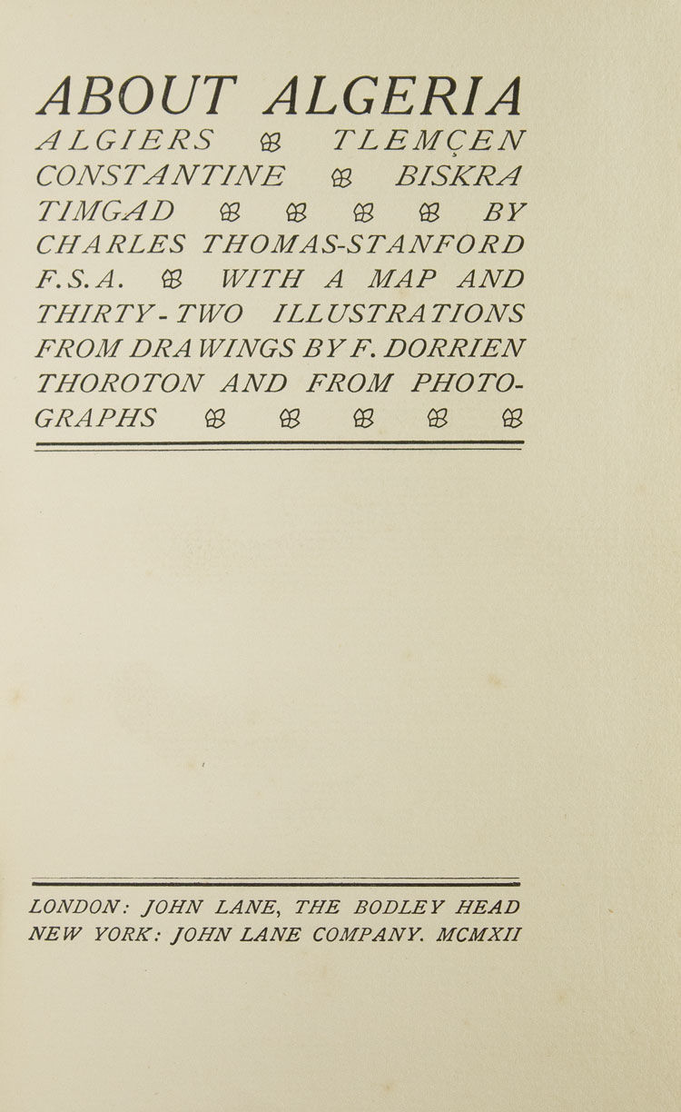 About Algeria; Algiers, Tlemçen, Constantine, Biskra, Timgad, by Charles Thomas-Stanford, F. S. A. With a map and thirty-two illustrations from drawings by F. Dorrien Thoroton and from photographs
