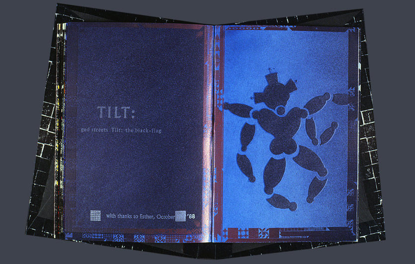 Each new line of the poem is revealed between black flags, the flags being arranged to suit the disposition of the line that they enclose. A decorative border is used to re-affirm the rectilinear nature of the page to counter what I did to the cover, which was to make it tilted and disturbed.