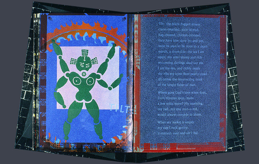 While in Zürich I walked into the Museum Rietberg and up to a statue of Shiva, with limbs hanging out in funny angles, and lightning in his/her hair, all in a big wheel of fire. I can remember the statue saying to me, 'I'm coming into your book.' I thought, what the hell has Shiva got to do with this book about a 'Storm Song' and the Whitby steps and black flags? And I thought, well, I'll do as I'm told, as ever. The following morning at breakfast I drew the figure of Shiva, with breasts, and realised it was a puppet that I was going to dismantle. I made a puppet out of zinc pieces; it is disassembled from the right-hand page by repeatedly having a piece of its body nominated by a decorative silver star. Each piece is removed and replaced on the left-hand page. Alongside this cycle of nomination, removal and redisposition, the poem accumulates line by line. In this way Shiva is removed from the wheel of fire of the material world on the right, and repositioned and rebuilt in a calmer place on the left.