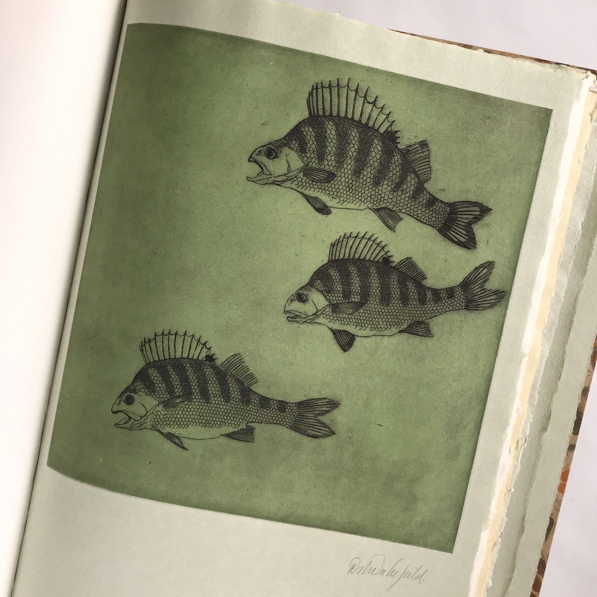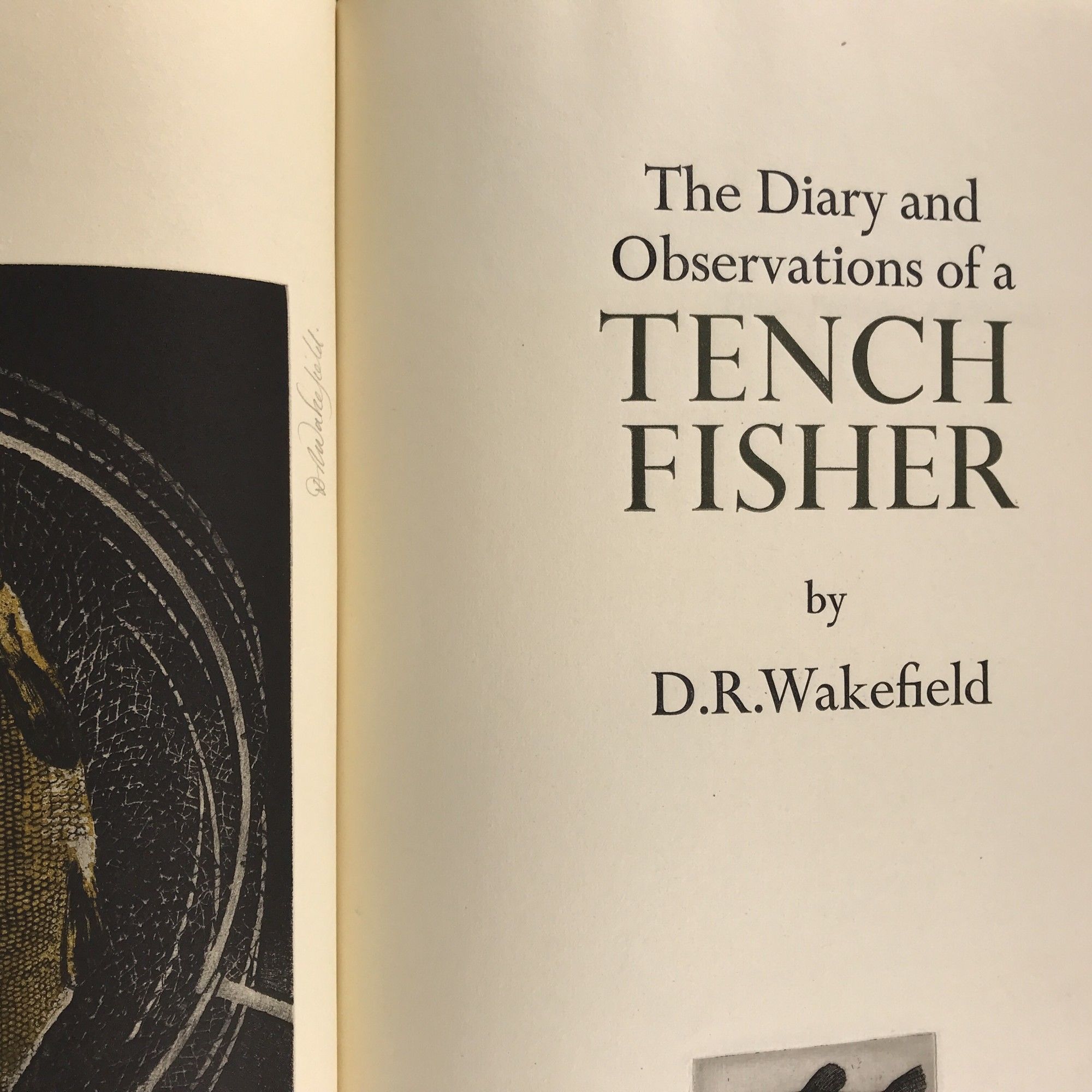 Devon: The Chevington Press, 1981. Limited Edition, numbered 23 of 50 copies. Quarter Leather. Near Fine binding. Signed by Wakefield below the colophon. 6 full page signed etchings along with 8 smaller etched head and tail pieces; exquisite work backed in tan calf with marbled paper over boards and an engraved title pastedown with etching on the upper cover. This is a recollection of the artist's fishing trips in the few years preceding publication. Tench Fisher is Wakefield's first book, closely followed with a more modest but equally impressive revision of Cutcliffe's classic, The Art of Trout Fishing on the Rapid Streams (1982). Wakefield studied under Leonard Baskin and his influence can be seen in Wakefield's early work. Near Fine binding.