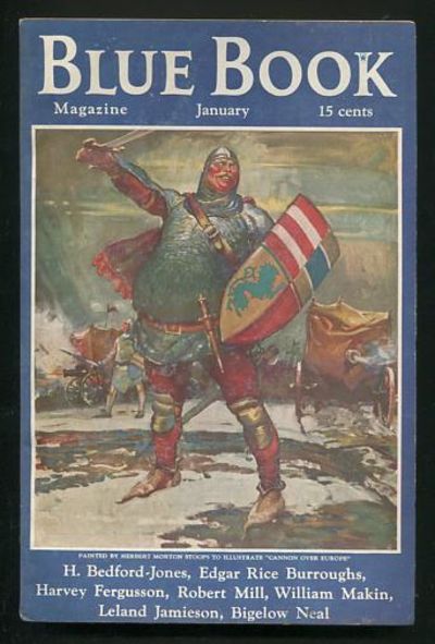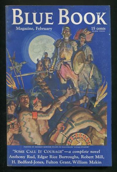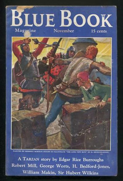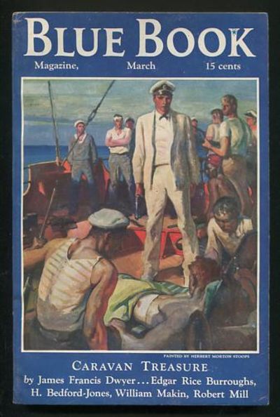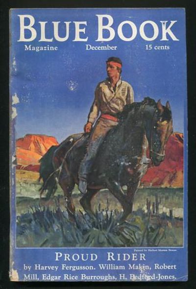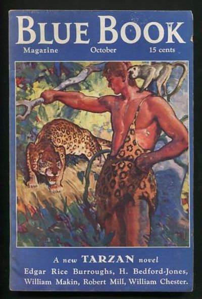 New York: The McCall Company. Very Good. 1935-1936. (Vol. 61, No. 6 - Vol. 62, No. 5). Magazine. [a solid Very Good on average (several issues would individually grade Near Fine), with the only serious condition problems being some soiling and surface damage along the spine and lower rear cover of the December 1935 issue, and a couple of surface scrapes/blemishes on the front cover of the November 1935 issue]. These six issues of The Blue Book Magazine contain the first appearance of Burroughs's "Tarzan and the Immortal Men," published in hardcover and subsequently known as "Tarzan's Quest," presented in monthly installments from October 1935 (Vol. 61, No. 6) through March 1936 (Vol. 62, No. 5). The text illustrations for the Burroughs novel are by Frank Hoban, although the one cover (for the opening installment) that depicts Tarzan himself was painted by the magazine's regular cover illustrator at that time, Herbert Morton Stoops. This presents a rare opportunity to examine this "Tarzan" adventure in its original context, as each issue is complete with the many other stories and features for which this popular magazine was known. .