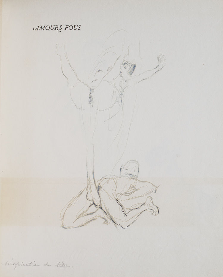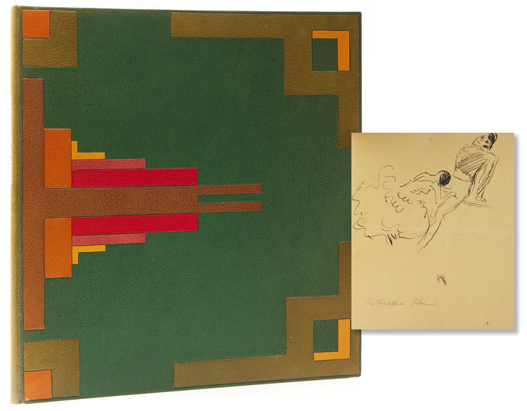 1920. 20 pen and ink drawings on various sized papers (including tissue paper, note paper, and the verso of menus), none larger than 8 x 10 inches, each tipped to a stub and bound in an album. Art Deco binding, possibly by Honegger, with morocco inlays of red, rose, tan, brown, yellow, and orange on a green morocco background, gilt titling on spine, green coated endpapers. Spine and portions of rear cover faded. 20 pen and ink drawings on various sized papers (including tissue paper, note paper, and the verso of menus), none larger than 8 x 10 inches, each tipped to a stub and bound in an album. Provenance: Gérard Nordman (booklabel)