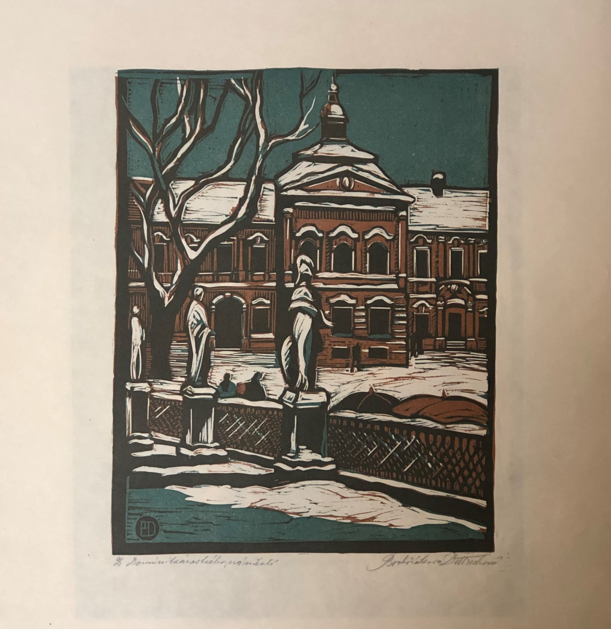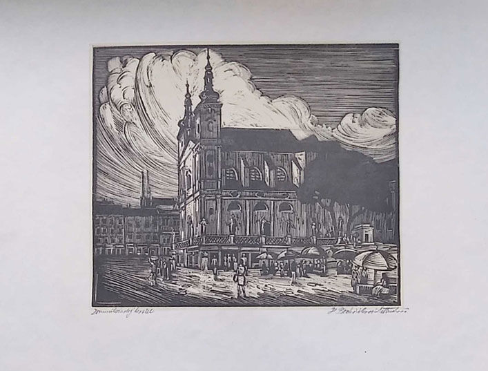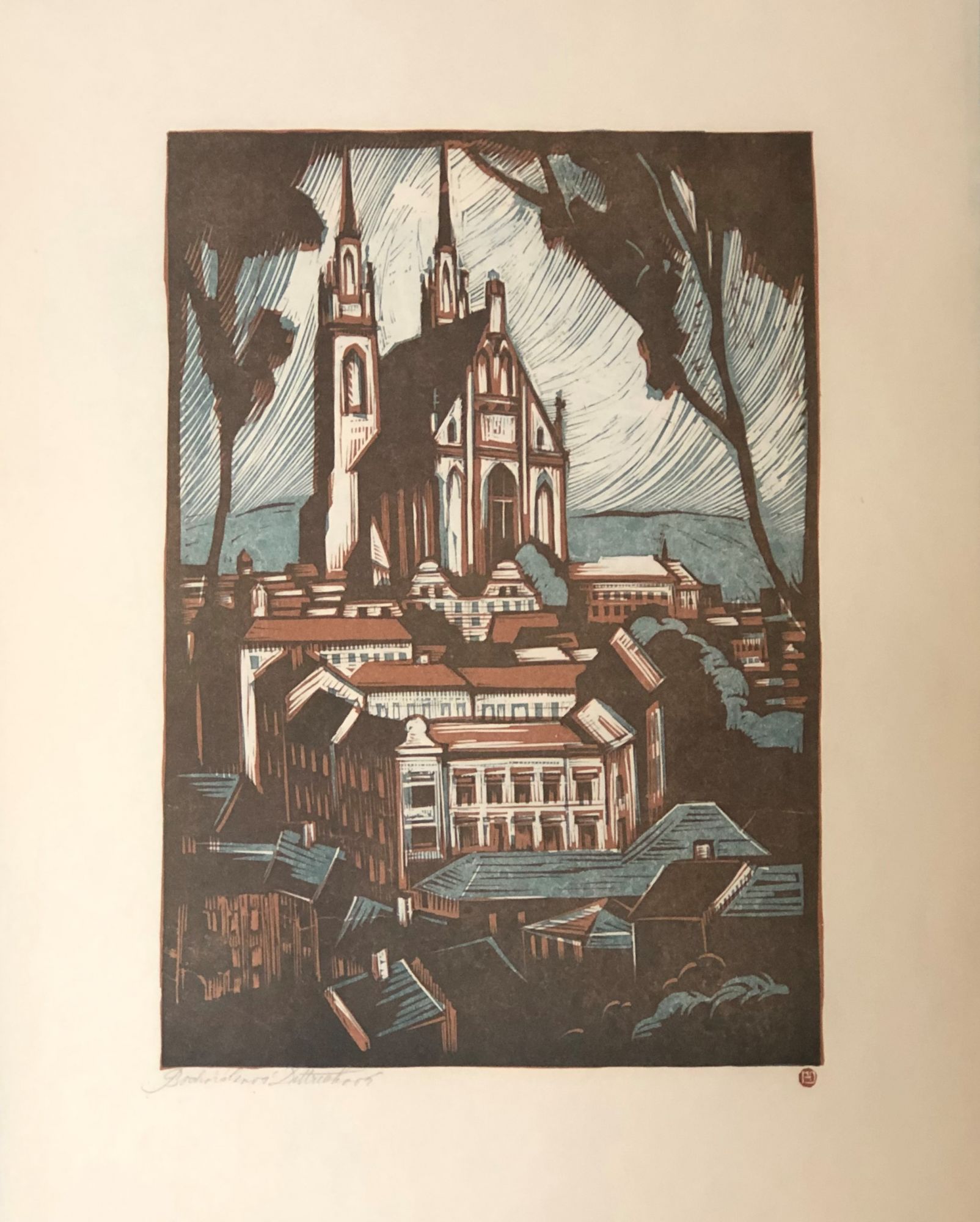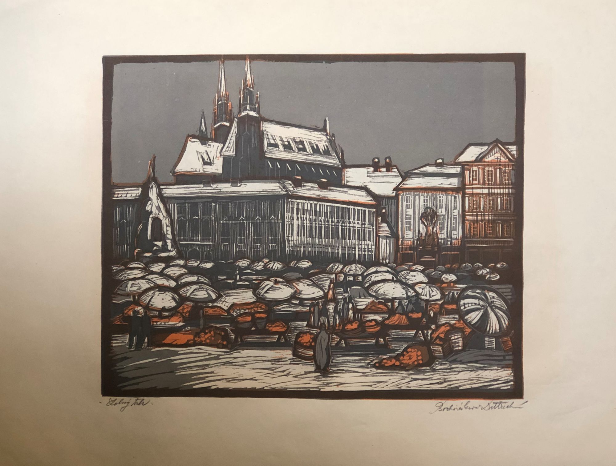 [Brno]: [Graficky klub pro Moravu]. First edition. Fine. Four original color woodcut prints [15" x 20"], each signed, in later portfolio. A suite of 4 beautiful prints depicting the city in which the artist spent most of her life. Helena Bochorakova-Dittrichova (1894-1980) was the first female wordless novelist and the only woman to work in this medium during its heyday. She was born in the Moravian region of what is now the Czech Republic and spent most of her life in Brno, the Moravian capital. She graduated from the Academy of Fine Arts in Prague and in 1923 received a government scholarship to study printmaking in Paris. Bochorakova-Dittrichova's unpublished wordless novel Malirka Na Cestach [The Artist on Her Journey] recounts this period in her life. In Paris, she first encountered the wordless novels of Flemish artist Frans Masereel, the originator of the form, and was inspired to create her own. Over the course of her long career, Bochorakova-Dittrichova published several wordless novels, along with travelogues and historical works. She also worked as a printmaker and illustrator, and was highly regarded in her native land, though largely unknown elsewhere. This changed in 2014, when the National Museum of Women in the Arts held an exhibition of her work entitled "The First Woman Graphic Novelist: Helena Bochorakova-Dittrichova," and this important artist finally began to gain global recognition. Her work, however, is still not widely available.
