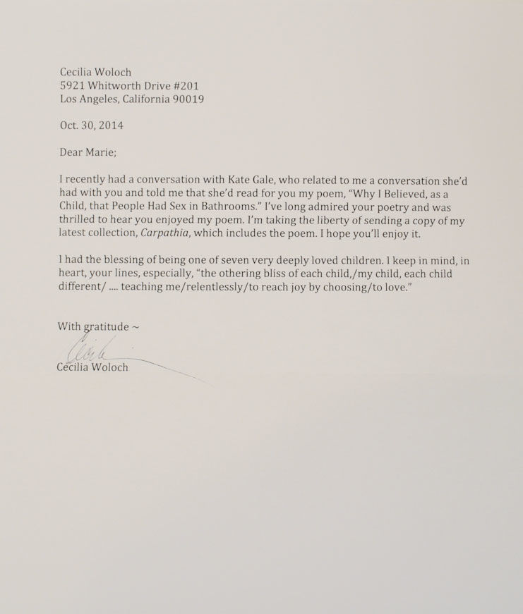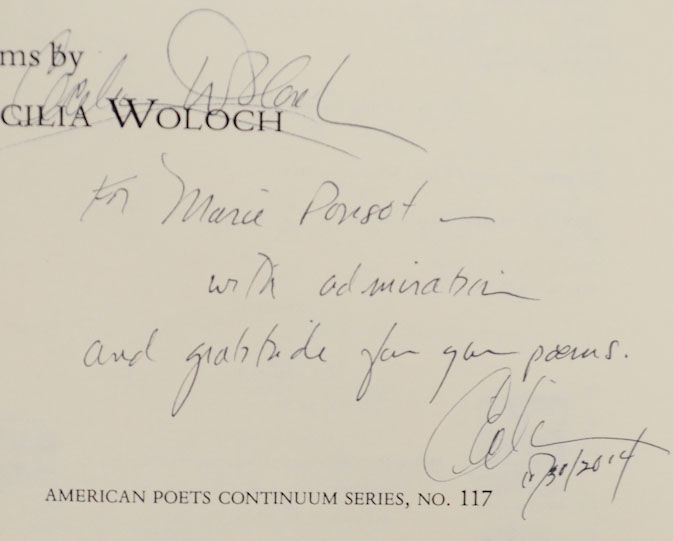 Rochester, NY: BOA Editions, Ltd, 2009. Second printing. Softcover. 83 pages. A collection of poems. A near fine copy in wrappers. Signed and inscribed by Woloch on the title page to fellow poet Marie Ponsot on the title page. Also includes a laid in signed letter from Woloch to Ponsot as well. Uncommon signed.