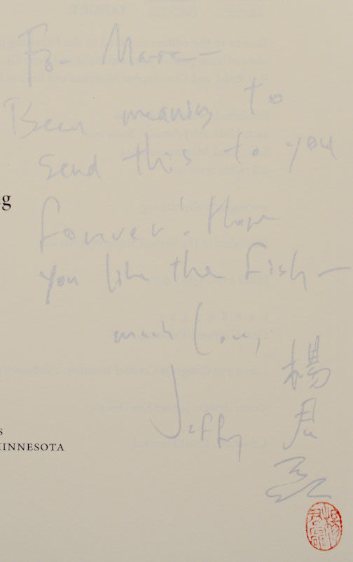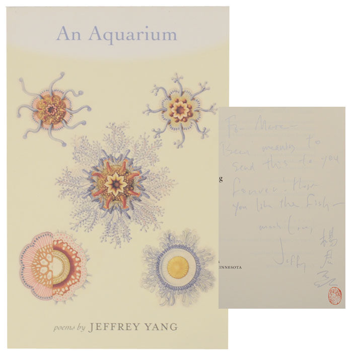 Saint Paul, MN: Graywolf Press, 2008. First edition. Softcover. 63 pages. Yang's first collection of poems. A fine copy in wrappers. Signed and warmly inscribed by Yang to fellow poet Marie Ponsot on the title page and with his chop as well.
