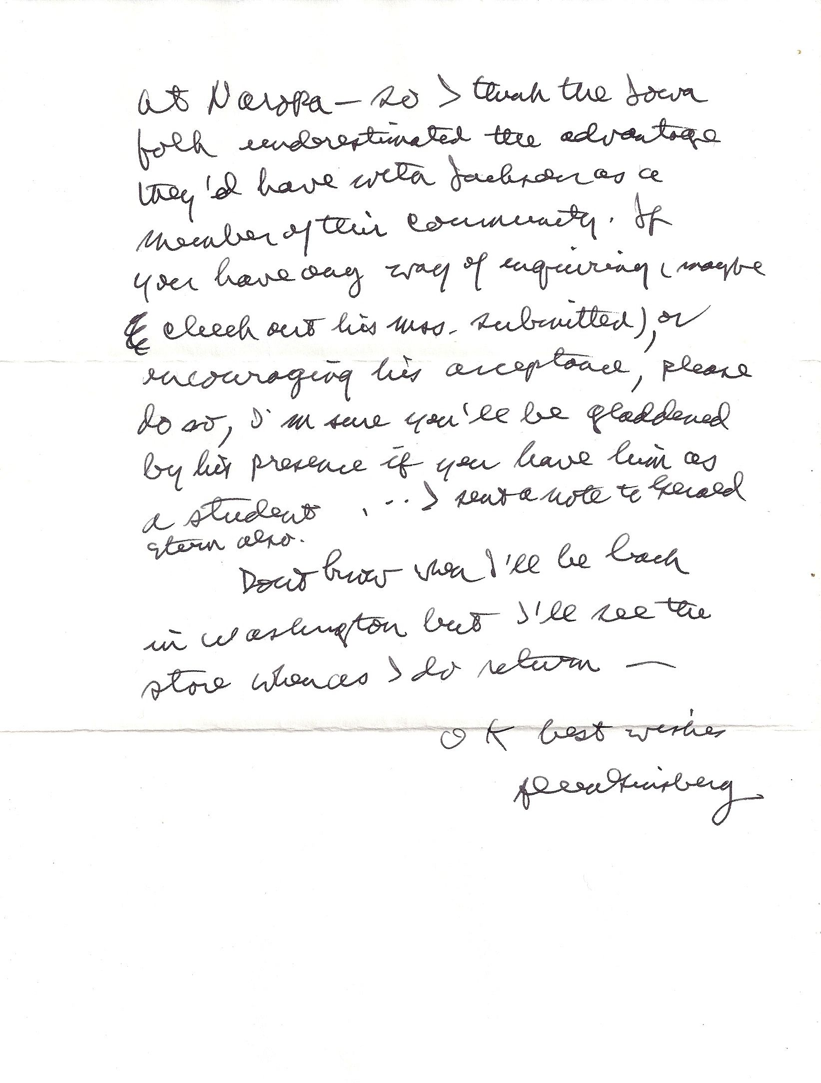 New York, 12 March 1988. First Edition. Hardcover. But for the mailing folds the letter is Fine with very dark and clear writing. The book is Near Fine in a Near Fine dustwrapper. A two-page handwritten letter on separate sheets SIGNED by Ginsberg to the writer Doris Grumbach asking for her assistance in getting one of his students, Brian Jackson, into the Iowa Writer's Workshop where she was a teacher at the time. The letter is tucked into a First Edition of Barry Miles's biography of Ginsberg, SIGNED by Grumbach at the bottom of the front endpaper. The letter begins: "An excellent student of mine, Corso's, Burroughs' & Anne Waldman's at Naropa several years ago went on to get his BA in Classics inspired by his study of Pound, & continued some postgraduate Greek & Latin.... Jackson is a remarkable scholar poet and extraordinarily active person -- he worked as Gregory Corso's unpaid secretary, as studious friend, classic disciple with good manners -- for several years & was my T.A. often at Naropa."