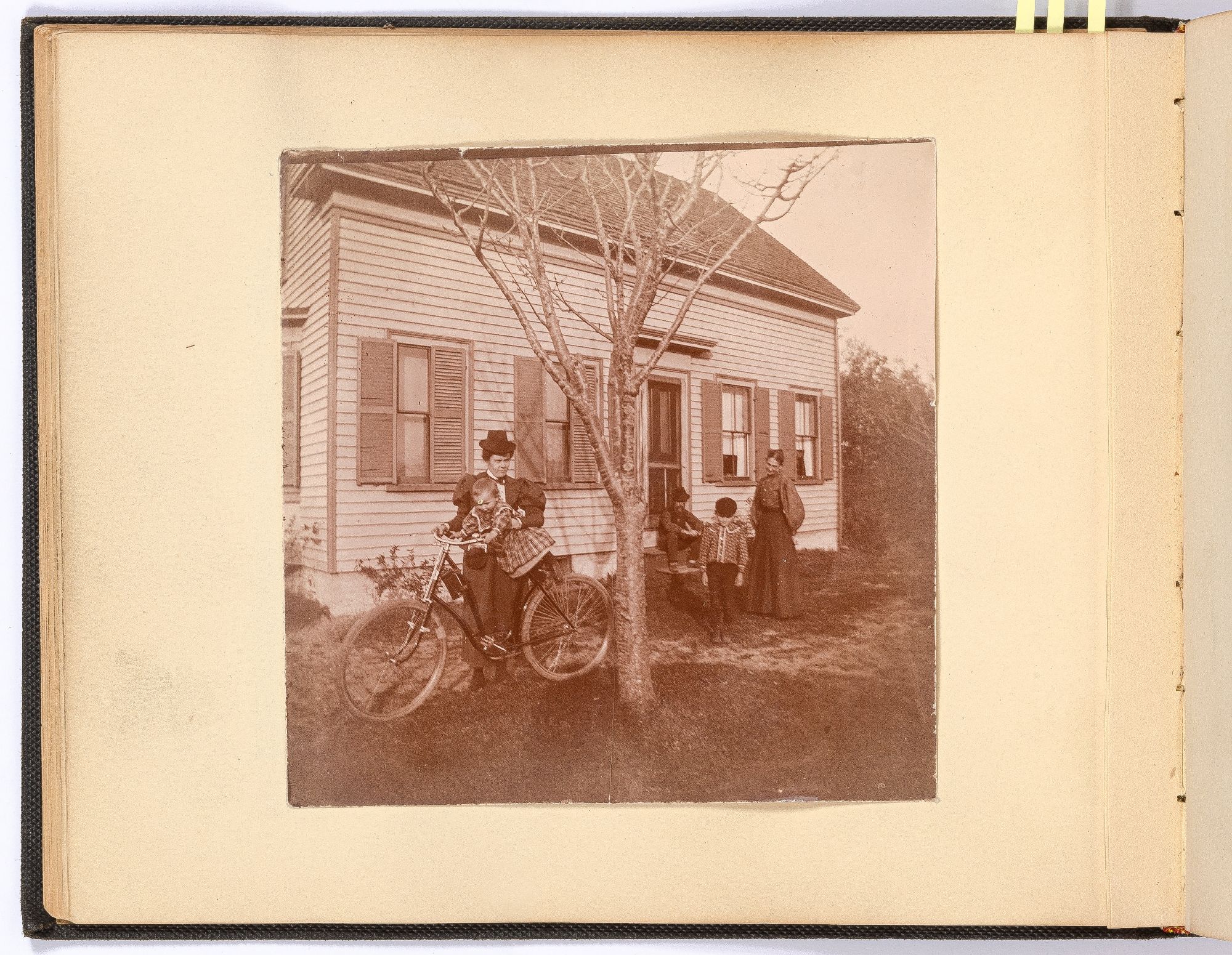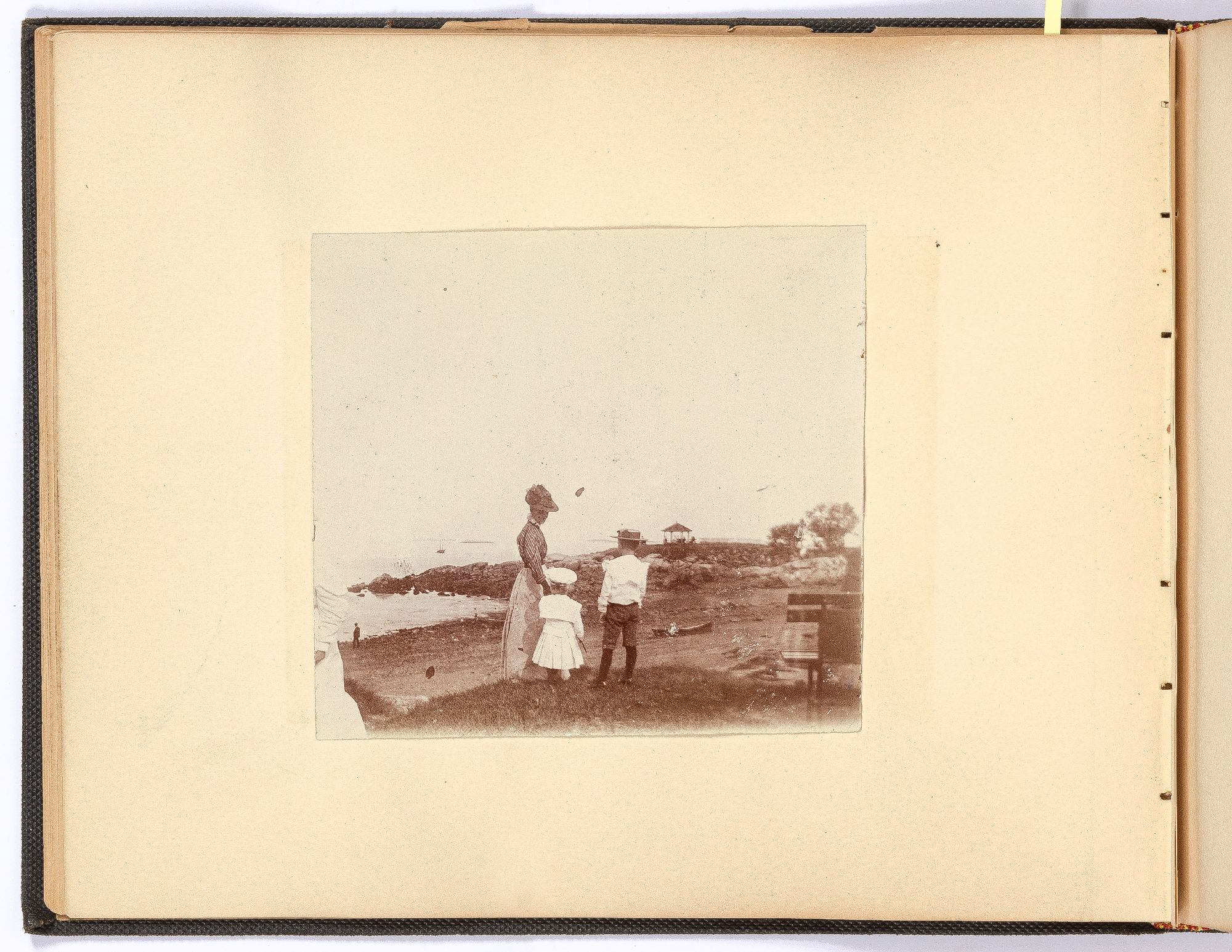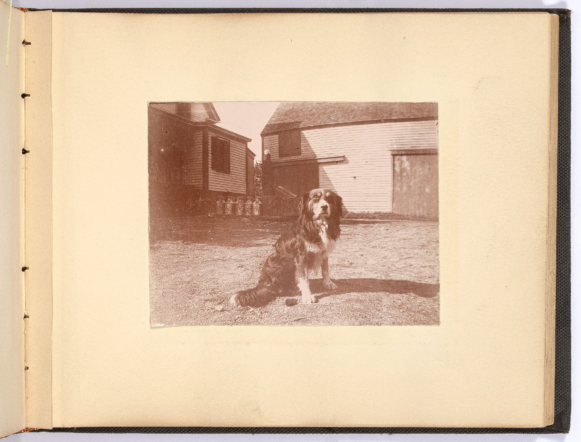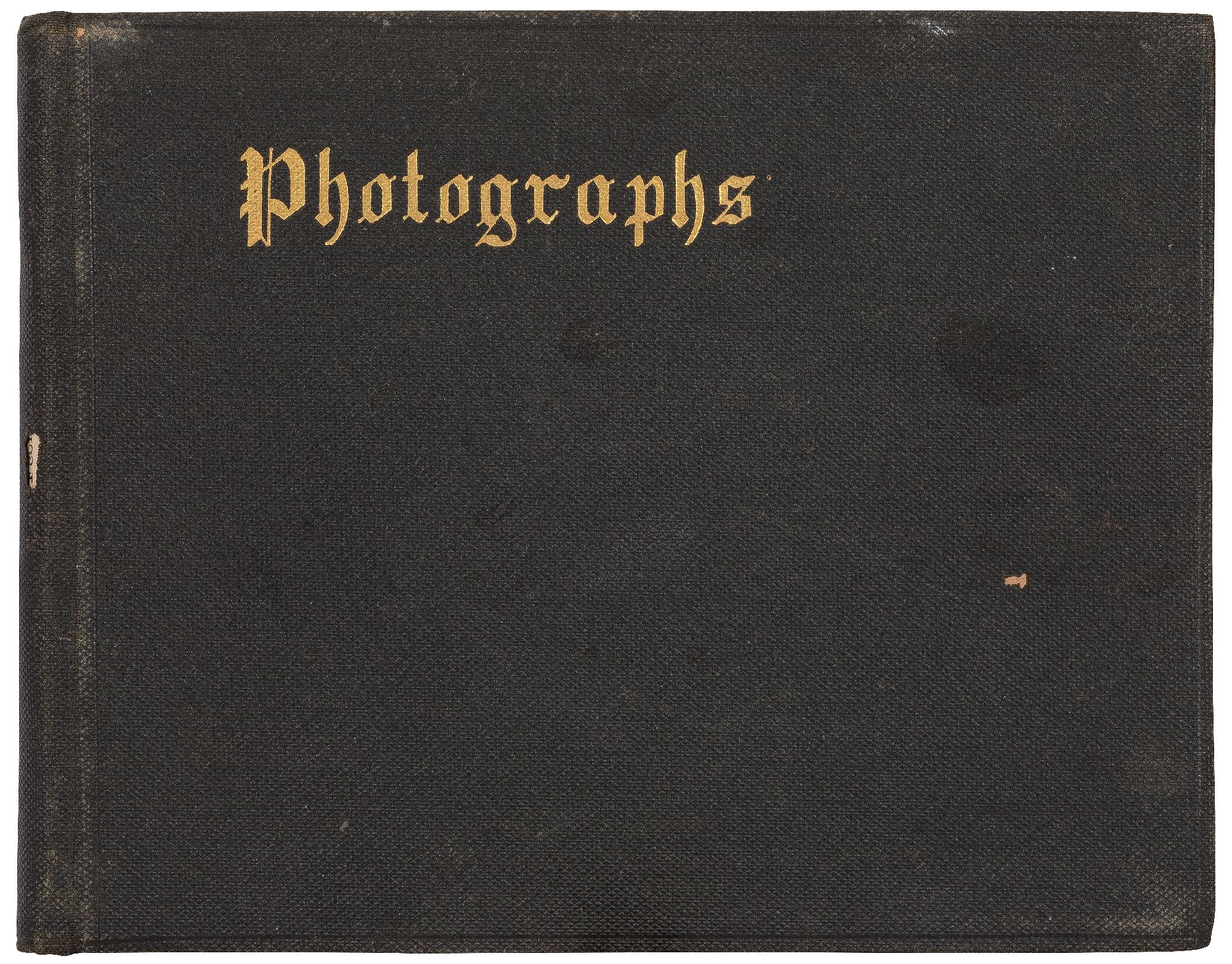 Massachusetts, 1900. Hardcover. Very Good. Oblong small octavo measuring 7" x 5.5". Black cloth over stiff paper boards with "photographs" stamped in gilt on the front board. Contains 19 sepia-toned albumen photographs measuring between 2.5" x 3.5" and 4" x 4" without captions. Very good album with some loose pages and worn edges with near fine photographs. A nice collection of turn-of-the-century photography depicting a Massachusetts family. The photos show shoreline scenes with two small children playing on a beach, ships out to sea, and landscape views. There are portrait photographs of the family posed by their family home, with their dog, and one of a woman on a bicycle.