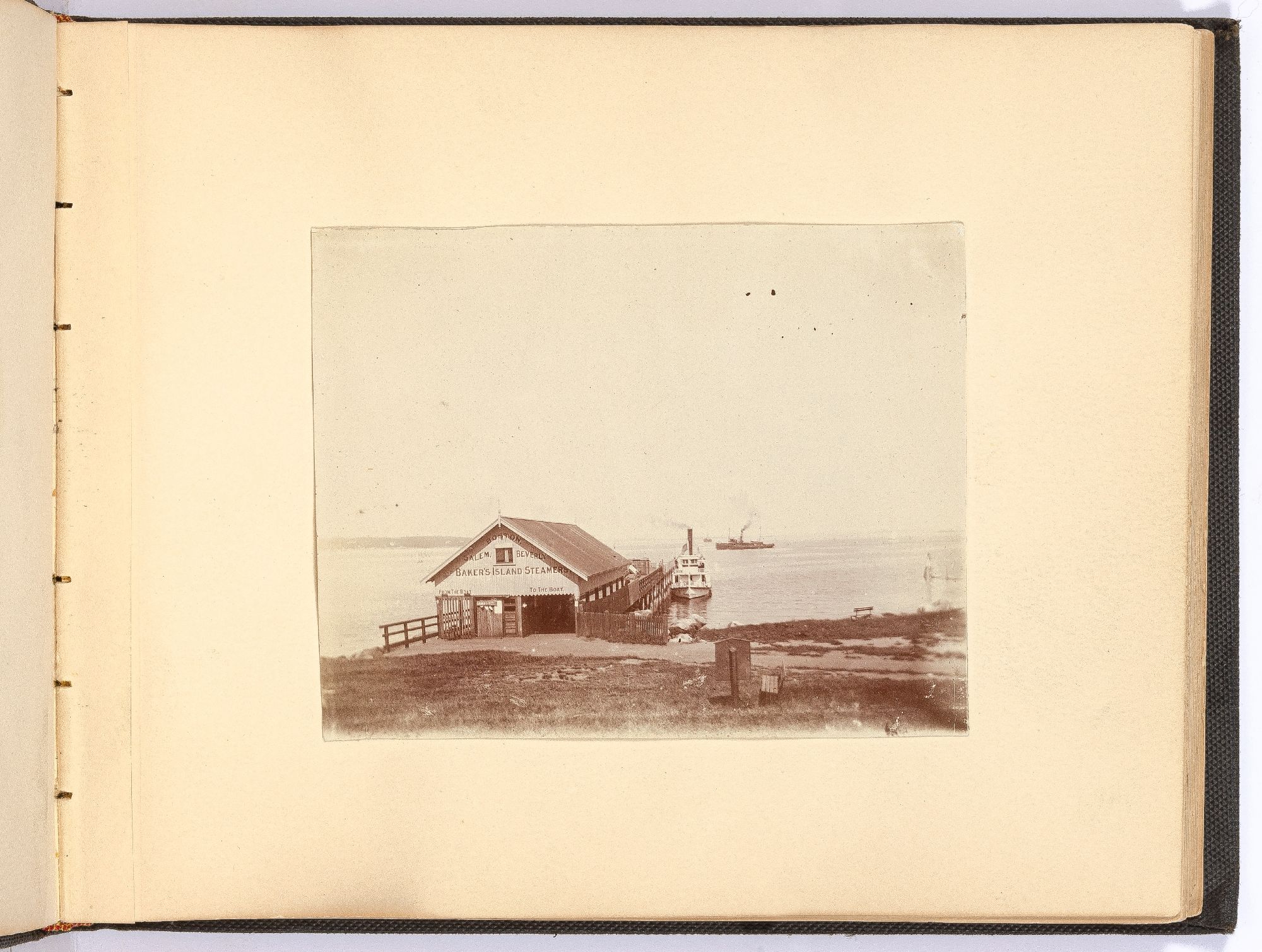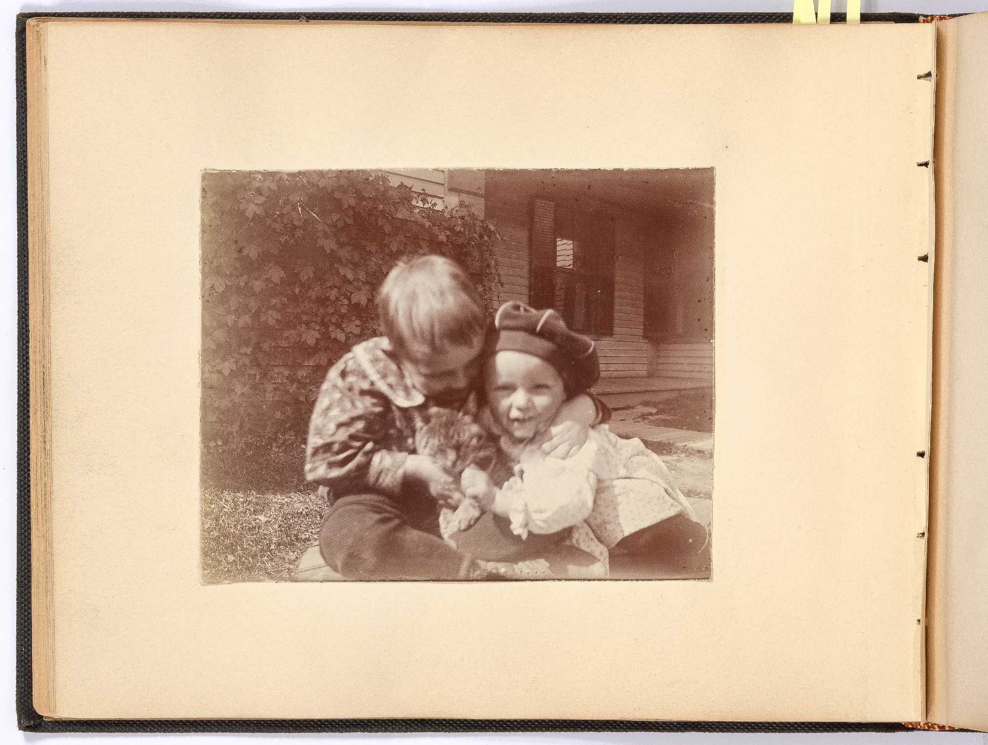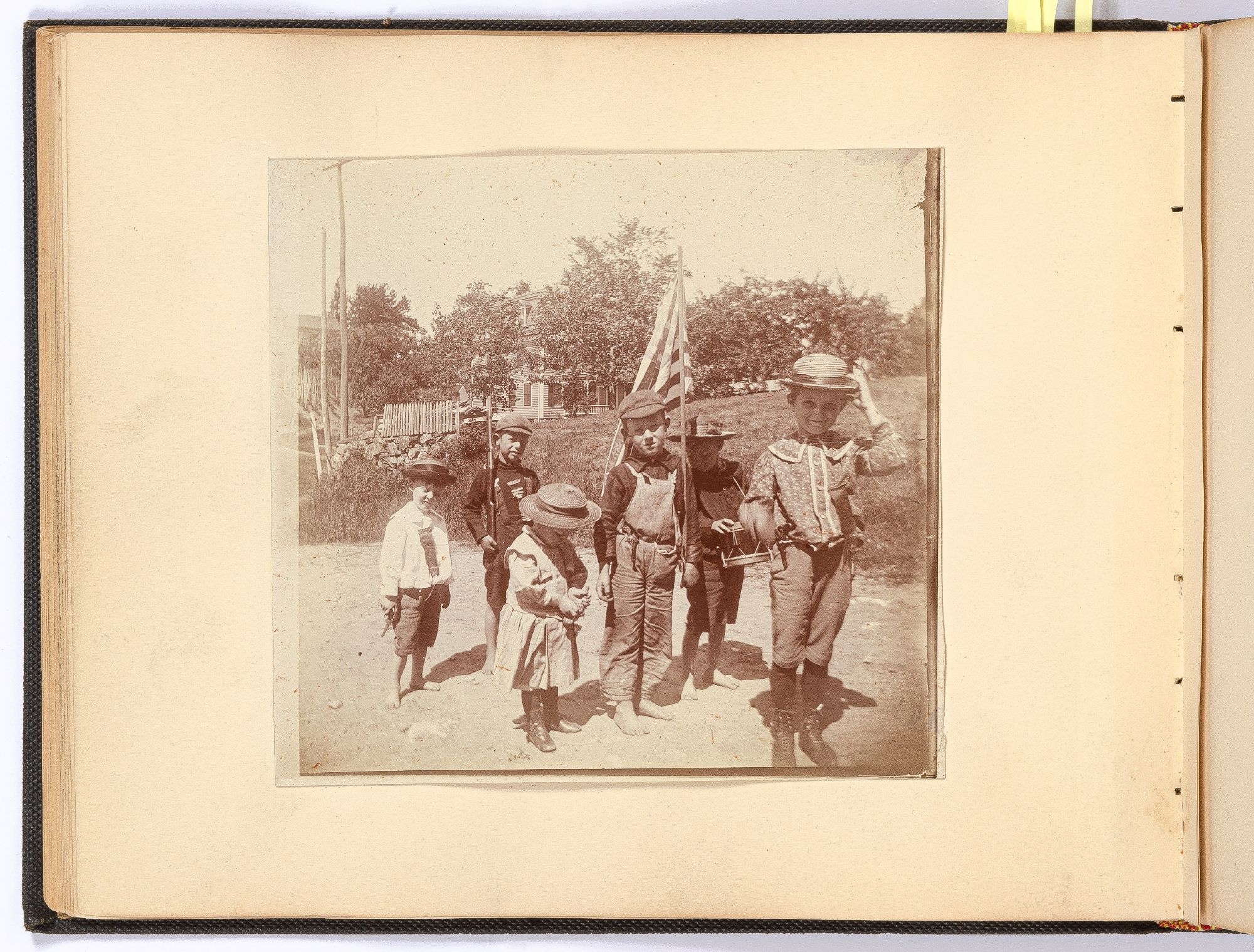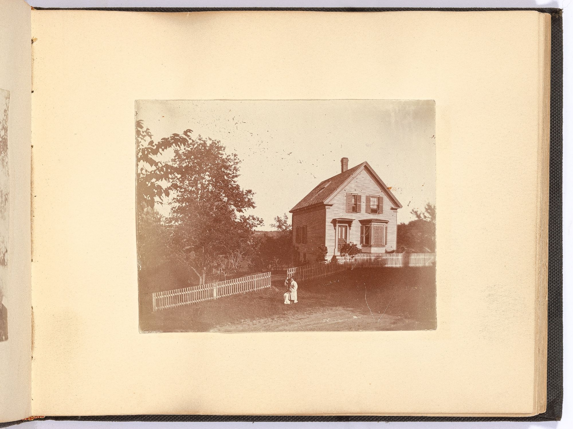 Massachusetts, 1900. Hardcover. Very Good. Oblong small octavo measuring 7" x 5.5". Black cloth over stiff paper boards with "photographs" stamped in gilt on the front board. Contains 19 sepia-toned albumen photographs measuring between 2.5" x 3.5" and 4" x 4" without captions. Very good album with some loose pages and worn edges with near fine photographs. A nice collection of turn-of-the-century photography depicting a Massachusetts family. The photos show shoreline scenes with two small children playing on a beach, ships out to sea, and landscape views. There are portrait photographs of the family posed by their family home, with their dog, and one of a woman on a bicycle.